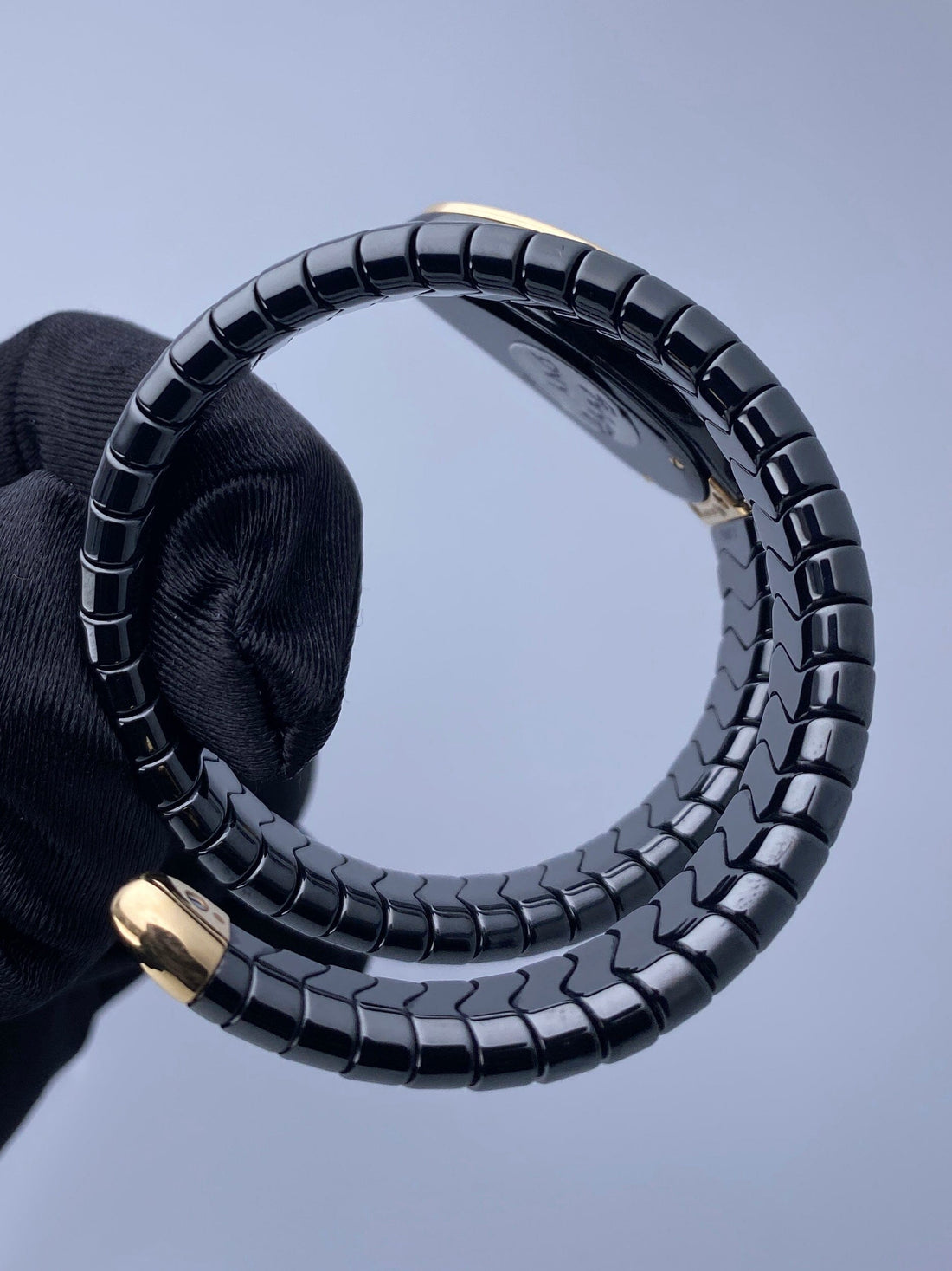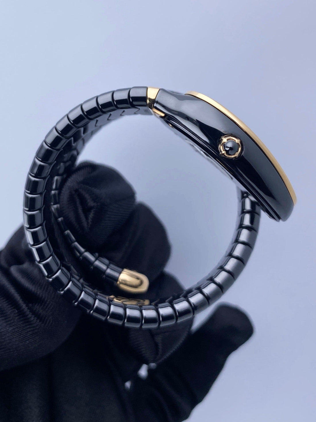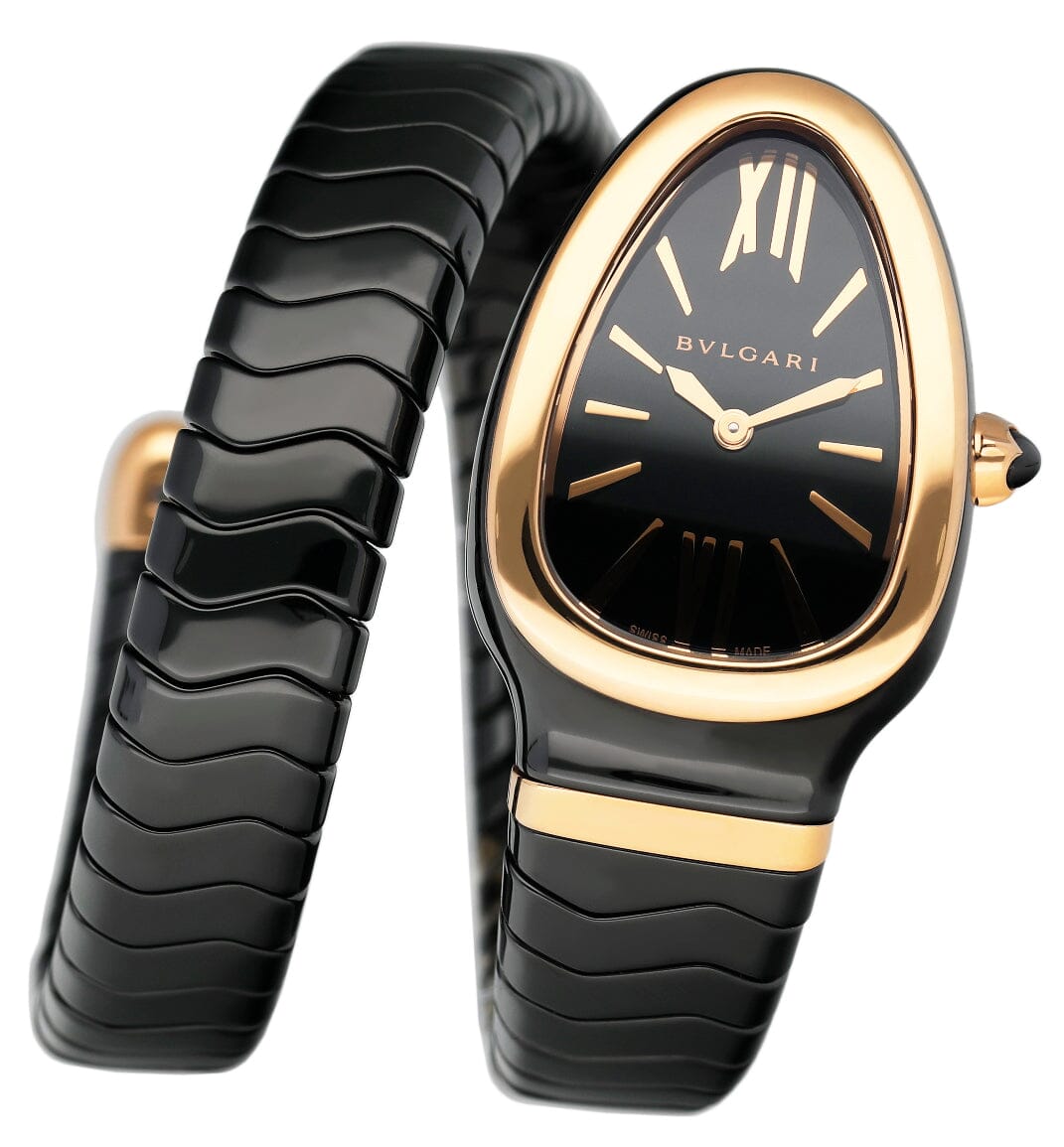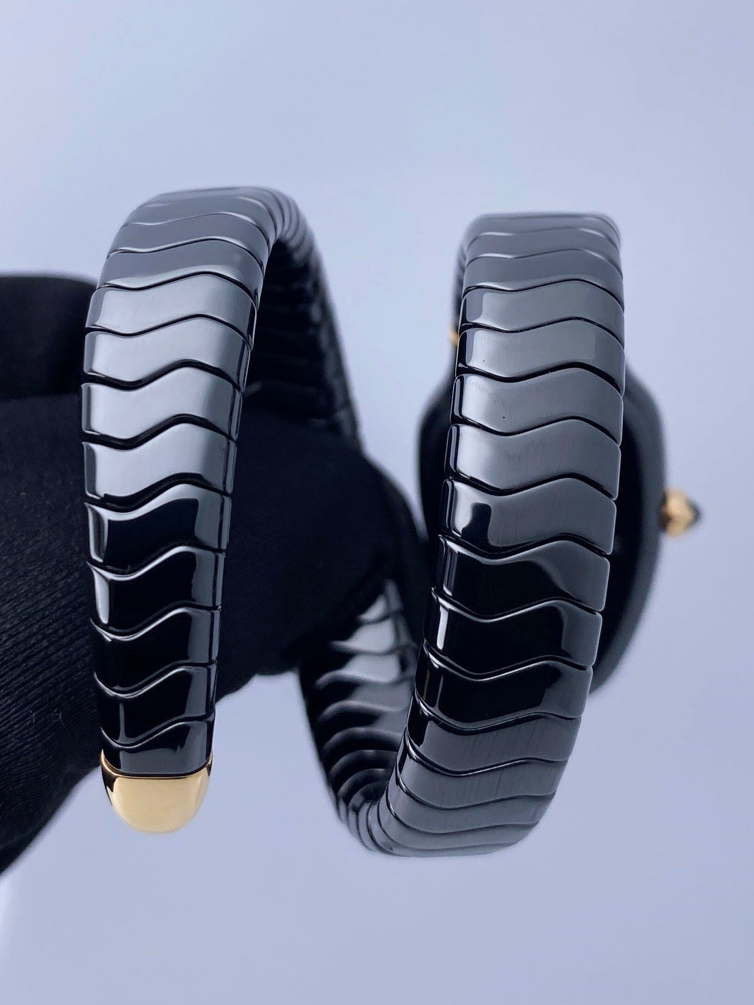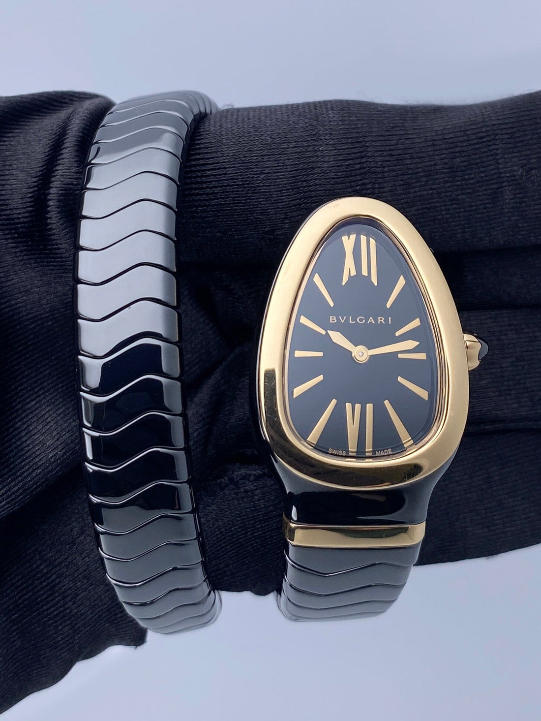Bvlgari Serpenti 102735 / SP C 35 B G Ladies Watch. 35mm ceramic case with 18K rose gold bezel. Black dial with rose gold hands and Roman numeral & index hour marker. Black ceramic serpent snake bracelet. Will fit up to between 6 to 7 inches, this design is flexible so will fit most wrists. Sapphire crystal. Ceramic case back. Quartz: battery powered movement.