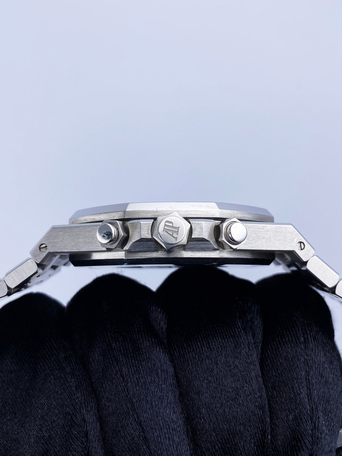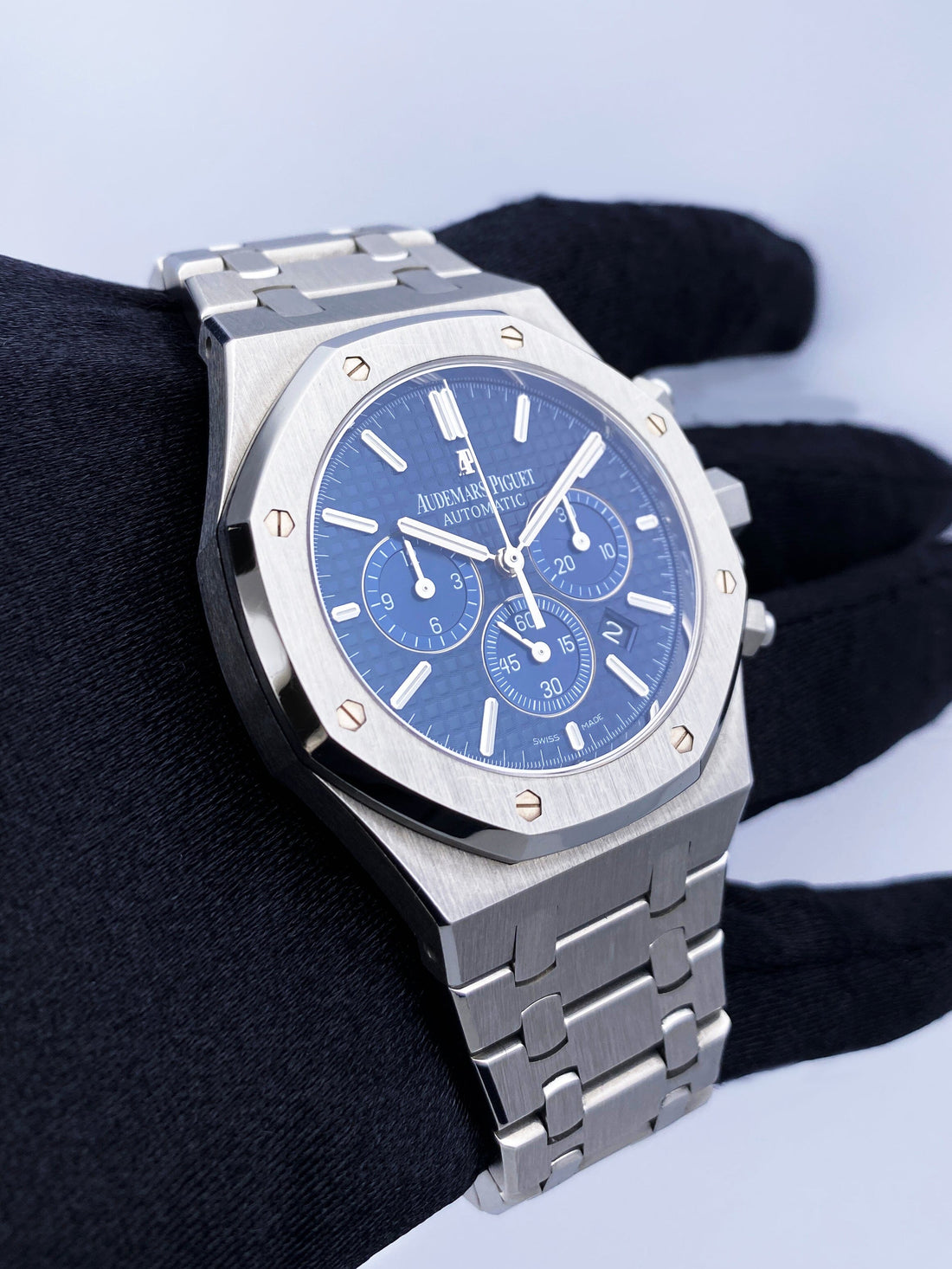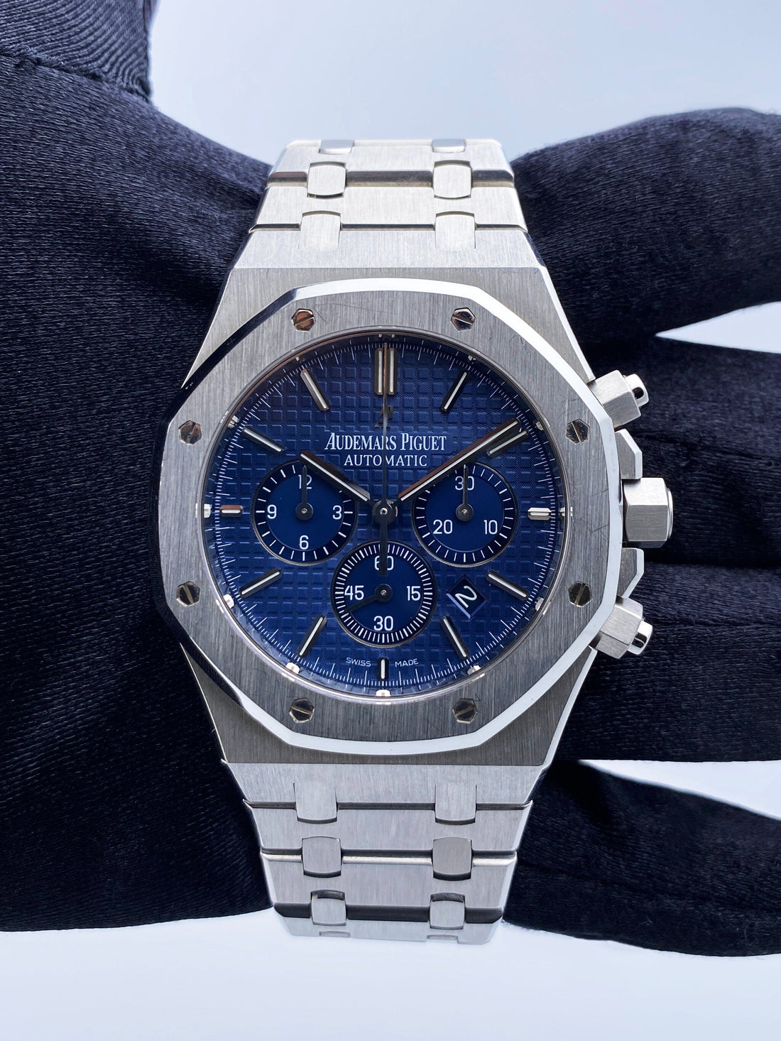 Audemars Piguet Royal Oak 26320ST.OO.1220ST.03 Mens Watch. 41mm stainless steel case with octagon shape bezel. Blue tapestry dial with steel luminous hands and index hour marker. Sub-dials: small second, minute and 12 hour. Date display between 4 & 5 o'clock position. Stainless steel bracelet with fold over clasp with double push button safety. Will fit up to 7.5-Inch wrist. Sapphire crystal. Stainless steel case back. Calibre 2385 automatic self-winding movement. This watch comes with original Box and Papers.