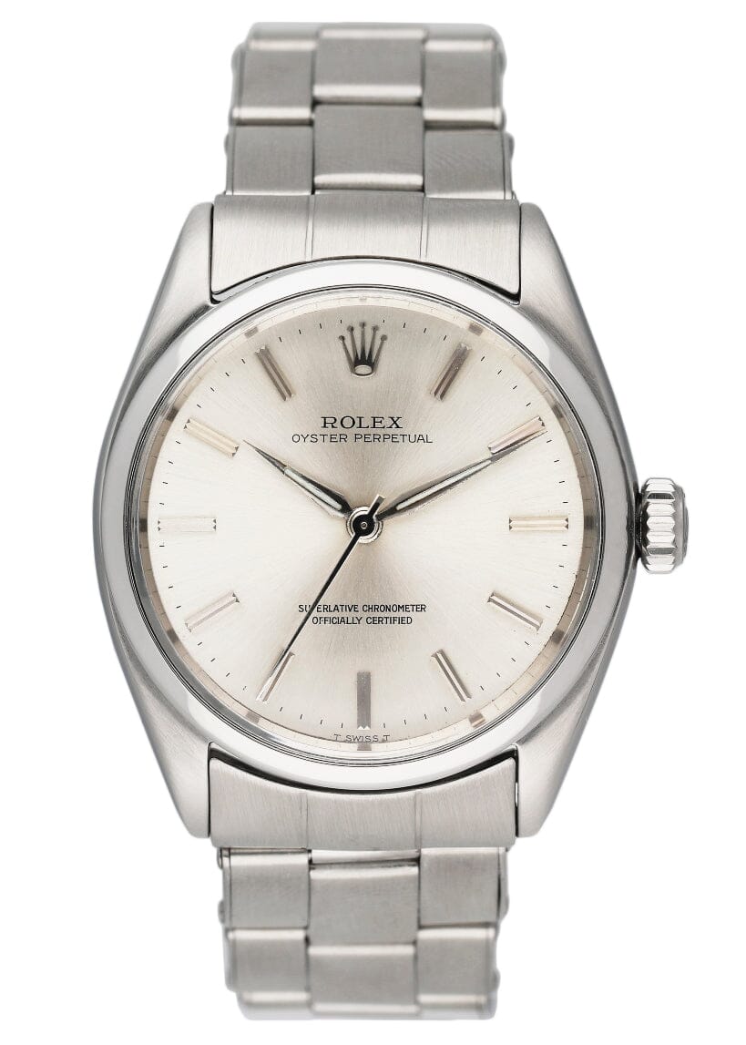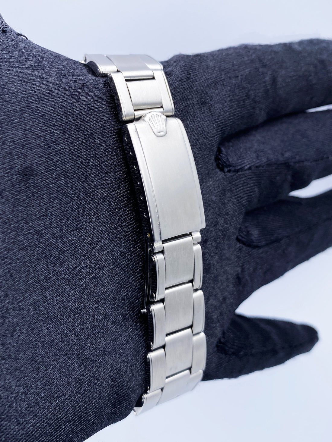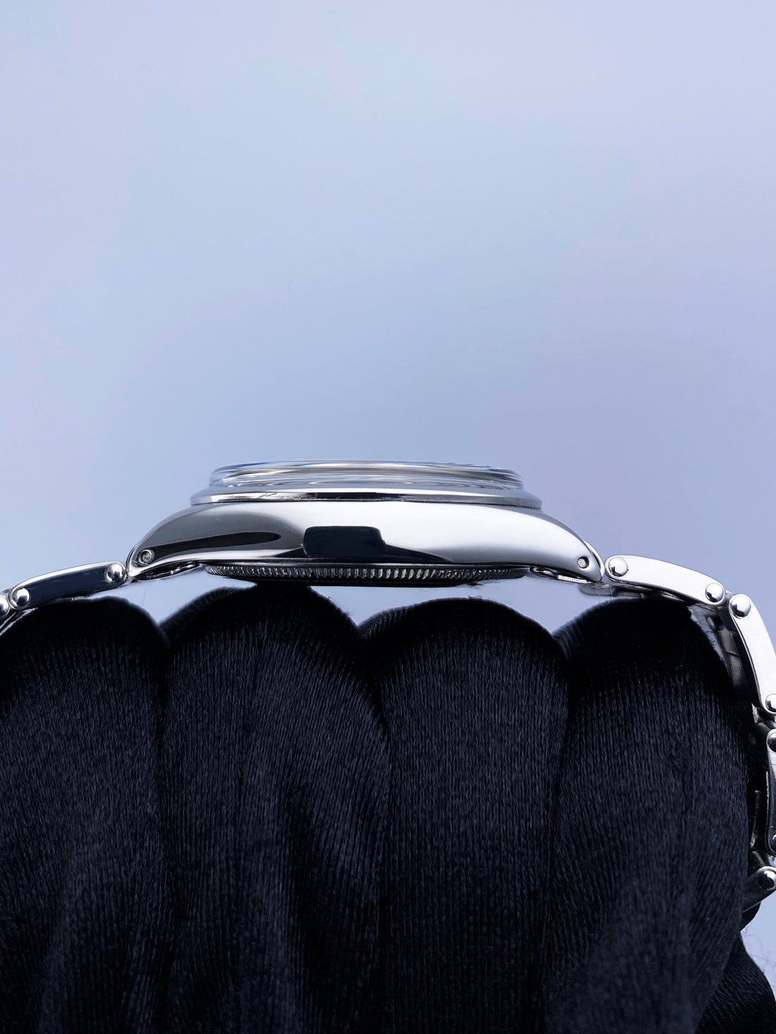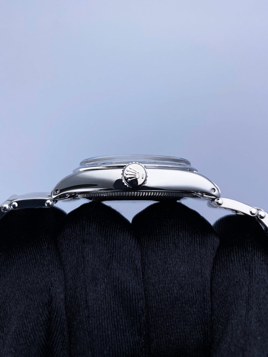 Rolex Oyster Perpetual Air-King 5500 Mens Watch. 34mm stainless steel case. Stainless steel smooth bezel. Silver dial with luminous steel hands and index hour markers. Stainless steel Jubilee bracelet with fold over clasp. Will fit up to a 6.5-inch wrist. Acrylic crystal. Stainless steel case back. Automatic self-winding movement.