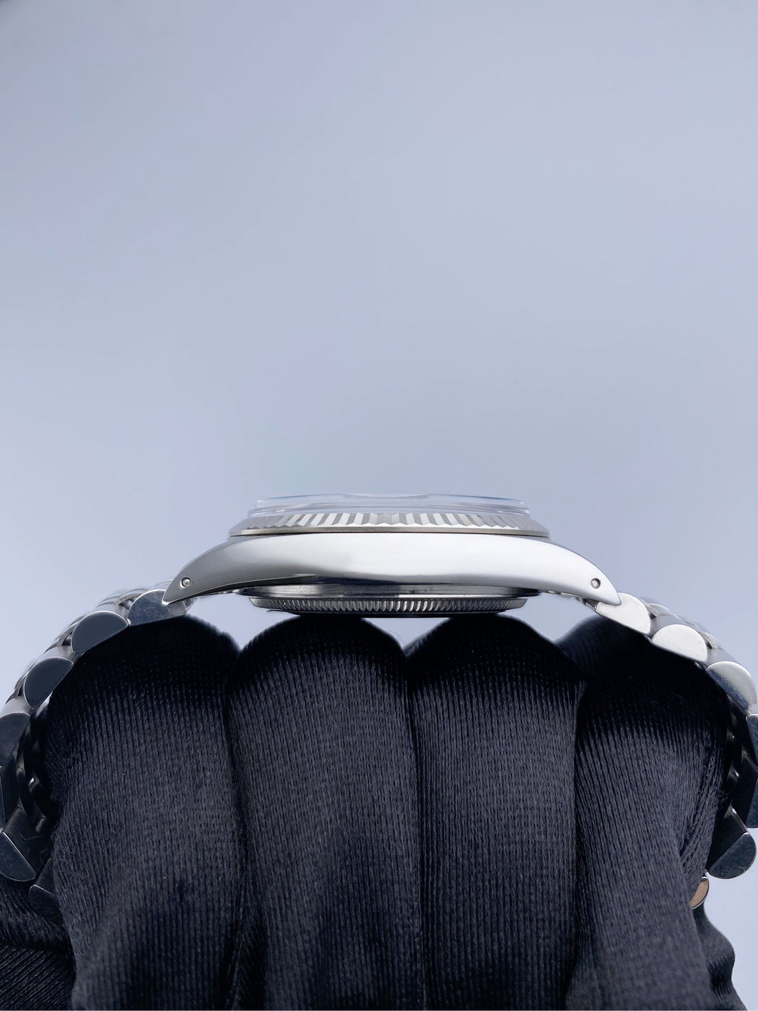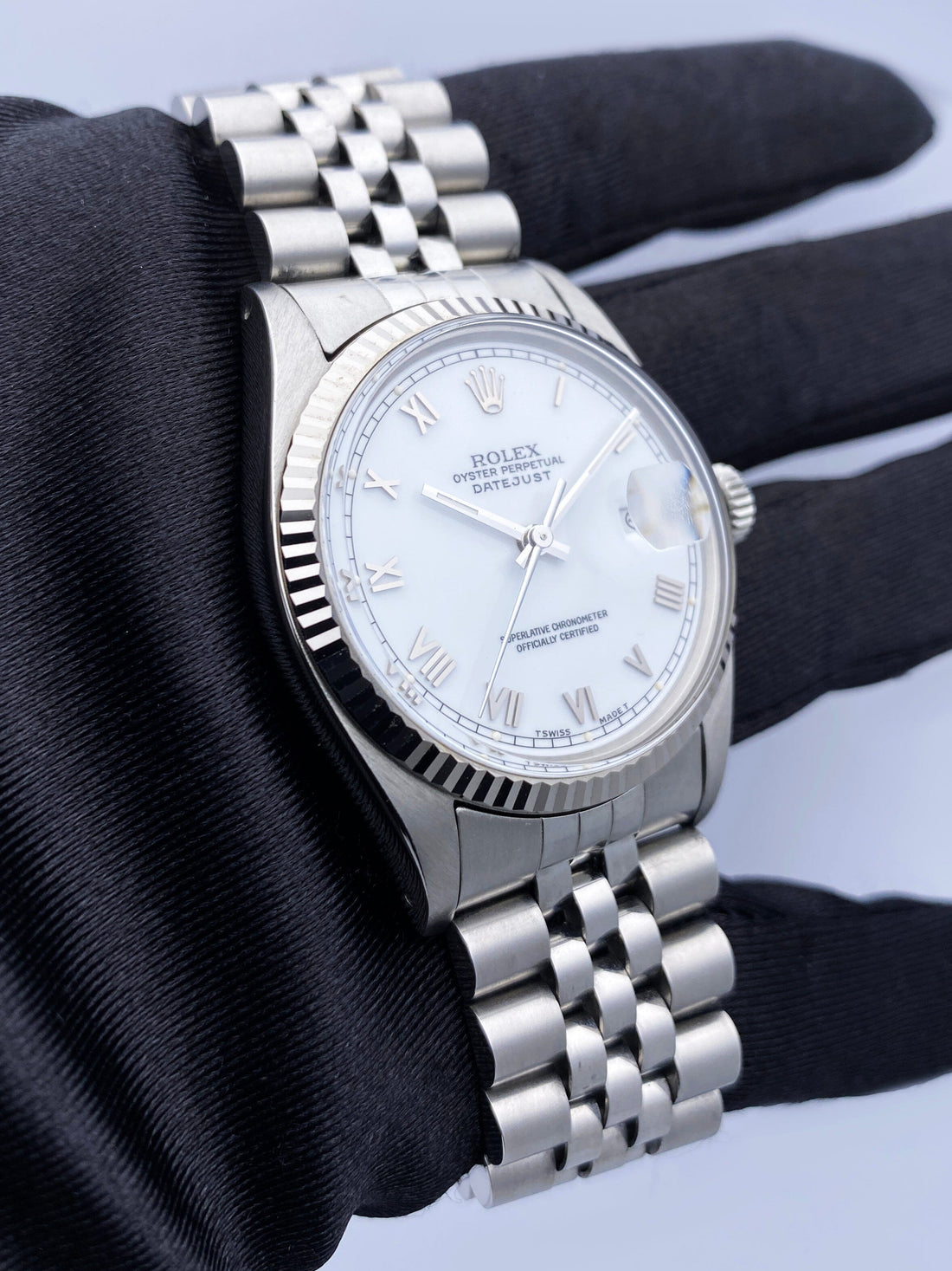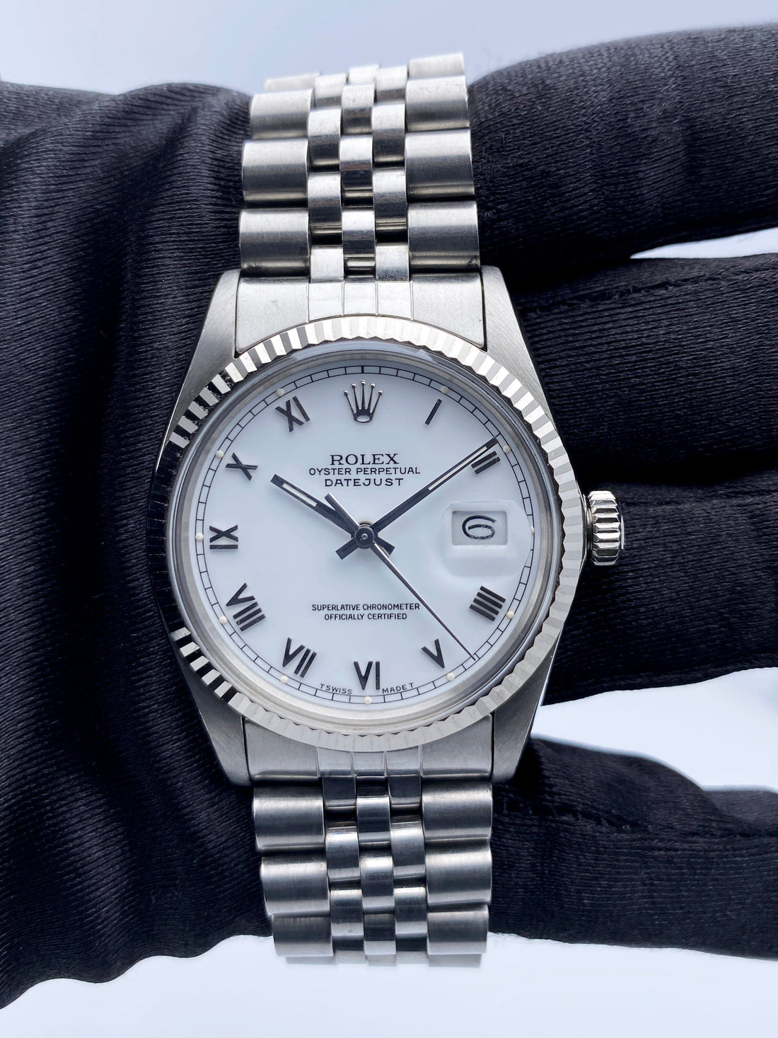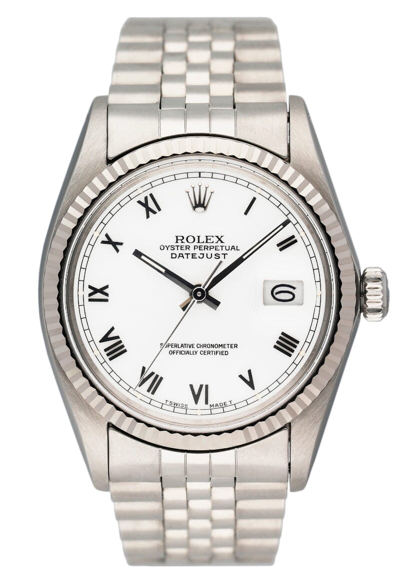 Rolex Oyster Perpetual Datejust 16014 Mens Watch. 36mm stainless steel case. 18K white gold fluted bezel. White Porcelain dial with steel hands and Roman numeral hour markers. Minute markers on the outer dial. Date display at the 3 o'clock position. Stainless steel Jubilee bracelet with fold over clasp. Will fit up to a 6.5-inch wrist. Acrylic crystal. Stainless steel case back. Automatic self-winding chronometer movement.