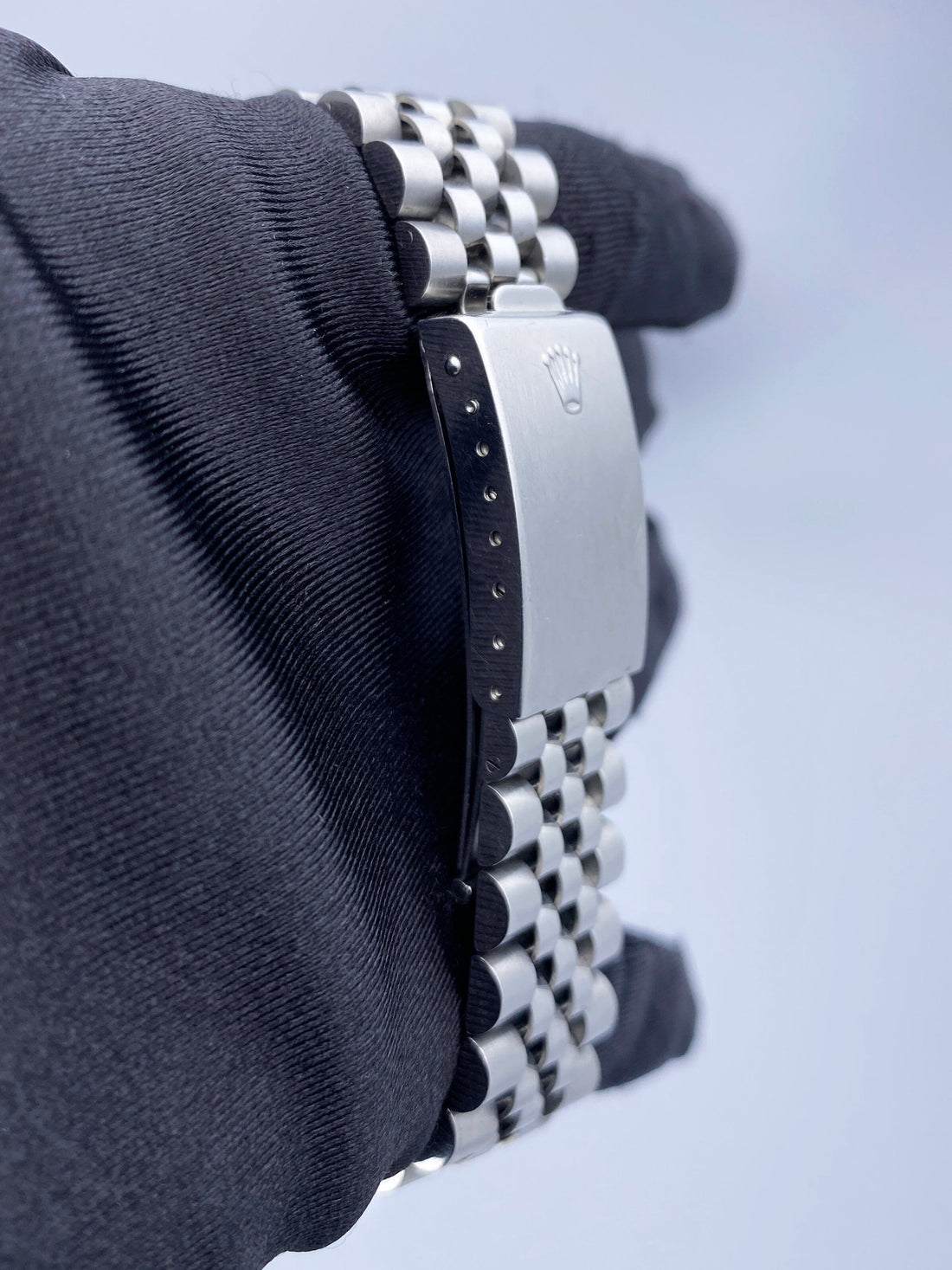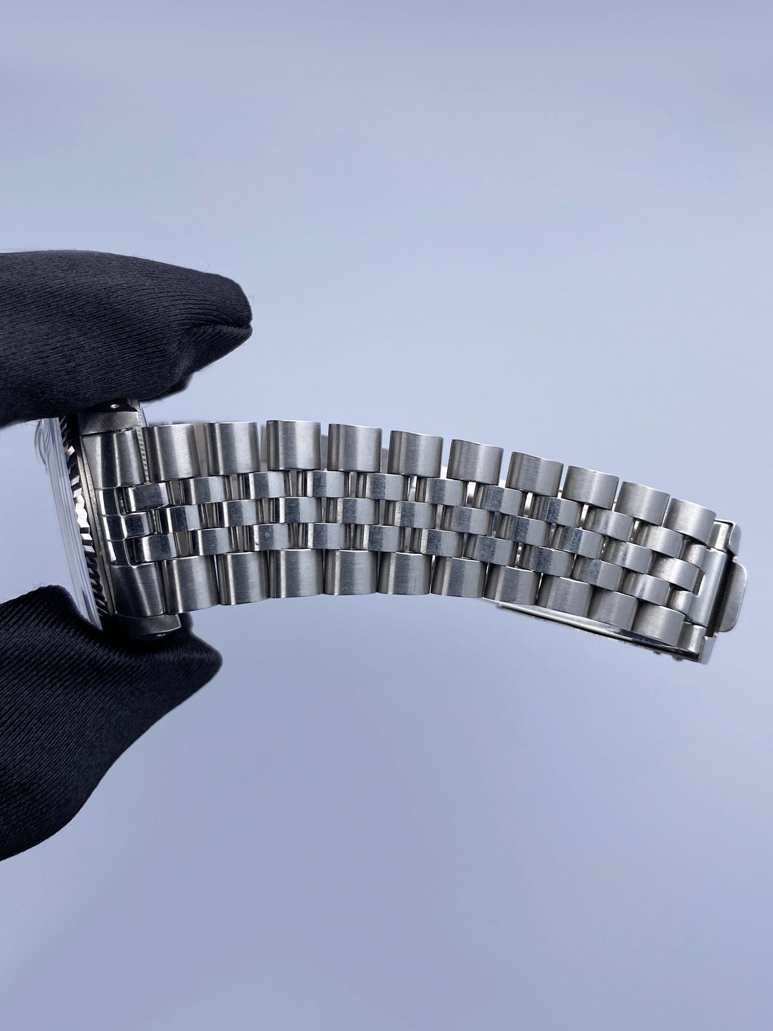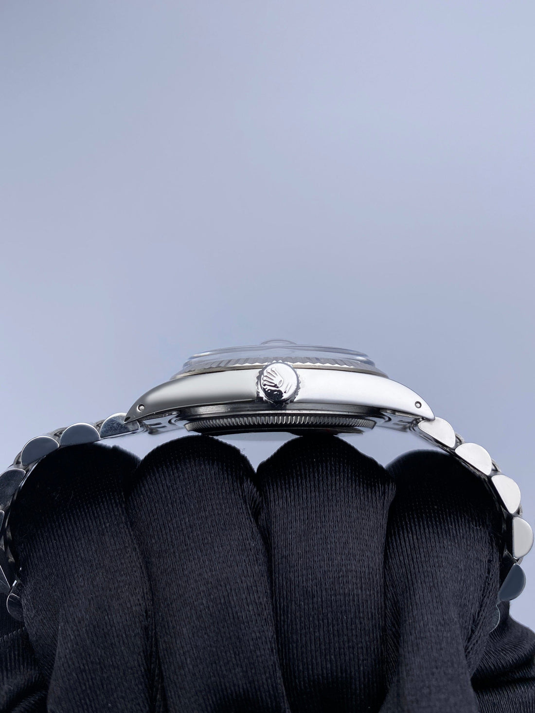 Rolex Oyster Perpetual Datejust 16014 Mens Watch. 36mm stainless steel case. 18K white gold fluted bezel. White Porcelain dial with steel hands and Roman numeral hour markers. Minute markers on the outer dial. Date display at the 3 o'clock position. Stainless steel Jubilee bracelet with fold over clasp. Will fit up to a 6.5-inch wrist. Acrylic crystal. Stainless steel case back. Automatic self-winding chronometer movement.