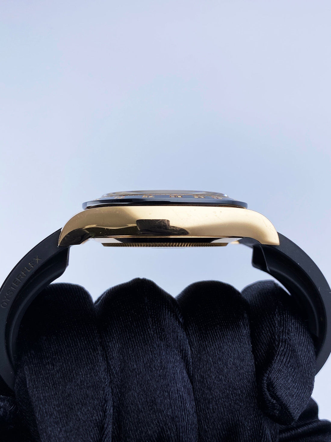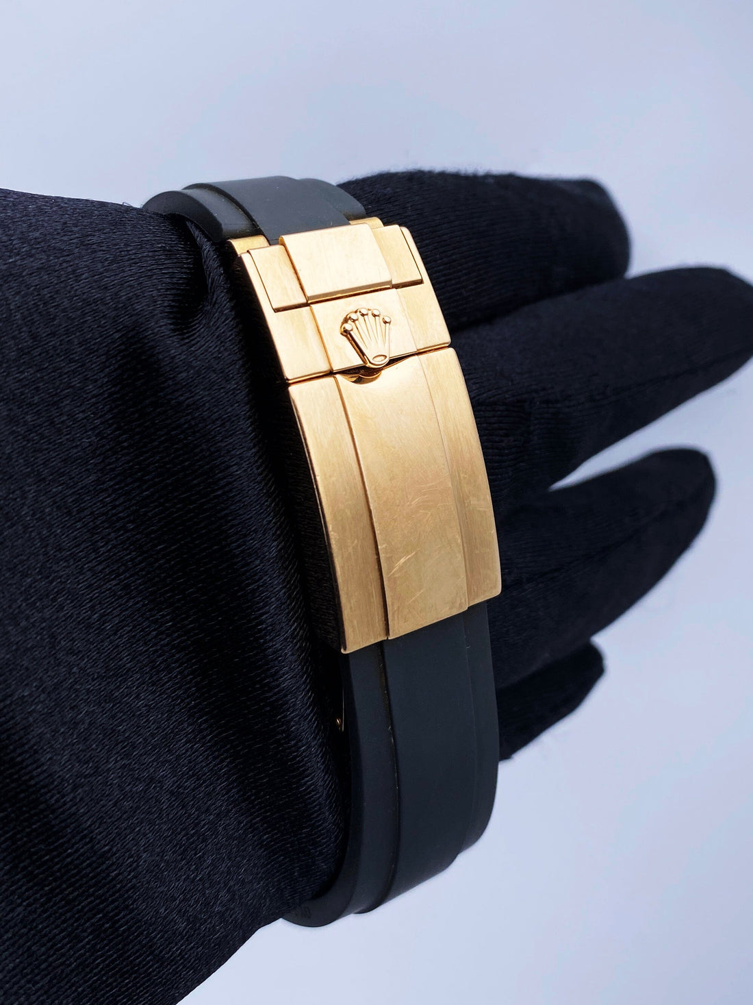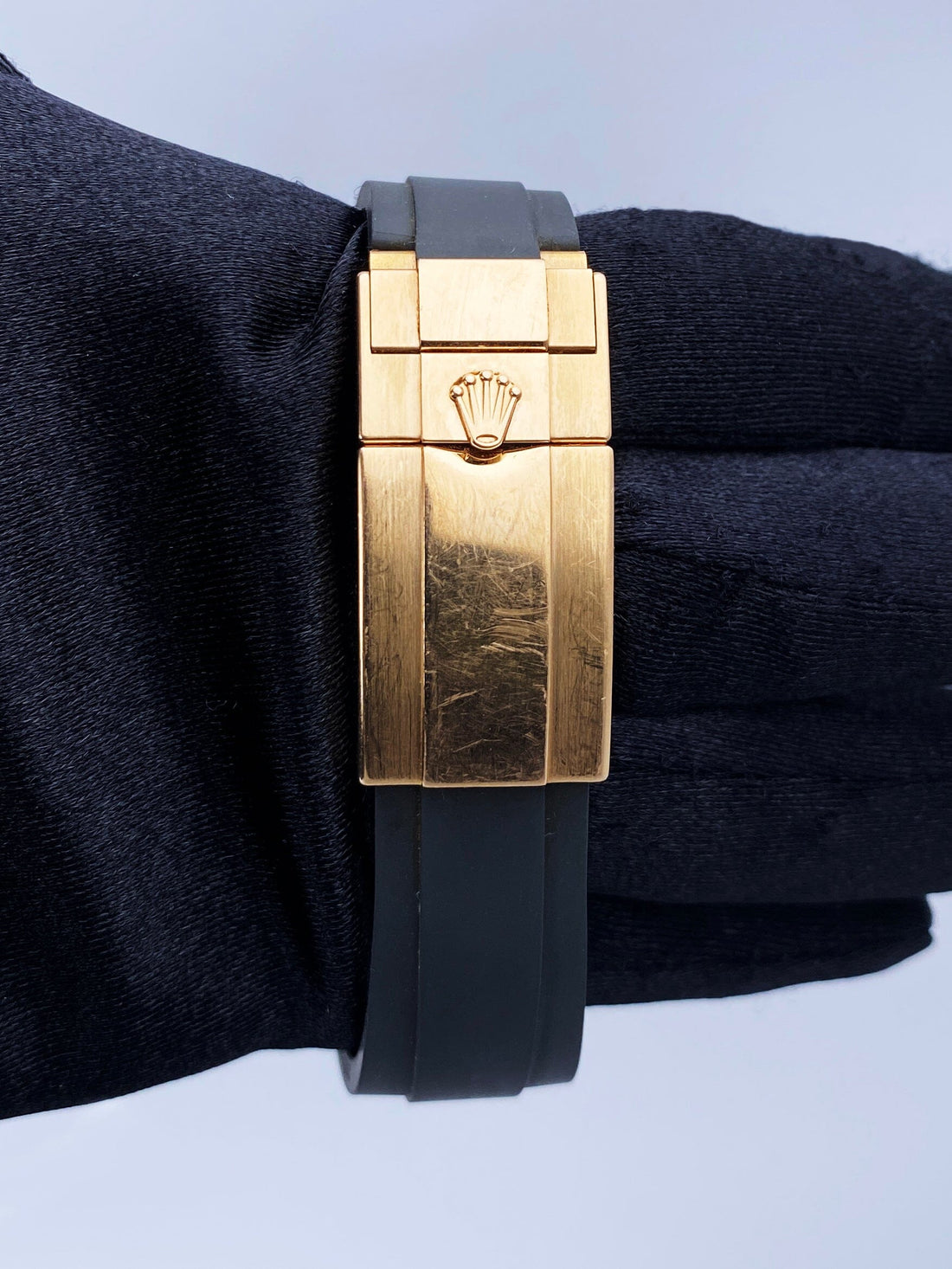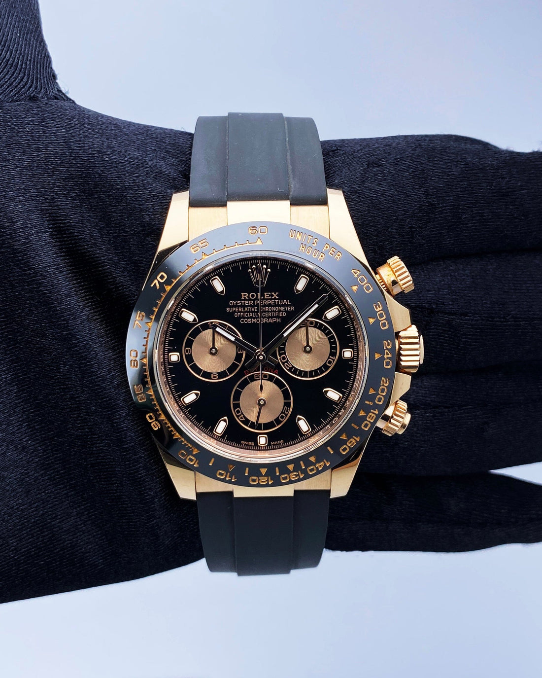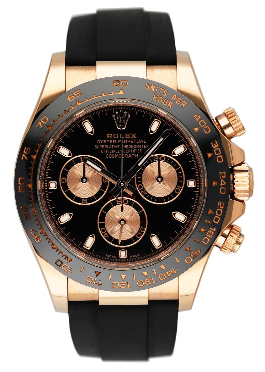 Rolex Daytona 116515LN Mens Watch. 40mm 18K rose gold case. Ceramic black bezel with tachymetric scale. Black dial with luminous hands and index hour marker. Three black sub-dials. Small seconds hand at 6 o'clock. 30-minute counter at 3 o'clock. 12-hour counter at 9 o'clock. Minute maker on the outer dial. Black rubber Oysterflex strap with fold over clasp with safety. Will fit up to 6.5-Inch wrist. Sapphire crystal. 18K rose gold case back. Automatic self-winding movement. This watch comes with original Box and Papers.