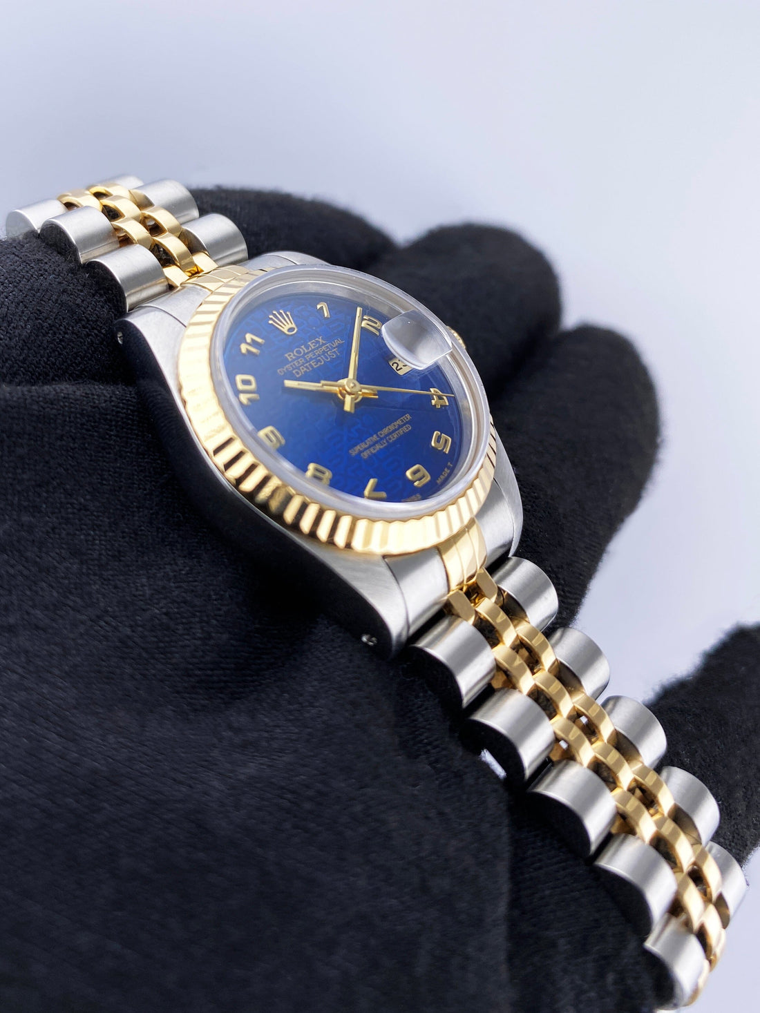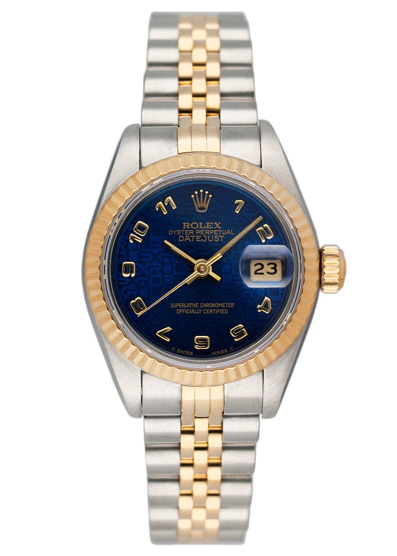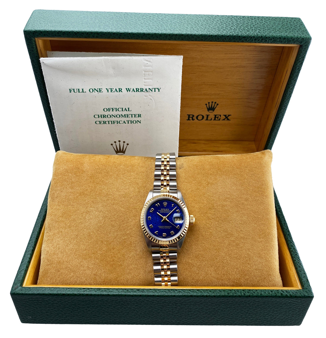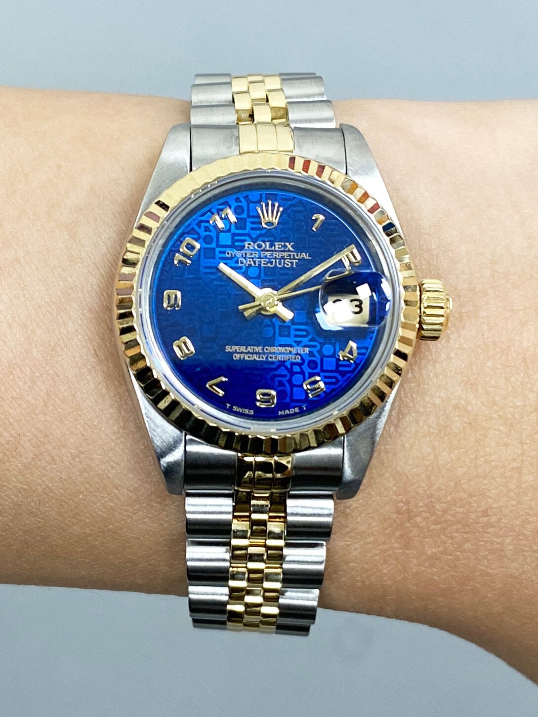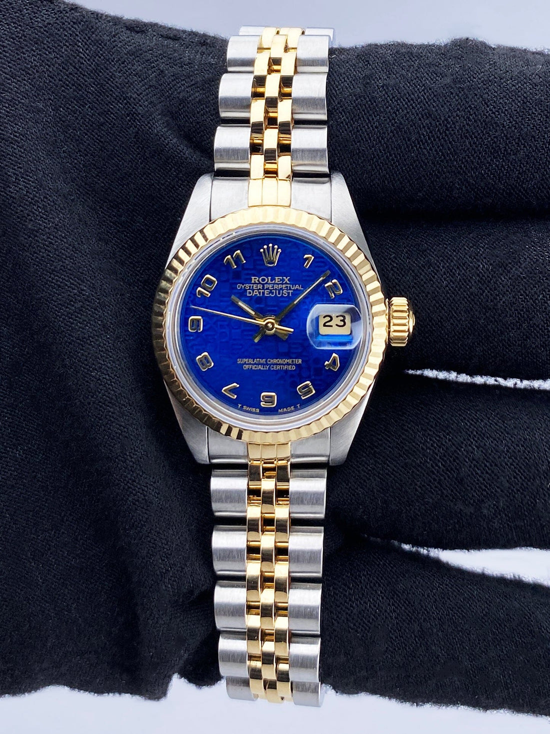 Rolex Datejust 69173 Ladies Watch. 26mm stainless steel case with 18K yellow gold fluted bezel. Blue Anniversary dial with gold hands and Arabic numeral hour markers. The date is displayed at the 3 o'clock position. Stainless steel & 18K yellow gold Jubilee bracelet with a fold-over clasp. Will fit up to a 6-inch wrist. Sapphire crystal. Stainless steel case back. Automatic self-winding chronometer movement. This watch comes with the original Box and Papers.
