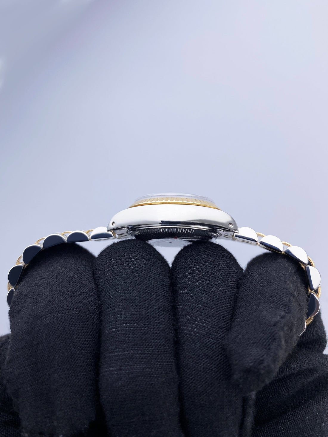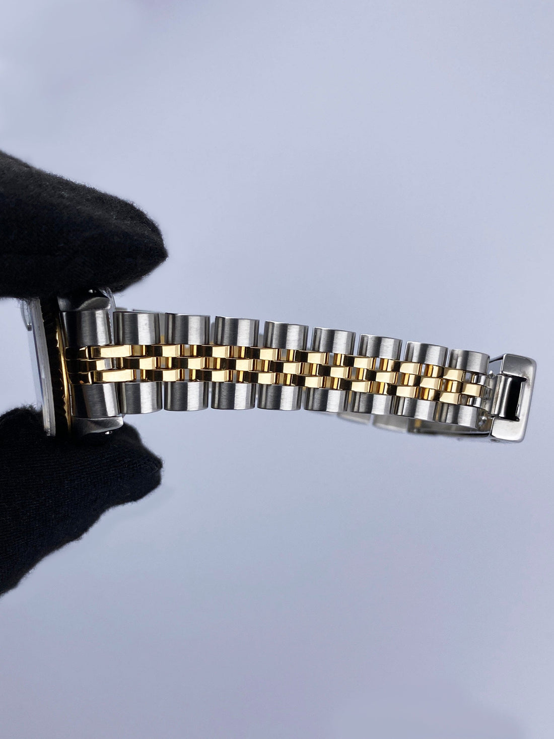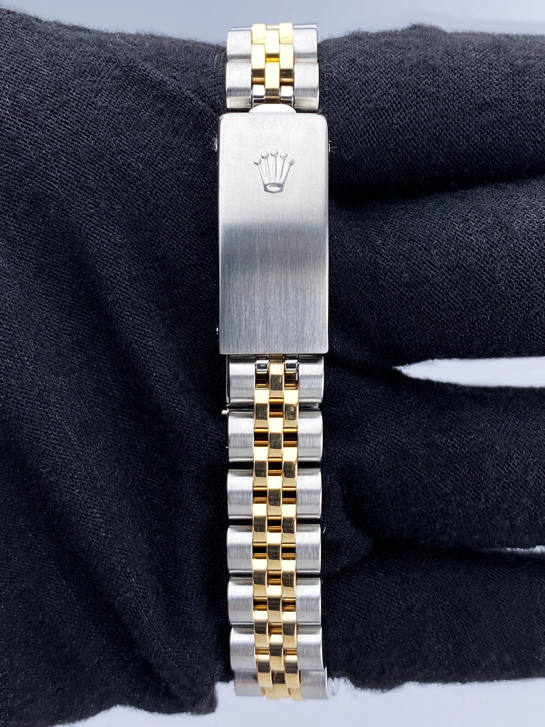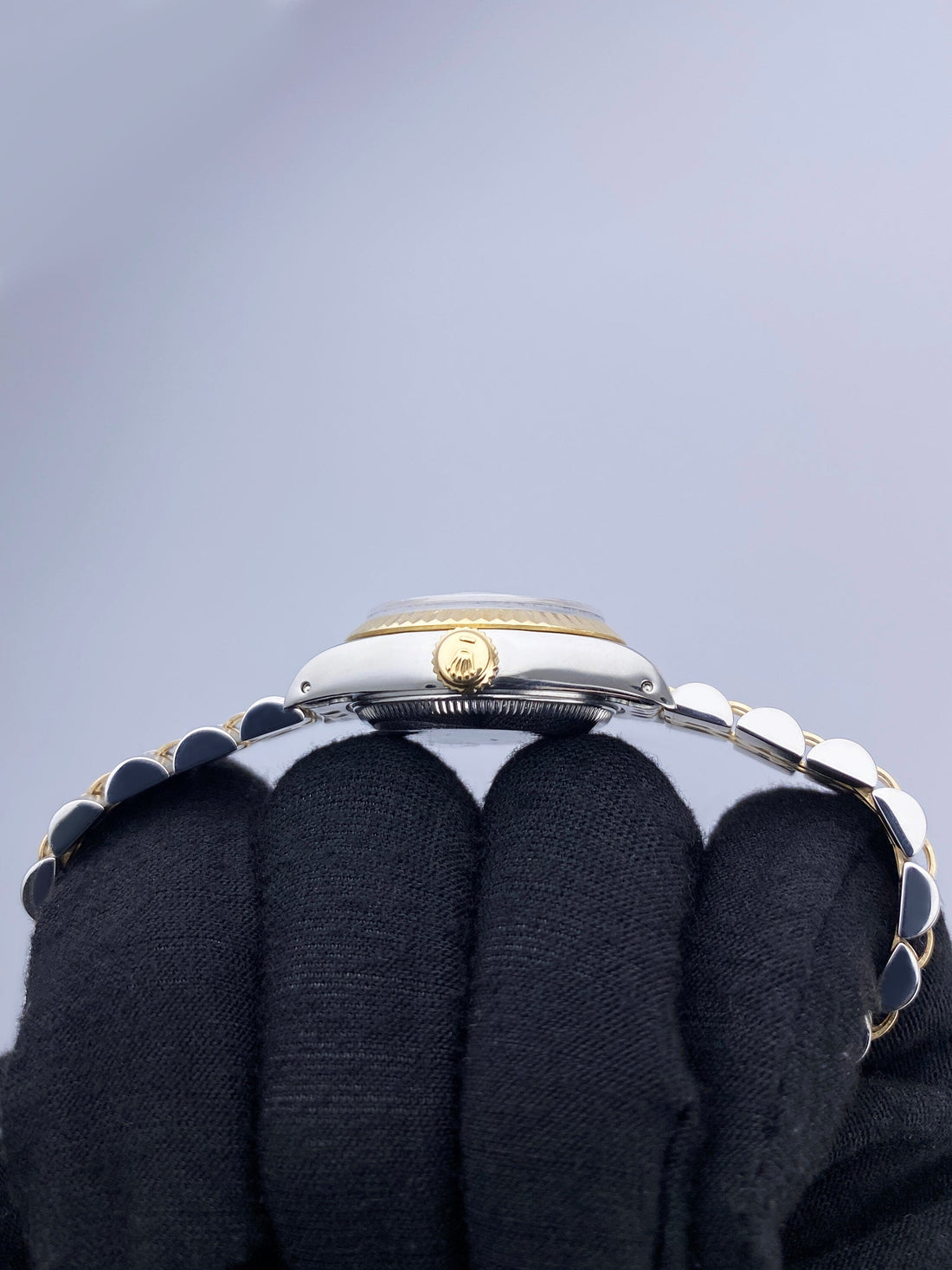 Rolex Datejust 69173 Ladies Watch. 26mm stainless steel case with 18K yellow gold fluted bezel. Blue Anniversary dial with gold hands and Arabic numeral hour markers. The date is displayed at the 3 o'clock position. Stainless steel & 18K yellow gold Jubilee bracelet with a fold-over clasp. Will fit up to a 6-inch wrist. Sapphire crystal. Stainless steel case back. Automatic self-winding chronometer movement. This watch comes with the original Box and Papers.