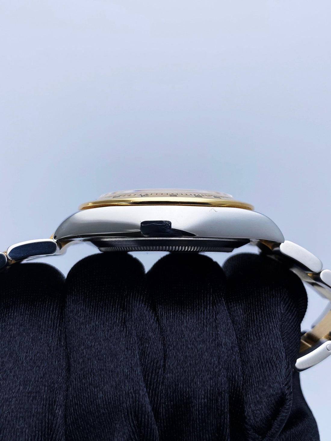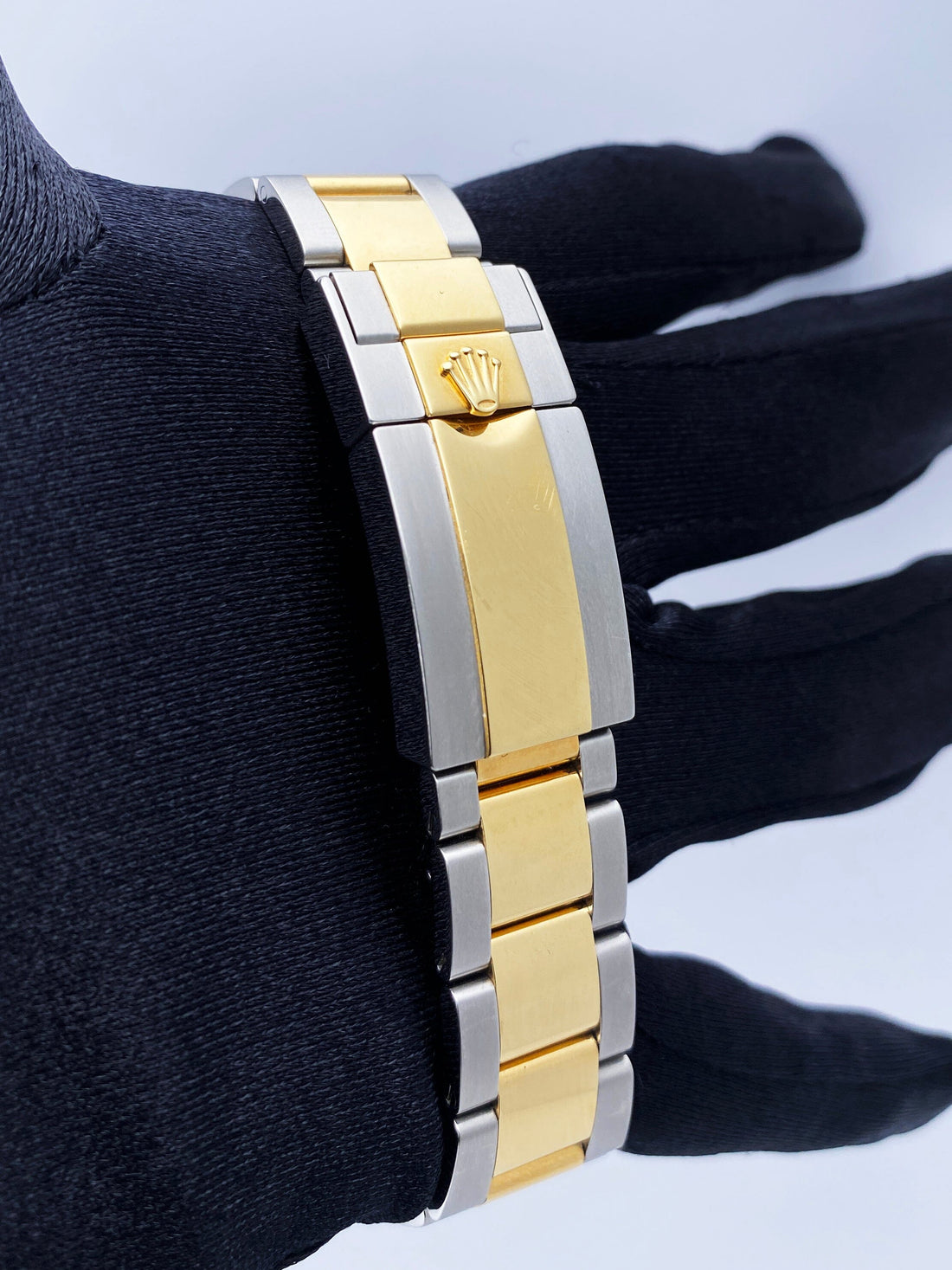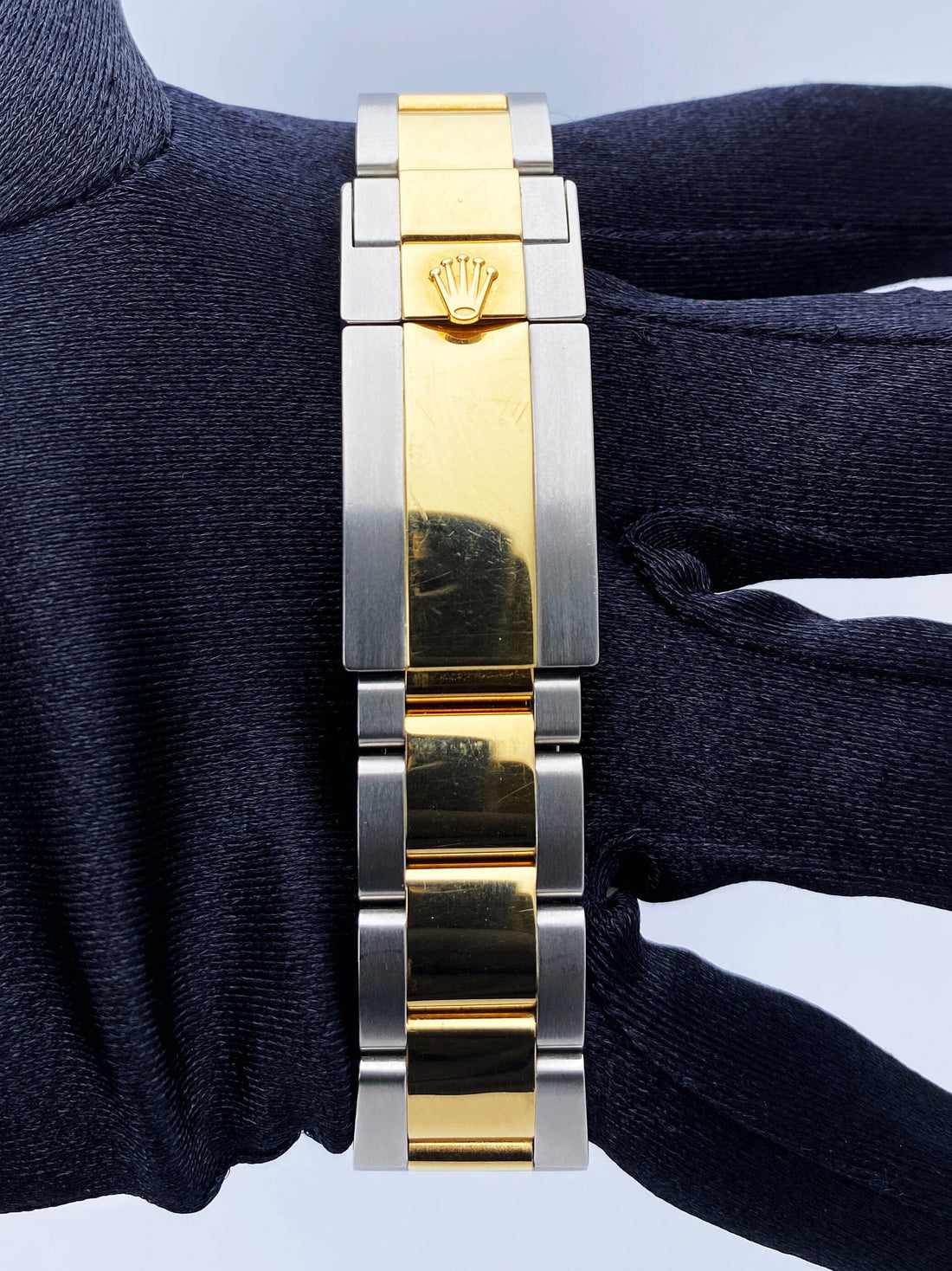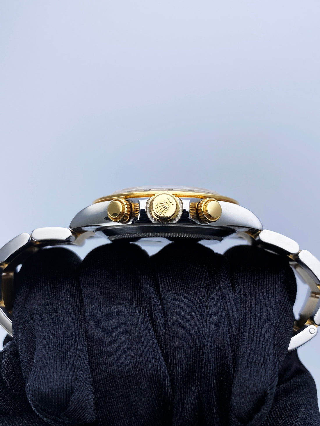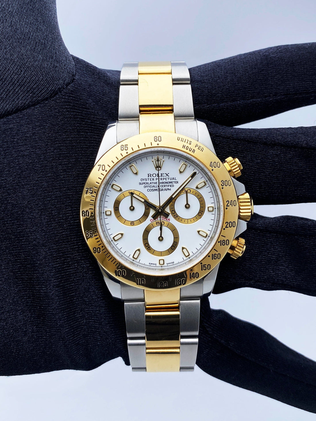 Rolex Oyster Perpetual Daytona 116523 Mens Watch. 40mm stainless steel case with 18K yellow gold tachymeter bezel. White dial with gold hands and index hour marker. Three sub-dials. Small seconds hand at 6 o'clock. 30-minute counter at 3 o'clock. 12-hour counter at 9 o'clock. Minute maker on the outer dial. Stainless steel and 18K yellow gold Oyster bracelet with fold over clasp with safety. Will fit up to 7-Inch wrist. Sapphire crystal. Stainless steel case back. Automatic self-winding movement.
