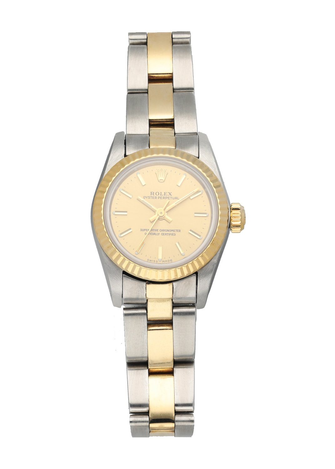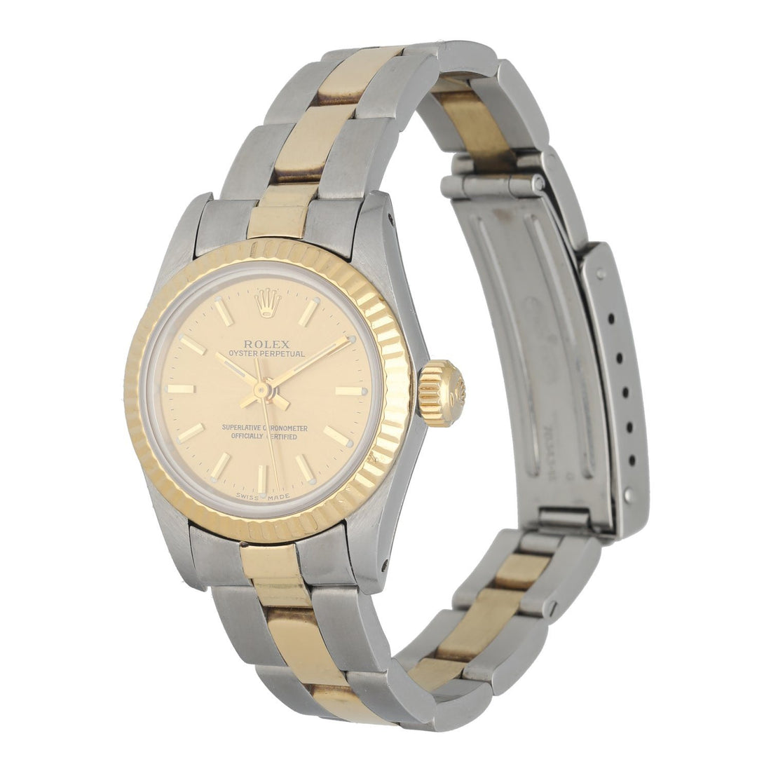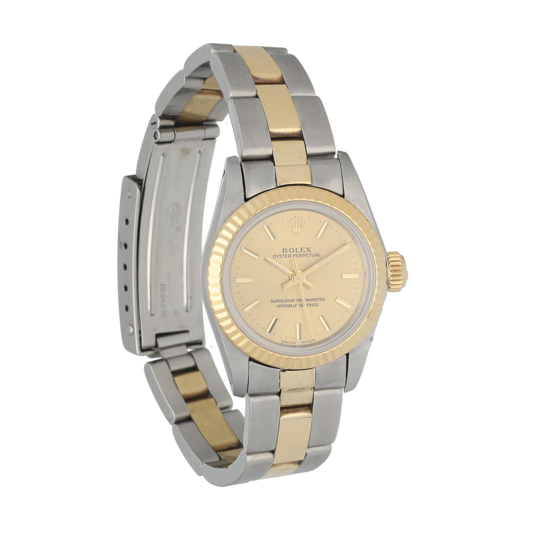 Rolex Oyster Perpetual 67193 Ladies Watch. 24 mm stainless steel case. 18k yellow gold fluted bezel. Champagne dial with yellow gold hands and index hour markers. Yellow gold and stainless steel oyster bracelet with a stainless-steel fold-over clasp. Will fit up to a 6 -inch wrist. Sapphire crystal, solid case back. Automatic self-winding caliber 2130 movement featuring a 42-hour power reserve. Circa 1988. Original box and papers included This watch is backed by a two year warranty.