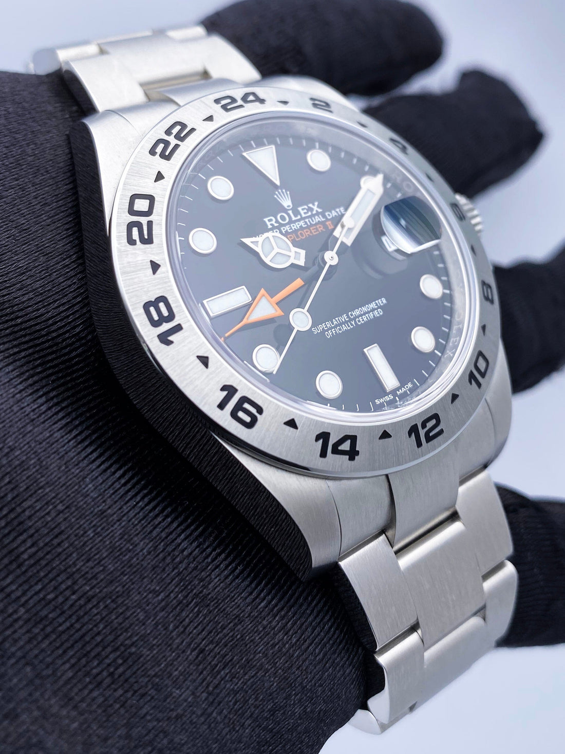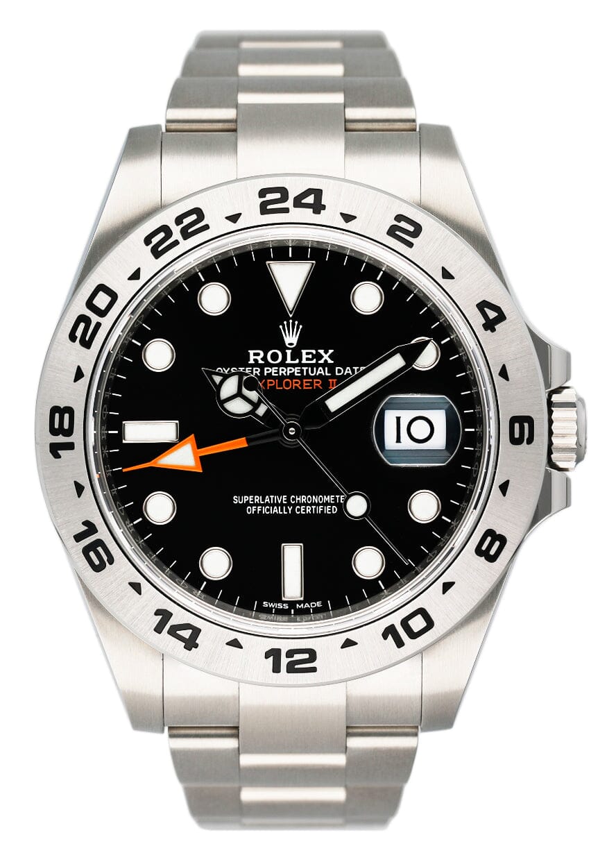 Rolex Oyster Perpetual Explorer II 216570 Mens Watch. 42mm stainless steel case. Stainless steel bezel with black Arabic numerals bezel insert. Black dial with steel luminous hands and index hour markers. Magnified date display at 3 o'clock position. Stainless steel oyster bracelet with fold over clasp with safety. Will fit up to a 7-inch wrist. Water resistant. Calibre 3187 automatic self-winding movement with a 50-hour power reserve. Sapphire crystal. This watch comes with Box and Papers.