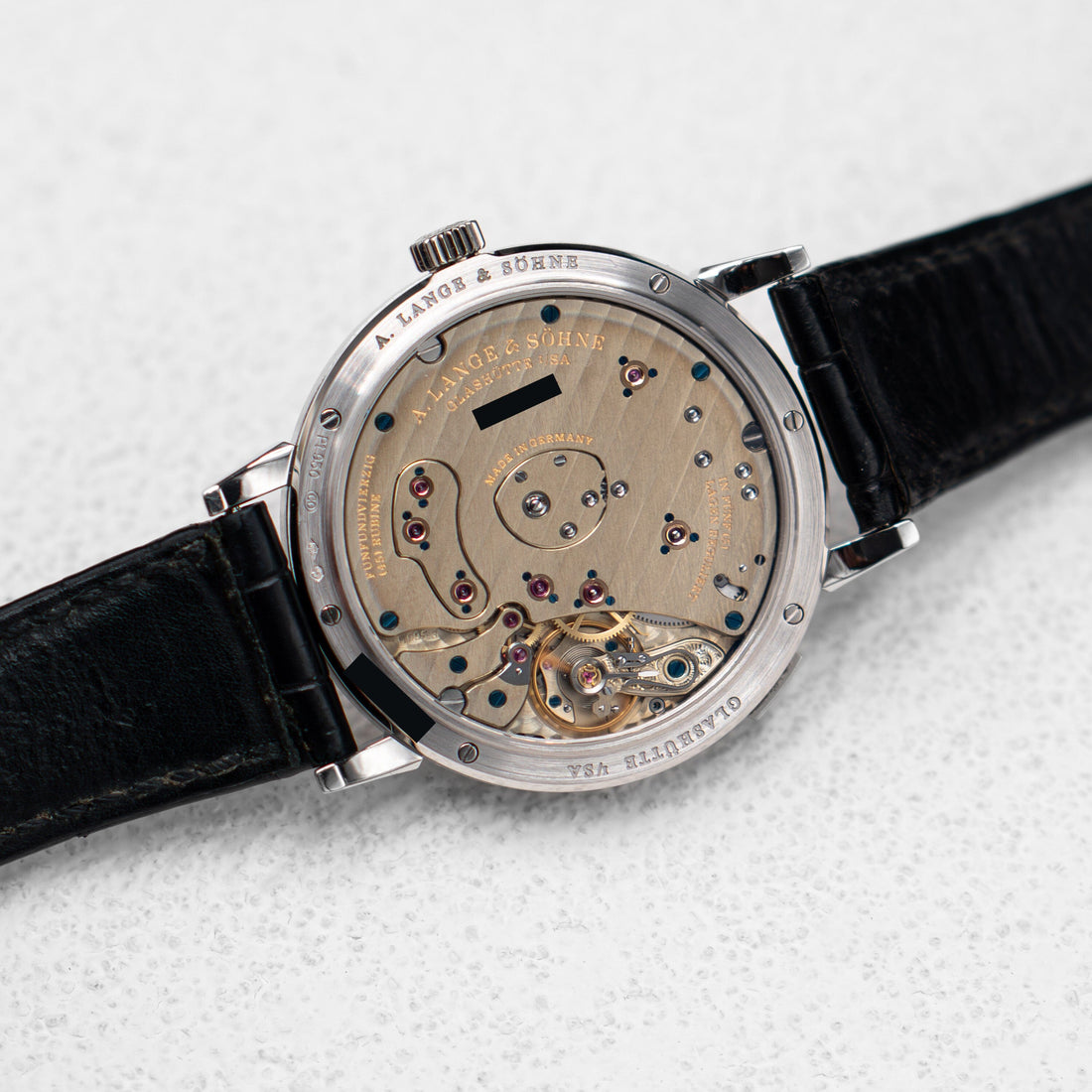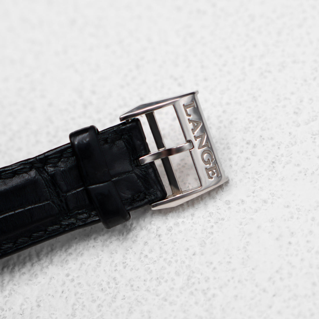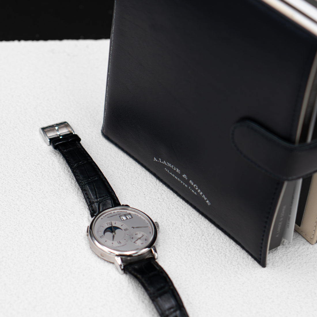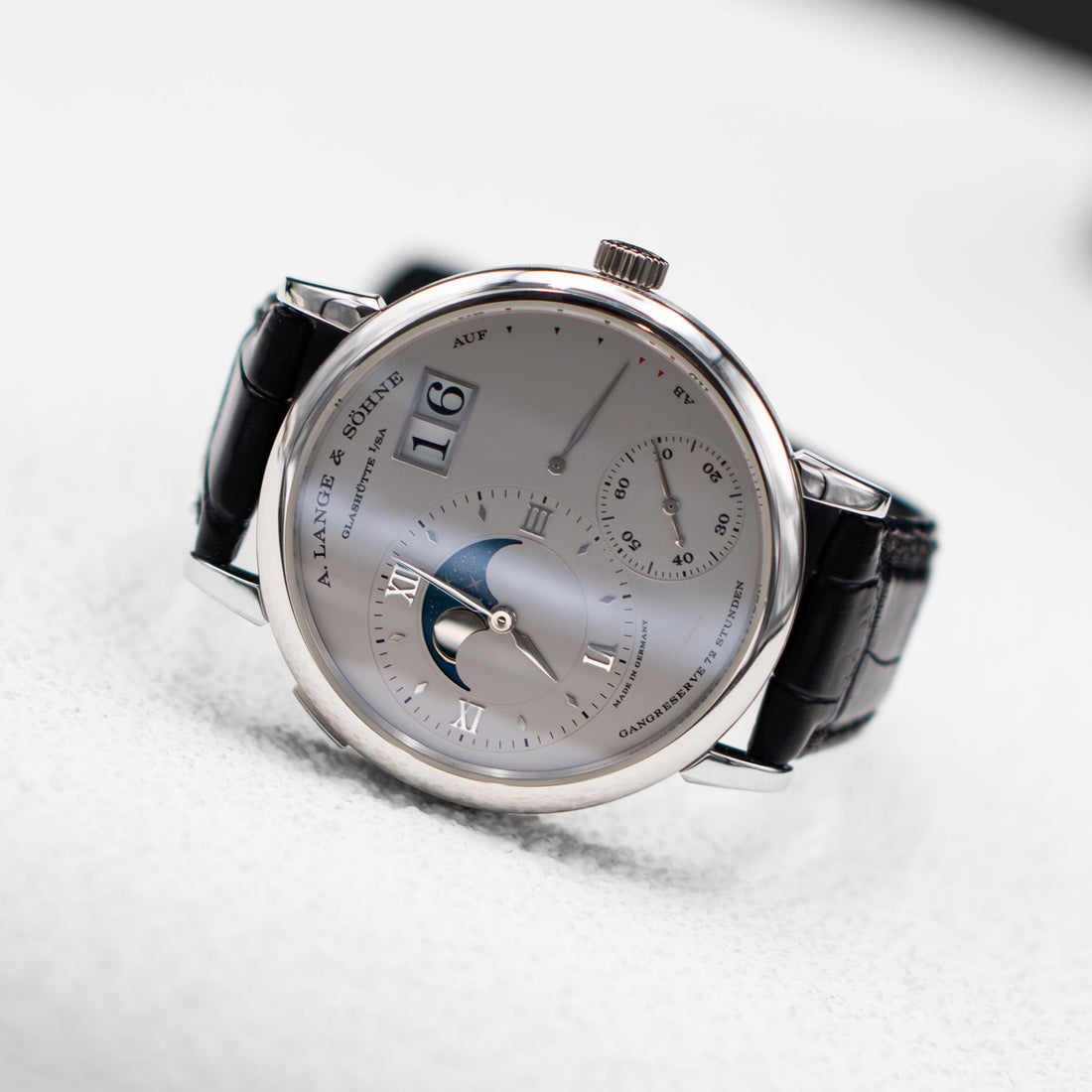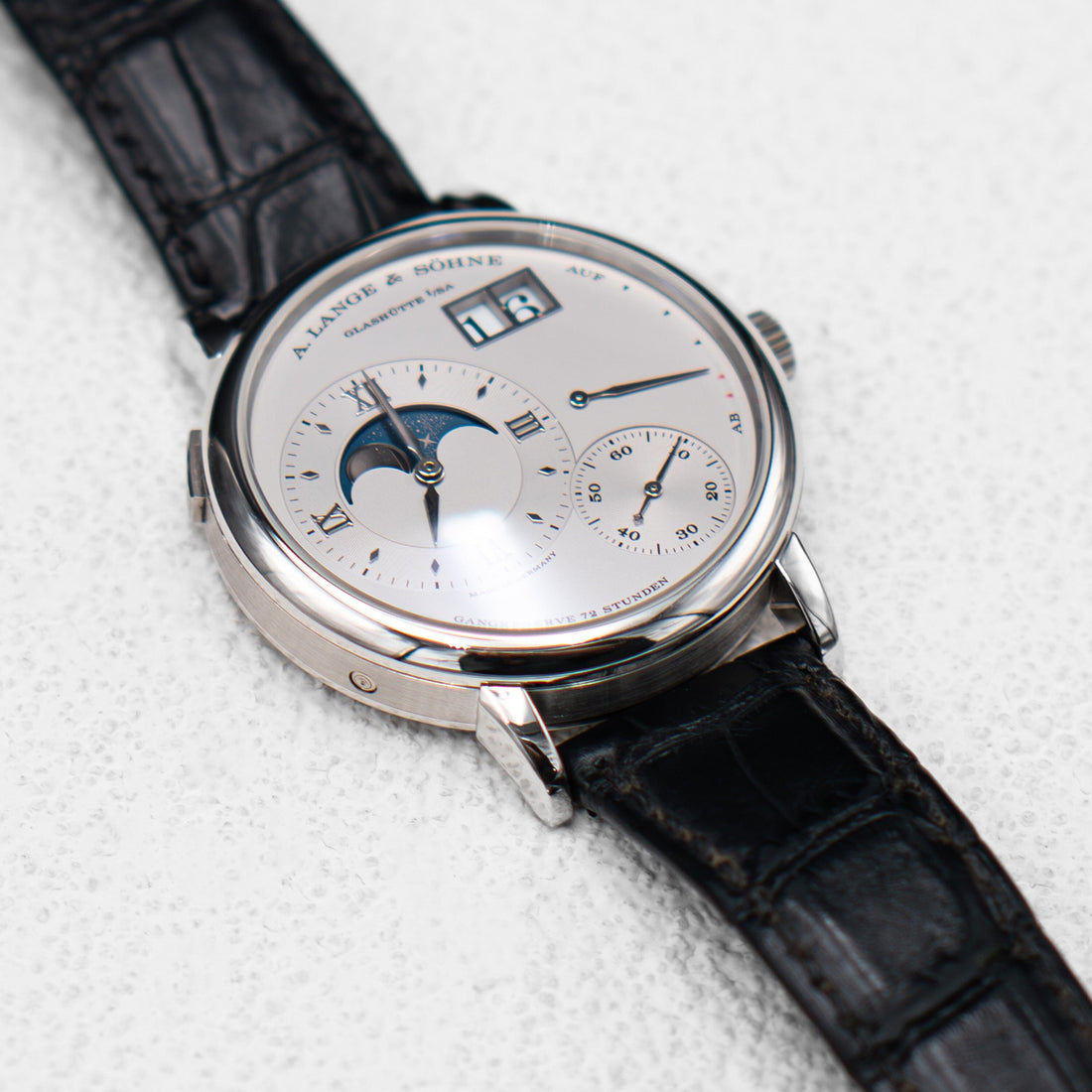 A. Lange & Sohne Grand Lange 1 Moon Phase 139.025 Mens Watch. 41mm platinum case. Platinum smoothed bezel. Silver dial with silver-tone hands and Roman numeral & index hour markers. Small second is displayed between 3 and 6 o'clock. The date is displayed at 2 o'clock. The hour and minute circle is displayed at 9 o'clock. The position of the moon-phase display in the hour and minute circle. Power-reserve indicator between 2 and 5 o'clock. Black leather strap with platinum buckle. Will fit up to a 7.5-inch wrist. Sapphire crystal. Transparent sapphire crystal case back. Mechanical hand-winding movement. This watch comes with original Box and Papers.