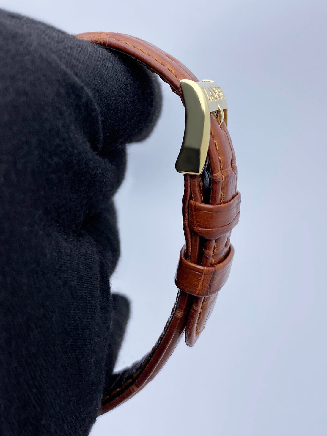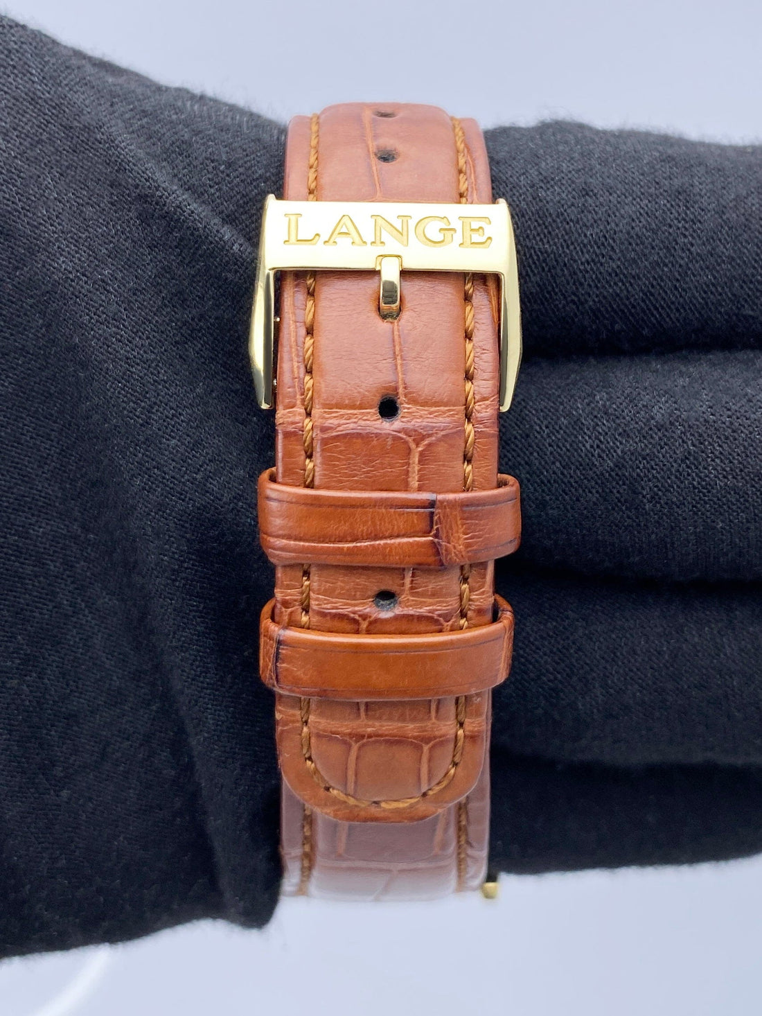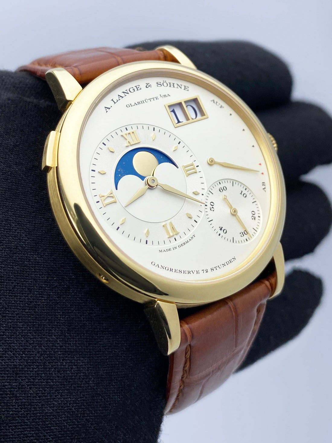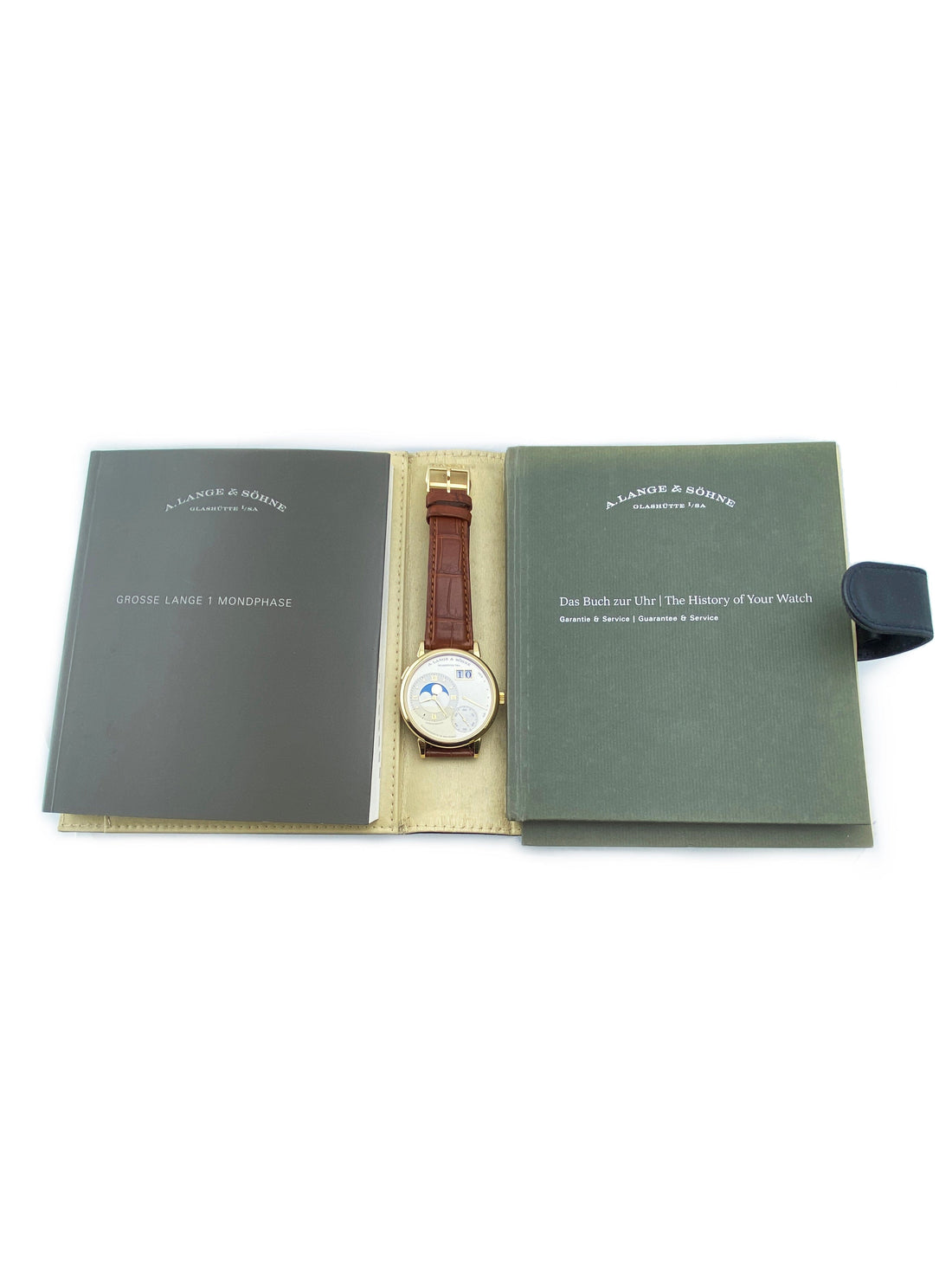 A. Lange & Sohne Grand Lange 1 Moon Phase 139.021 / LSLS1391AA Mens Watch. 41mm 18K yellow gold case. 18K yellow gold smoothed bezel. Ivory argenté-colored dial crafted from solid silver with gold hands and Roman numeral & index hour markers. Small second is displayed between 3 and 6 o'clock. The date is displayed at 2 o'clock. The hour and minute circle is displayed at 9 o'clock. The position of the moon-phase display in the hour and minute circle. Power-reserve indicator between 2 and 5 o'clock. Brown leather strap with 18K yellow gold buckle. Will fit up to a 8-inch wrist. Sapphire crystal. Transparent sapphire crystal case back. Mechanical hand-winding movement. This watch comes with original Papers.