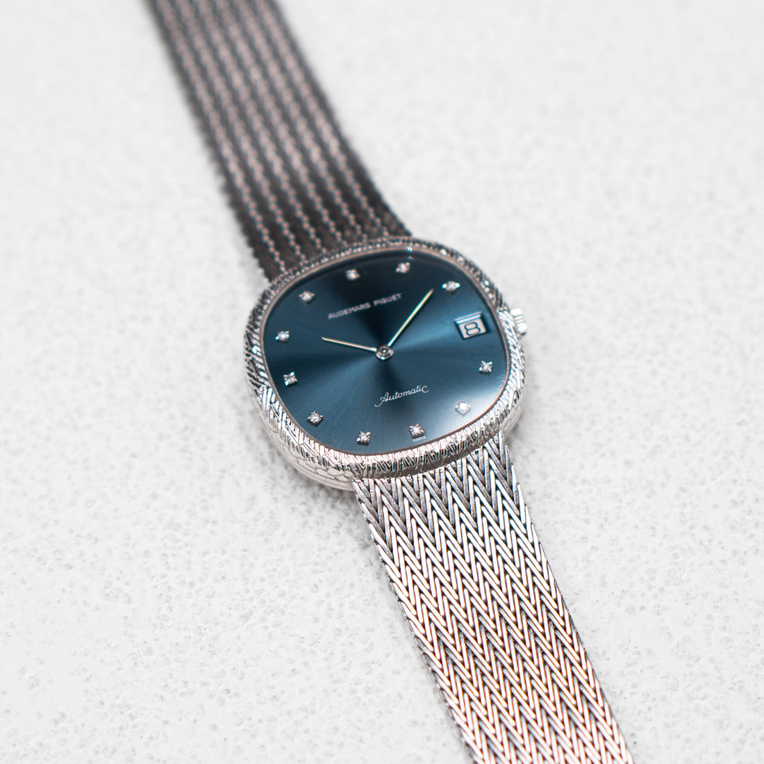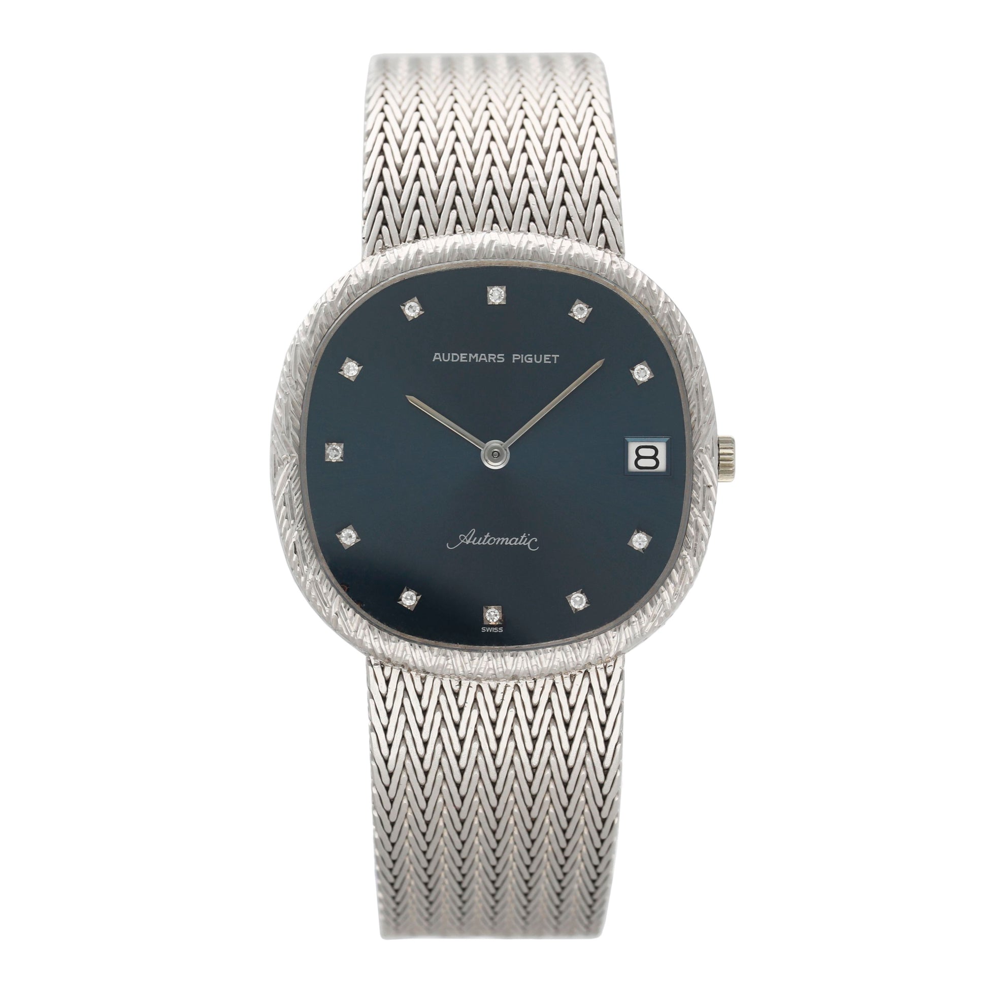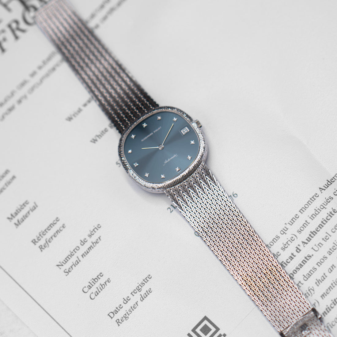 Audemars Piguet 5379BC Ladies Watch. 33mm 18K white gold case. 18K white gold bezel. Blue dial with silver-tone hands and factory diamond hour marker. Date display at 3 o'clock position. 18K white mesh bracelet with jewelry clasp. Will fit up to a 7-inch wrist. Sapphire crystal. 18K white gold case back. Automatic self-winding movement. This watch comes with Archives from Audemars Piguet.
