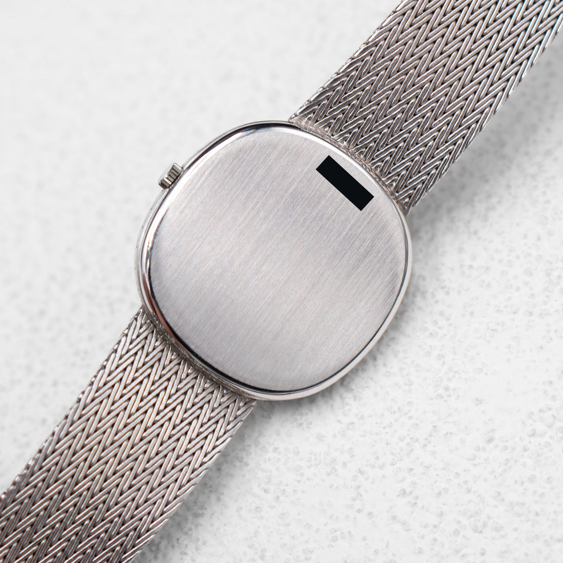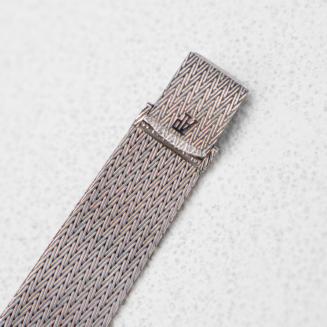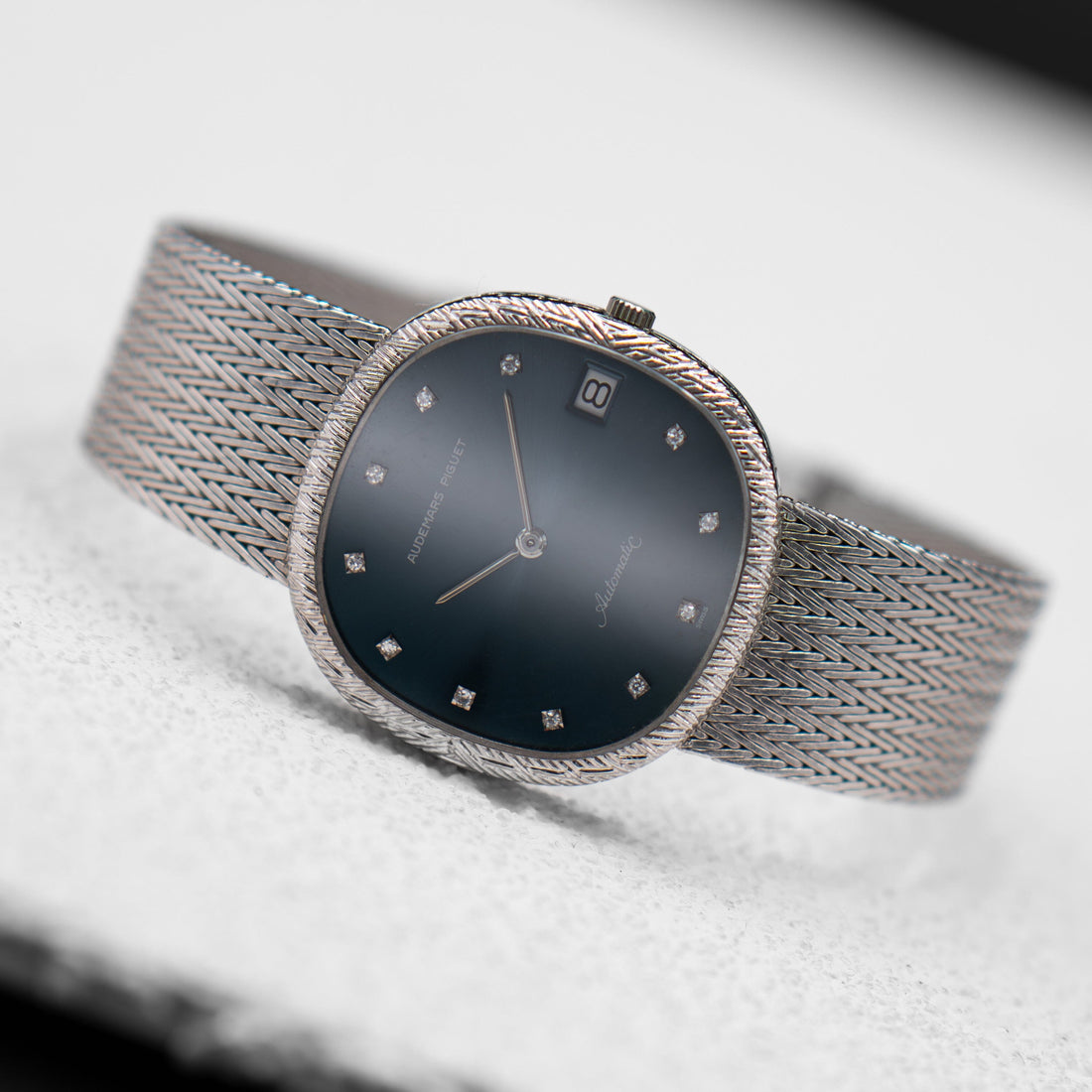 Audemars Piguet 5379BC Ladies Watch. 33mm 18K white gold case. 18K white gold bezel. Blue dial with silver-tone hands and factory diamond hour marker. Date display at 3 o'clock position. 18K white mesh bracelet with jewelry clasp. Will fit up to a 7-inch wrist. Sapphire crystal. 18K white gold case back. Automatic self-winding movement. This watch comes with Archives from Audemars Piguet.