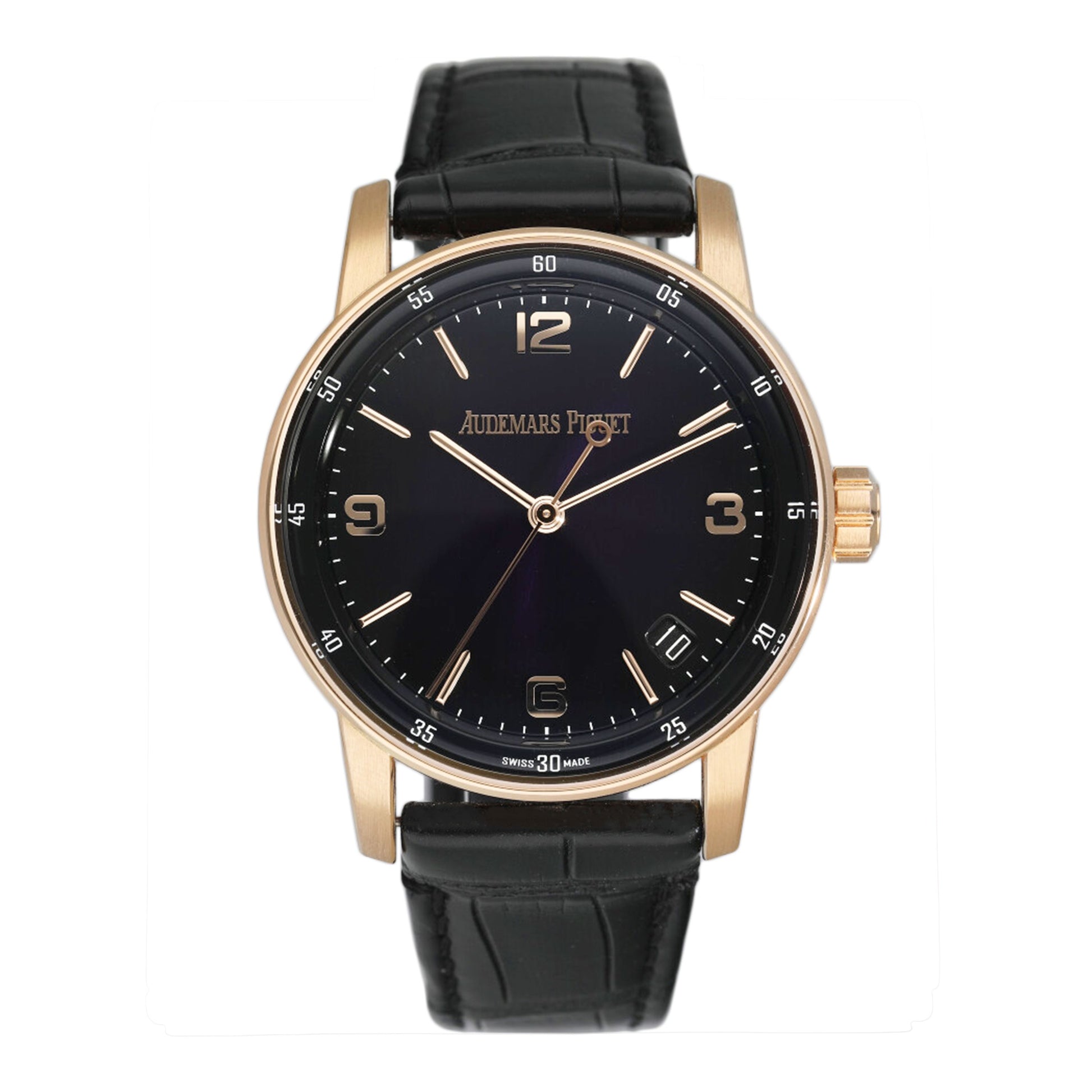 Audemars Piguet Code 11.59 15210OR.OO.A002KB.02 Mens Watch. 41mm 18K rose gold case. 18K rose gold bezel. Lacquered purple dial with white gold hands and Arabic numeral & index hour markers. Date display between 4 and 5 o'clock. Black leather strap with 18K rose gold buckle. Will fit up to a 7.5-inch wrist. Sapphire crystal. Transparent sapphire crystal case back. Automatic self-winding movement.