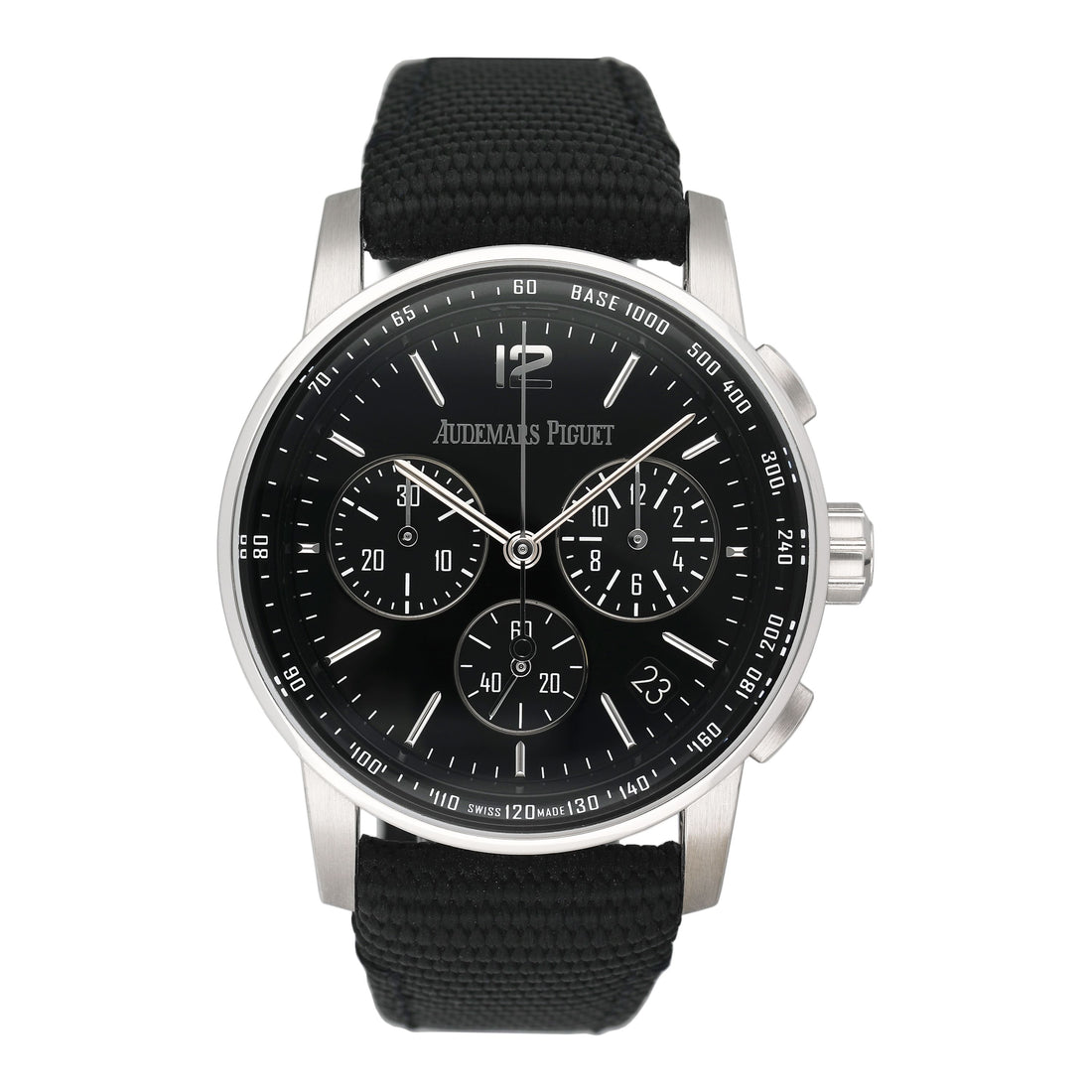 Audemars Piguet Code 11.59 26393BC.OO.A002CR.01 Mens Watch. 41mm white gold case. 18K white gold bezel. Black dial with white gold hands and Arabic numeral & index hour markers. Date display between 4 and 5 o'clock. Three sub-dials. Small seconds hand at 6 o'clock. 30-minute counter at 9 o'clock. 12-hour counter at 3 o'clock. Black rubber-coated strap with 18K white gold buckle. Will fit up to a 7.5-inch wrist. Sapphire crystal. Transparent sapphire crystal case back. Automatic self-winding movement. This watch comes with original Box and Papers.