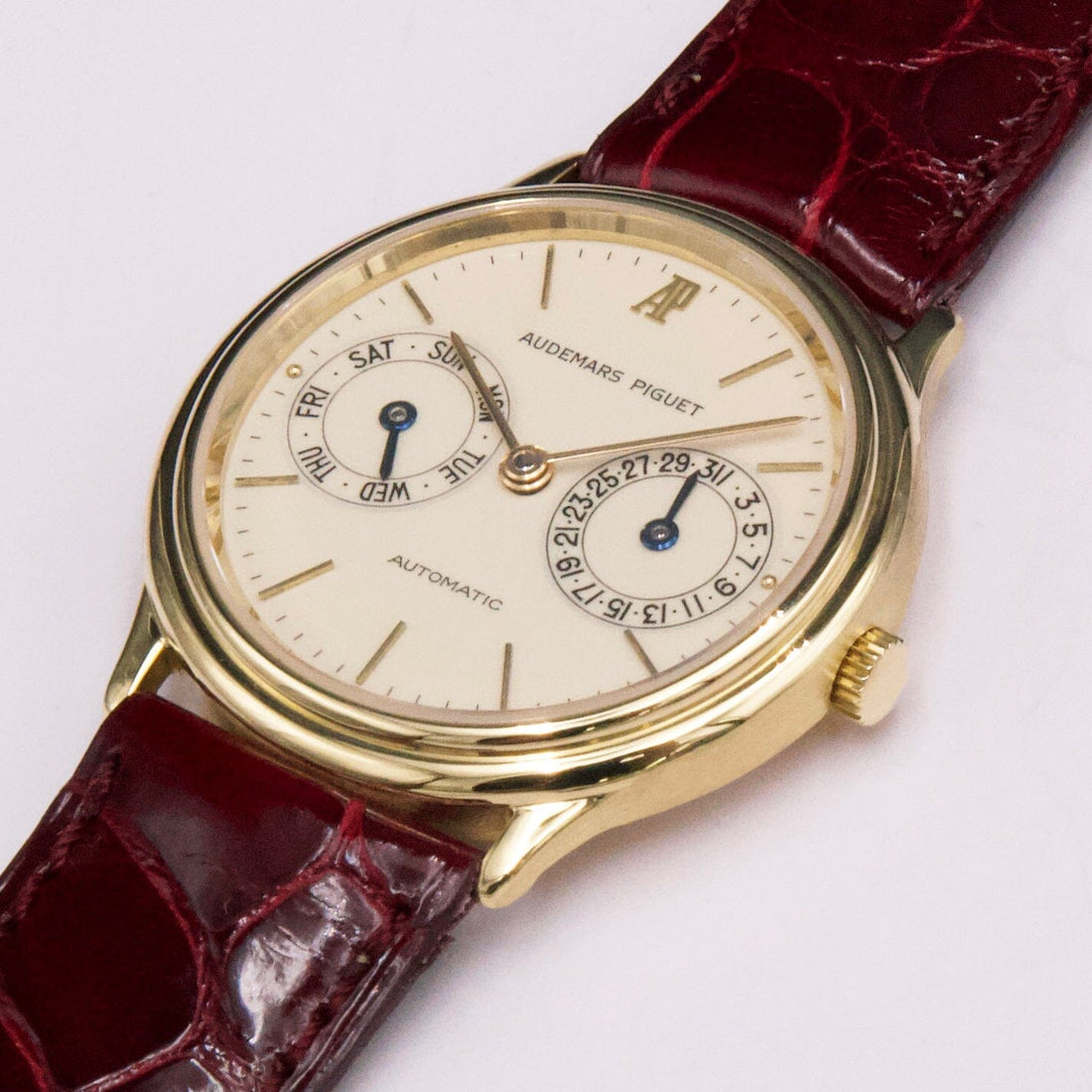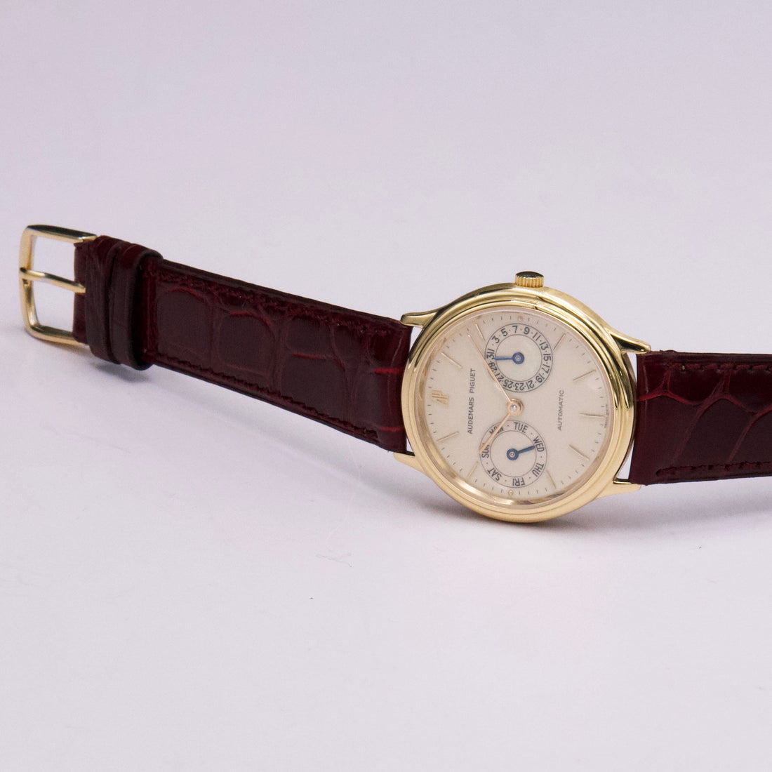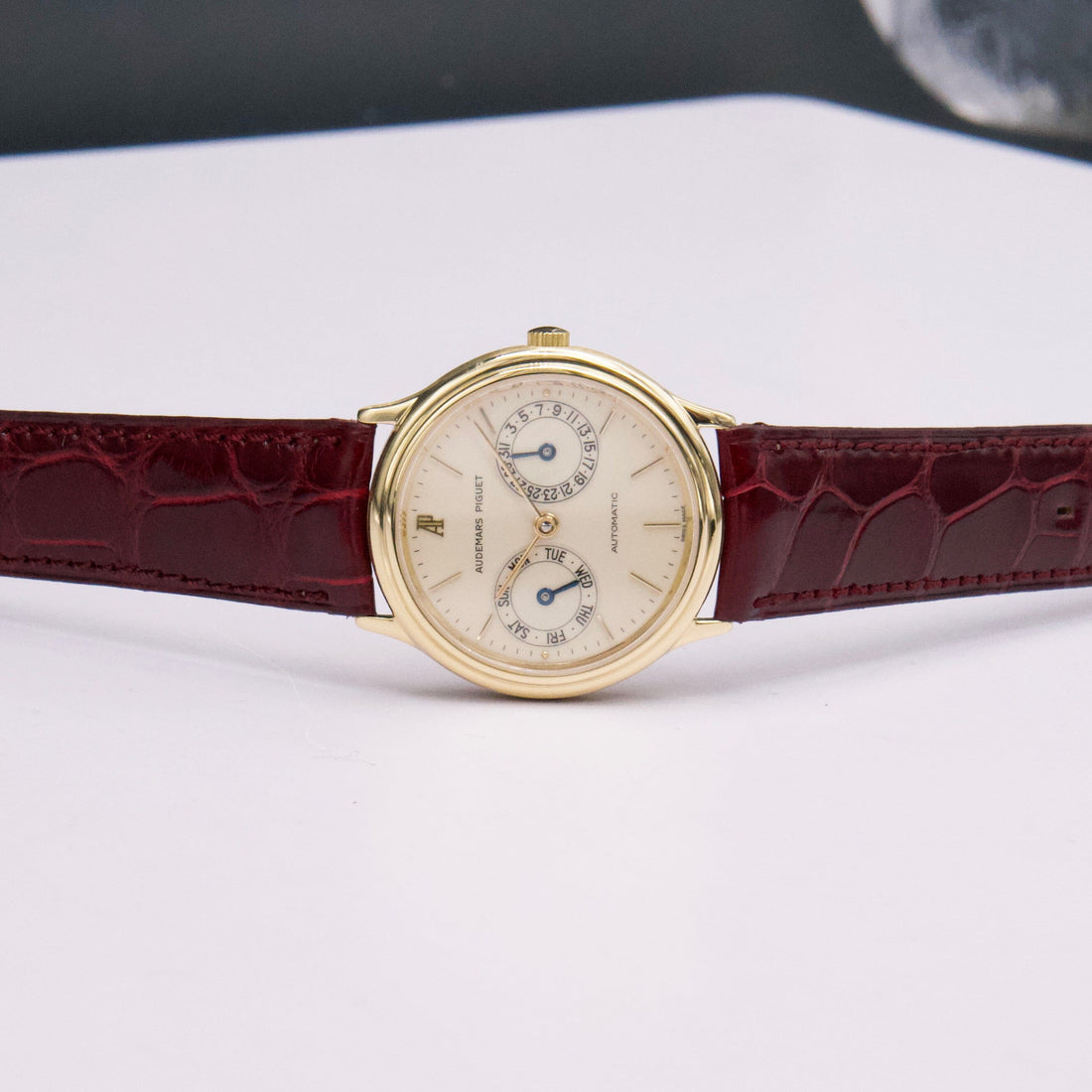 Audemars Piguet Day-Date 25574 Mens Watch. 33mm 18K yellow gold case with 18K yellow gold bezel. Cream dial with gold hands and index hour marker. Two sub-dials indicates the date & day. Burgundy aftermarket leather strap with buckle. Will fit up to 7-Inch wrist. Mineral crystal and 18K yellow gold solid case back. Automatic self-winding movement.