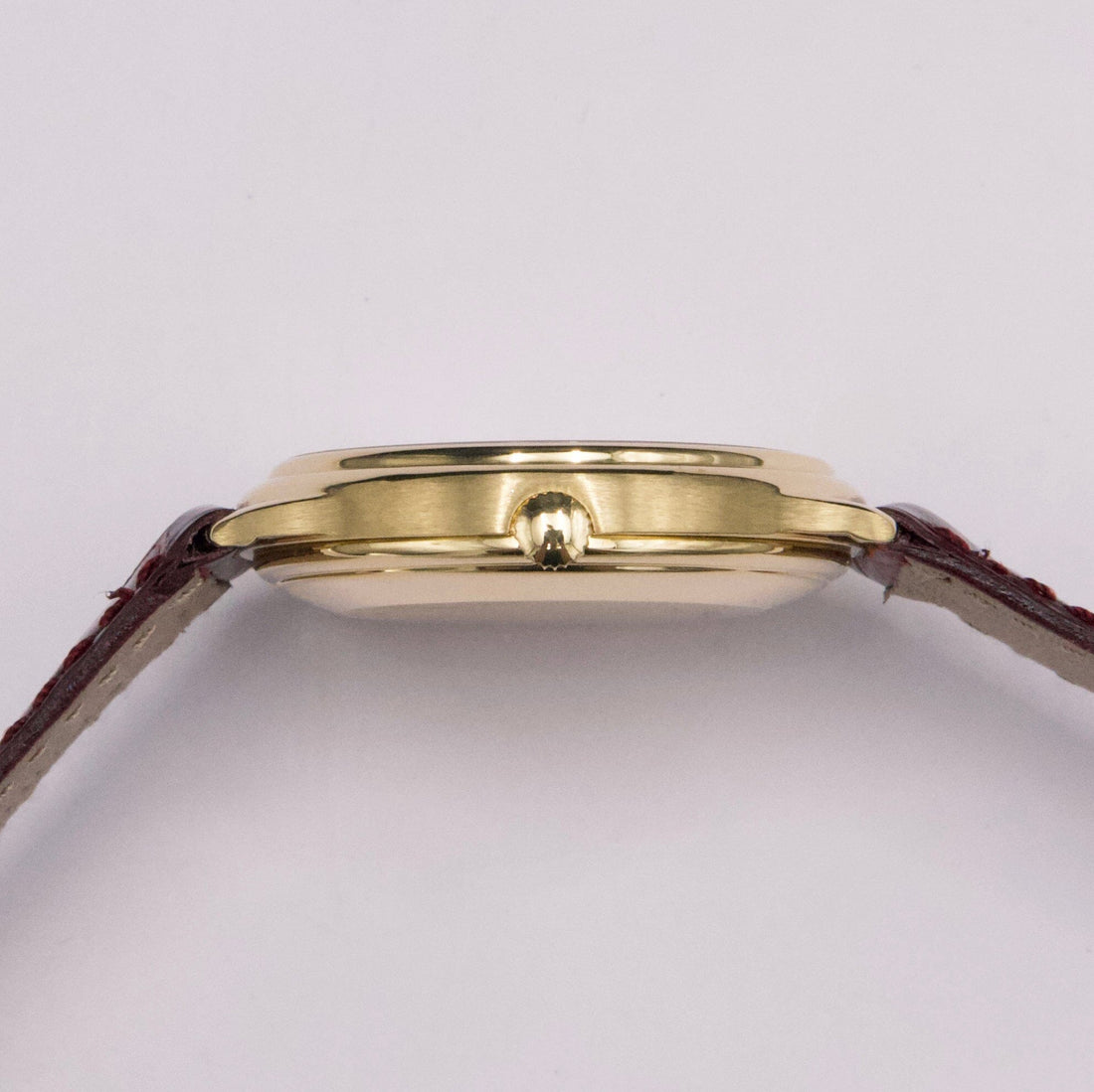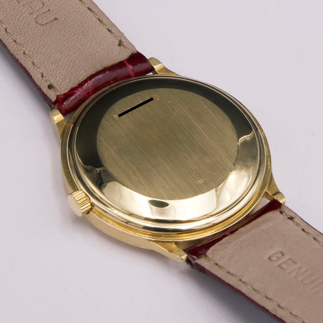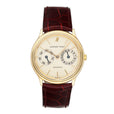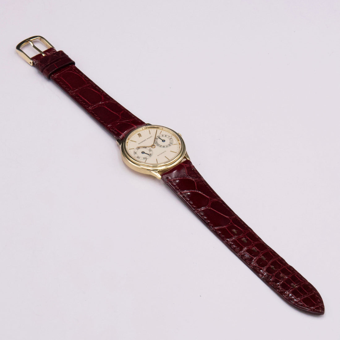 Audemars Piguet Day-Date 25574 Mens Watch. 33mm 18K yellow gold case with 18K yellow gold bezel. Cream dial with gold hands and index hour marker. Two sub-dials indicates the date & day. Burgundy aftermarket leather strap with buckle. Will fit up to 7-Inch wrist. Mineral crystal and 18K yellow gold solid case back. Automatic self-winding movement.