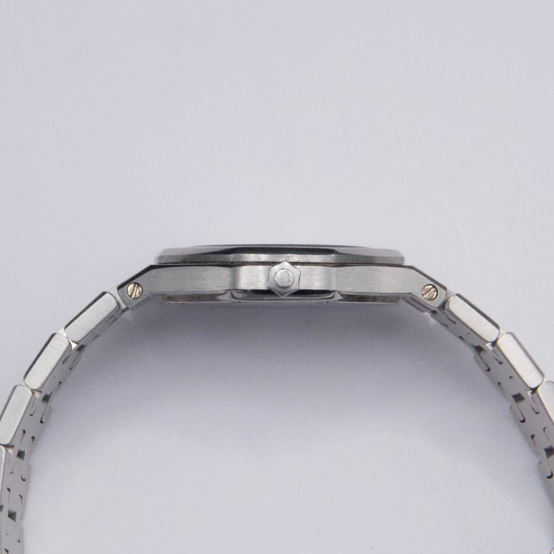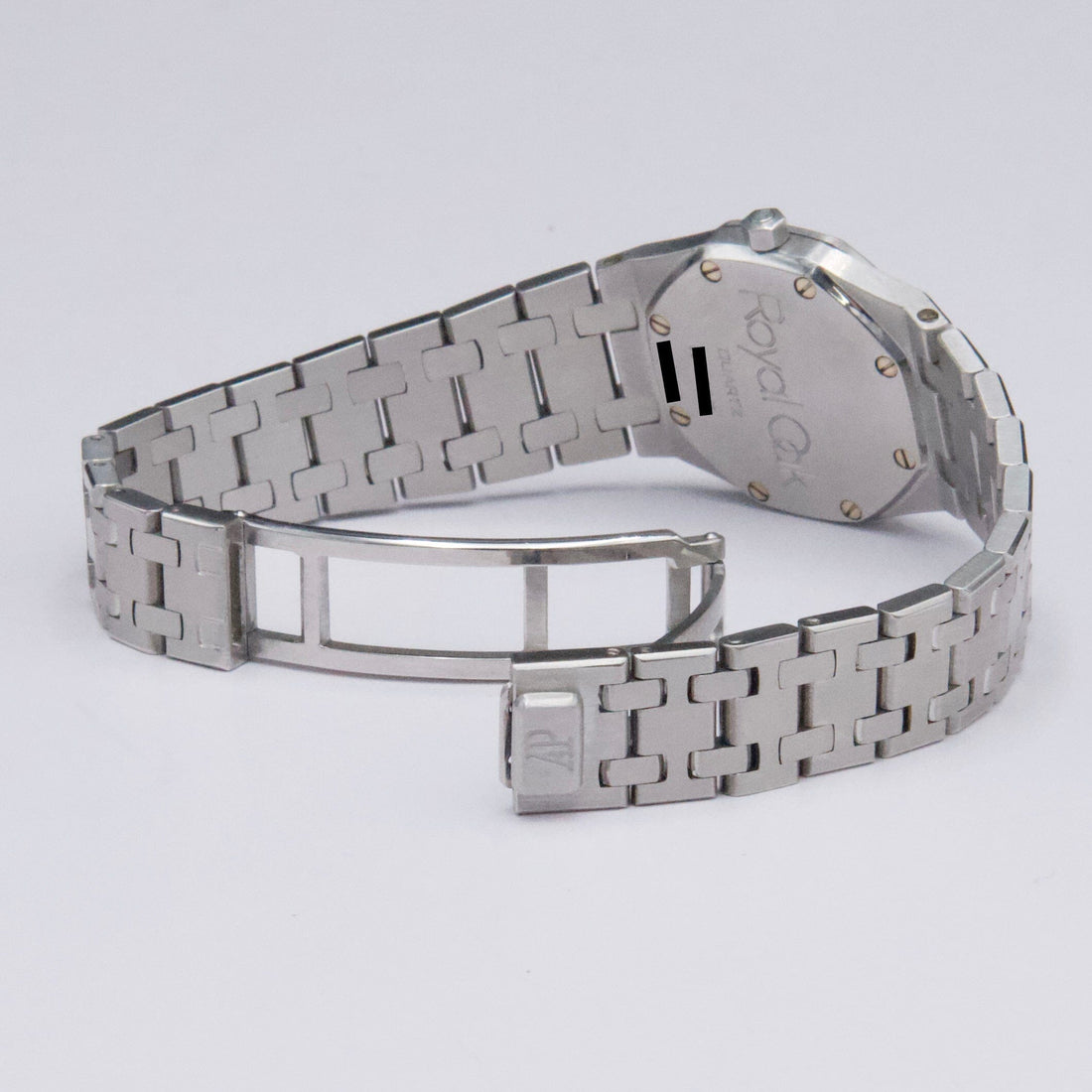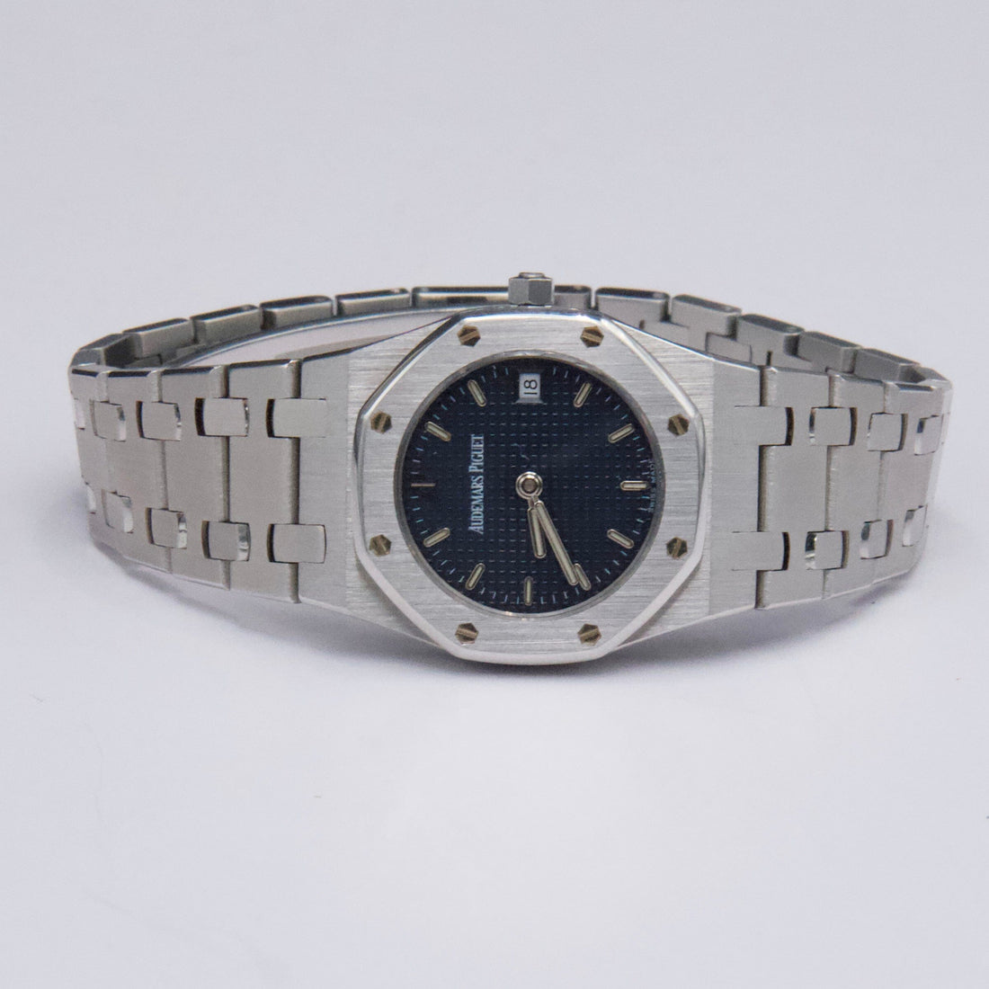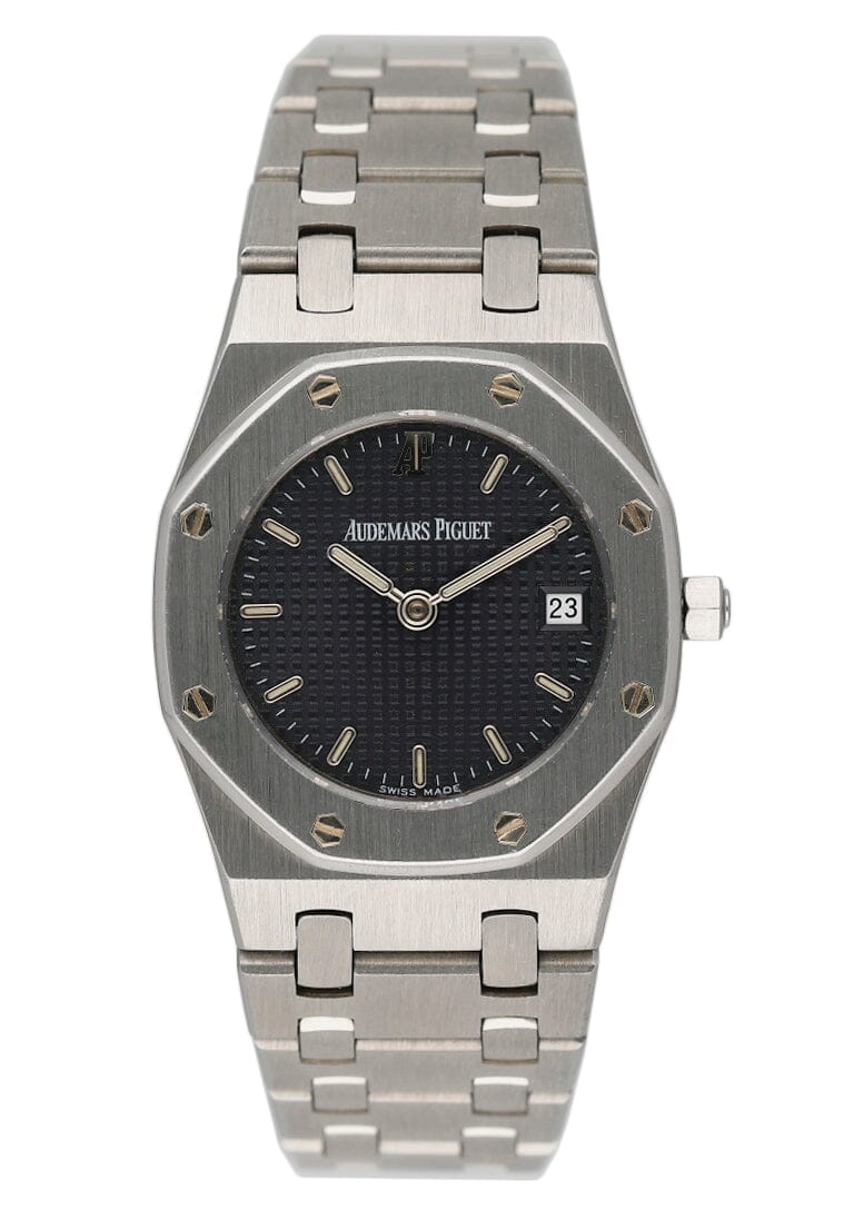 Audemars Piguet Royal Ladies Watch. 25mm stainless steel case. Stainless steel octagon bezel. Black tapestry dial with silver hands and index hour markers. Date display at 3 o'clock position. Stainless steel bracelet with hidden fold over clasp with single push button safety. Will fit up to a 6-inch wrist. Sapphire crystal. Stainless steel case back. Quartz: Battery powered movement.
