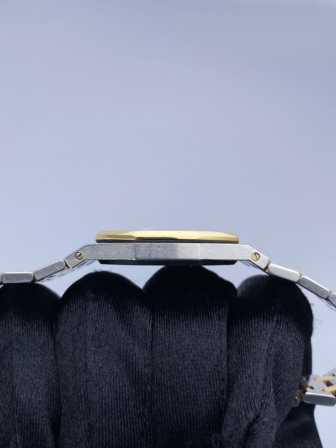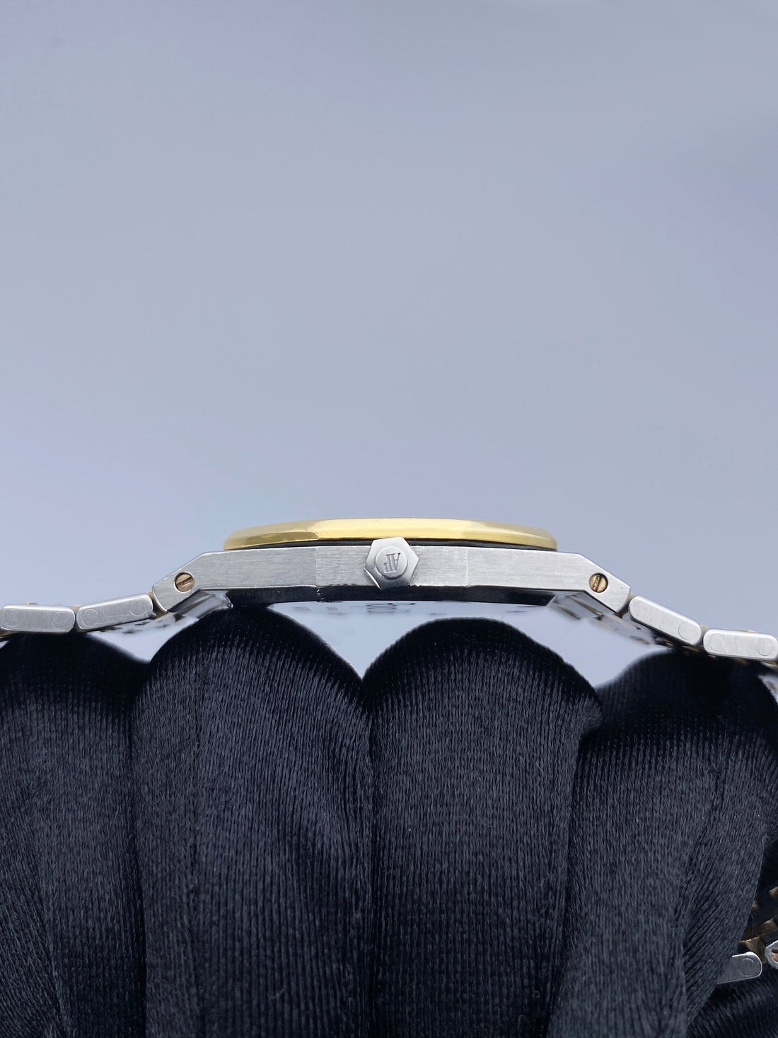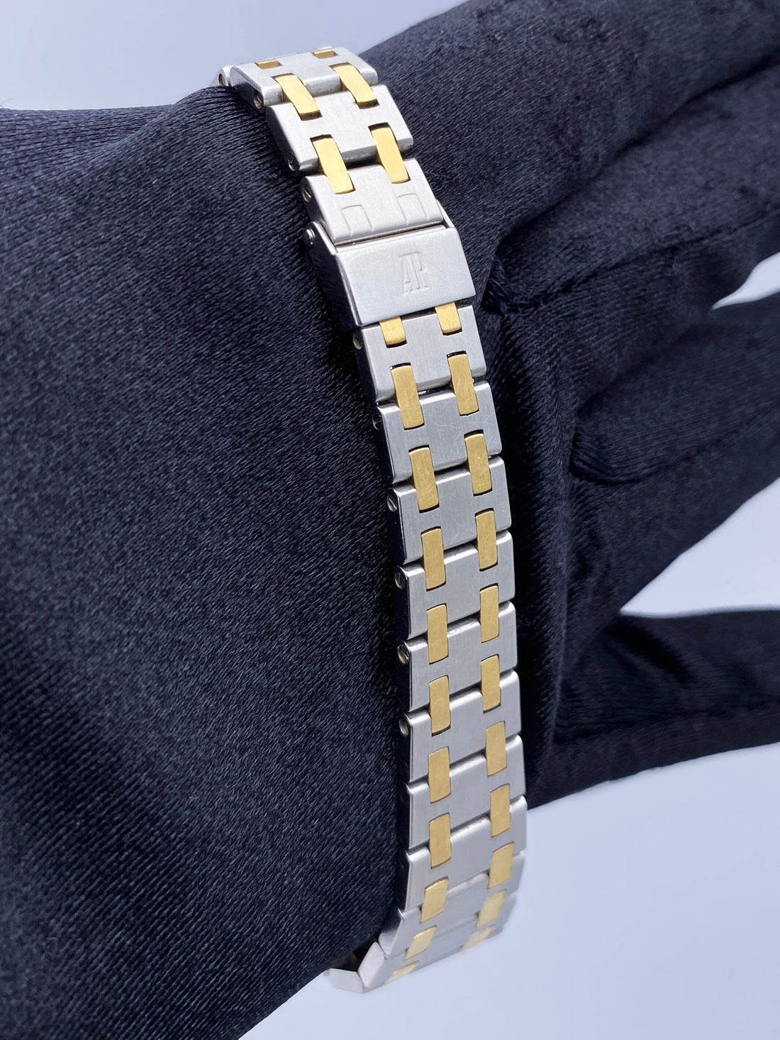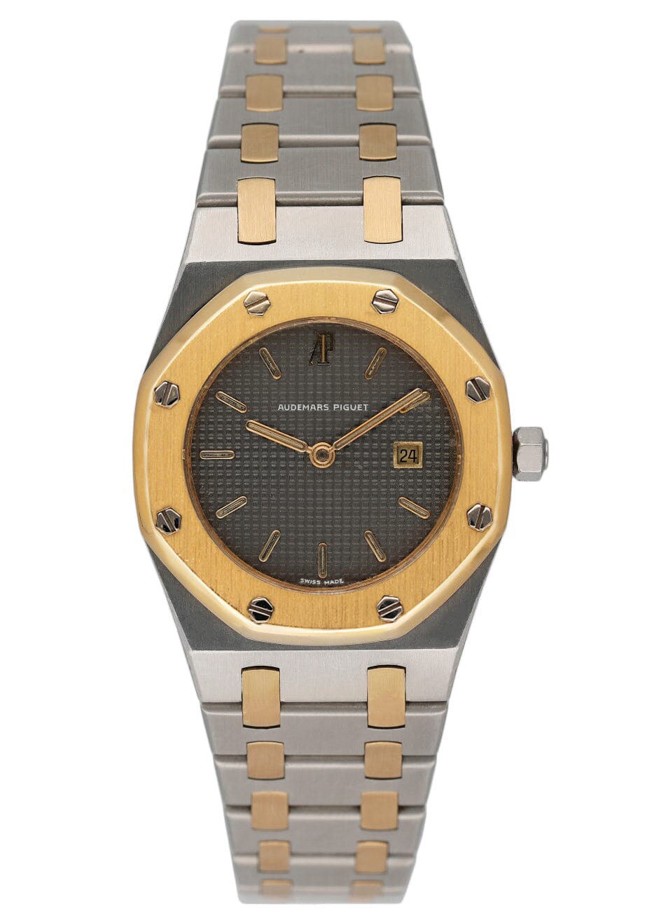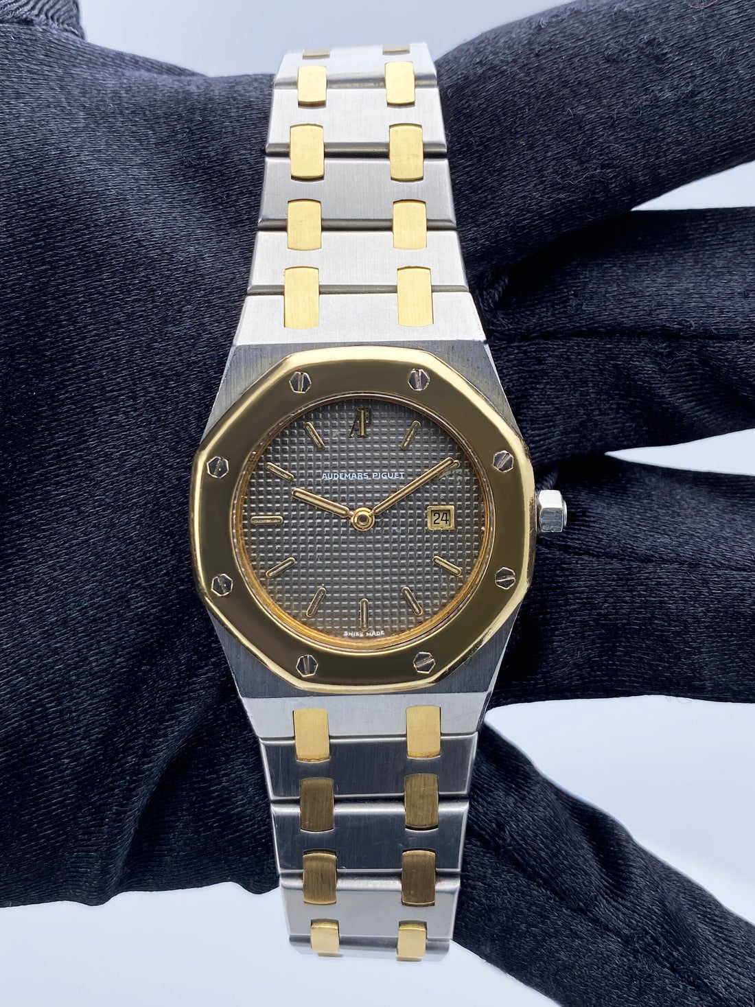 Audemars Piguet Royal 14470SA Ladies Watch. 30mm stainless steel case with 18K yellow gold octagon bezel. Grey tapestry dial with luminous gold hands and luminous index markers. Date display at the 3 o'clock position. 18K yellow gold & stainless steel bracelet with hidden fold over clasp with safety. Will fit up to a 6-inch wrist. Sapphire crystal. Stainless steel case back. Quartz: Battery powered movement.
