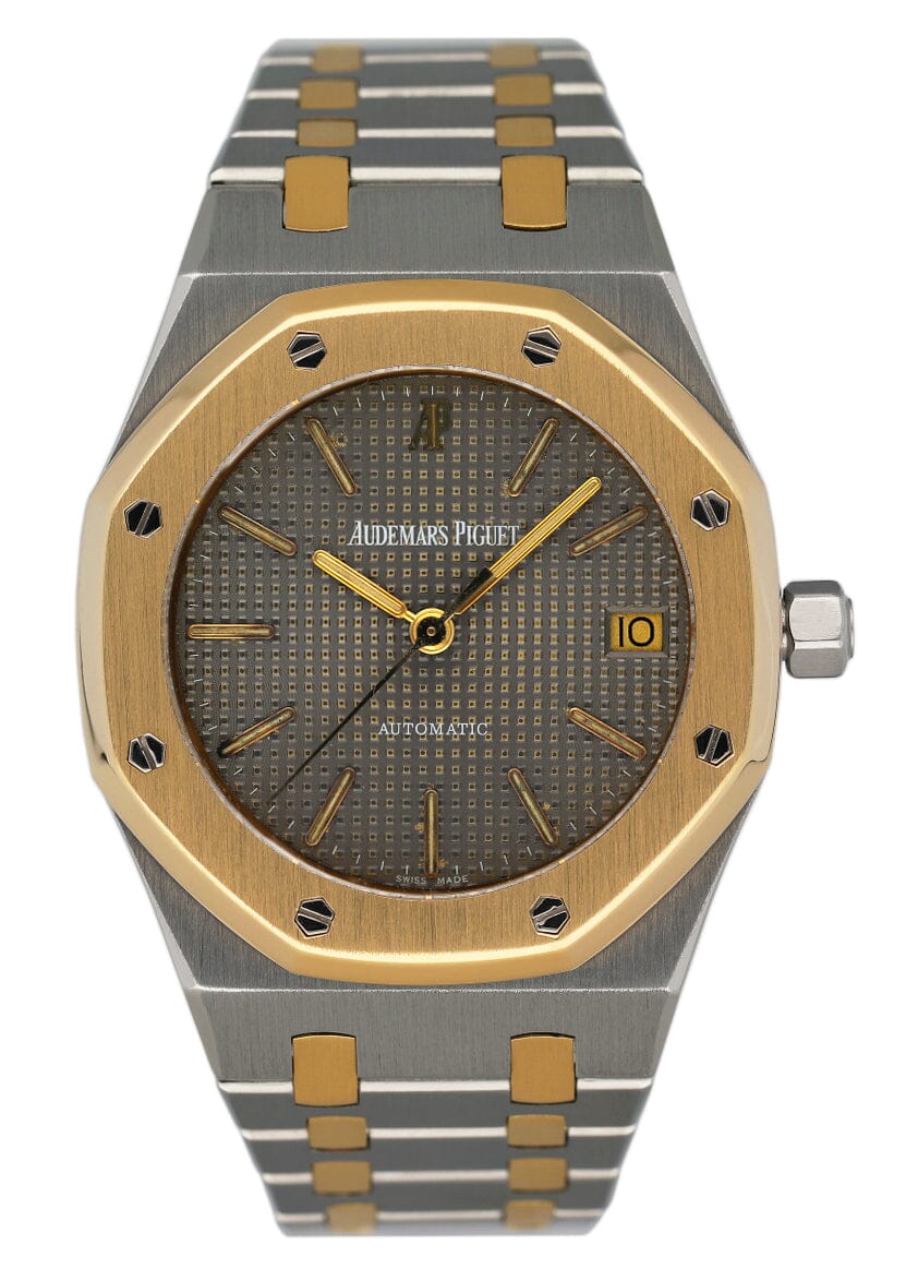 Audemars Piguet Royal Oak 14790SA Mens Watch. 36mm stainless steel case with 18K yellow gold octagon shape bezel. Gray tapestry dial with gold luminous hands and findex hour marker. The date is displayed at 3 o'clock position. Stainless steel and 18K yellow gold bracelet with fold over steel clasp with single push button safety. Will fit up to 6.75-Inch wrist. Sapphire crystal. Stainless steel case back. Automatic self-winding movement.