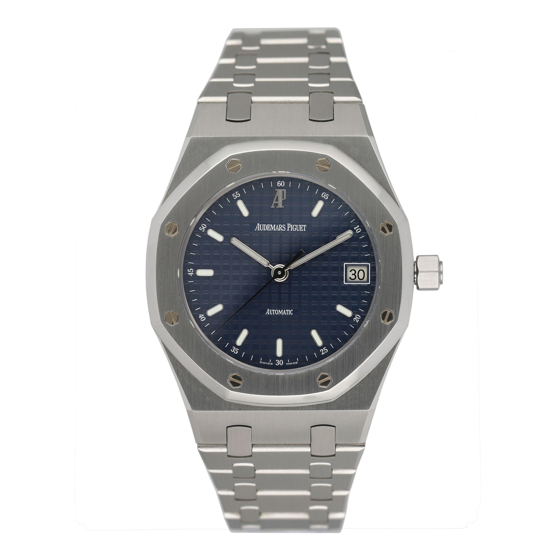 Audemars Piguet Royal 14790ST.OO.0789ST.08 watch. 36mm stainless steel case. Stainless steel octagon shaped bezel. Blue tapestry dial with luminous steel hands and index hour markers. Date display at the 3 o'clock position. Stainless steel bracelet with fold over clasp. Will fit up to a 7.5 wrist. Sapphire crystal. Stainless steel case back. Automatic self winding movement. This watch comes with original Box and Papers.