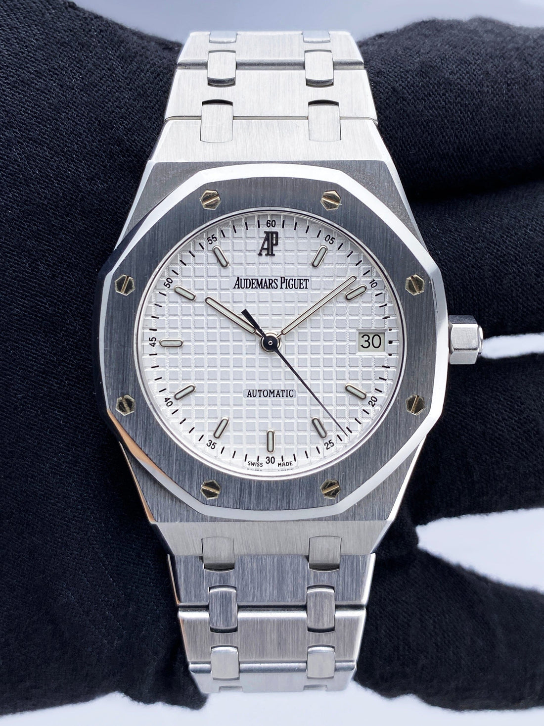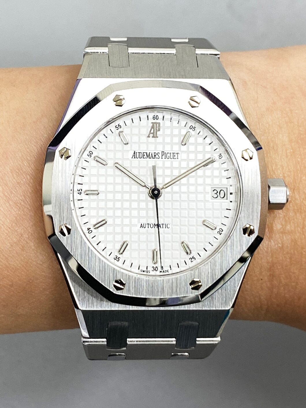 Audemars Piguet Royal 14790ST.O.0789ST.10 Mens Watch. 36mm stainless steel case. Stainless steel octagon shaped bezel. White tapestry dial with luminous steel hands and index hour markers. Date display at the 3 o'clock position. Stainless steel bracelet with fold over clasp. Will fit up to a 5.75 inch wrist. Sapphire crystal. Stainless steel case back. Automatic self winding movement.
