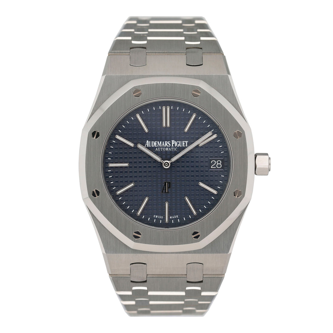Audemars Piguet Royal Oak 15202ST.OO.1240ST.01 Mens Watch. 39mm stainless steel case with stainless steel octagon bezel. Blue tapestry dial with luminous steel hands and index hour marker. Minute markers on the outer dial. Date display at 3 o'clock position. Stainless steel bracelet with fold over clasp with double push button safety. Will fit up to 7.5-Inch wrist. Sapphire crystal. Transparent sapphire crystal back case. Automatic self-winding movement. This watch comes with Box and Papers.