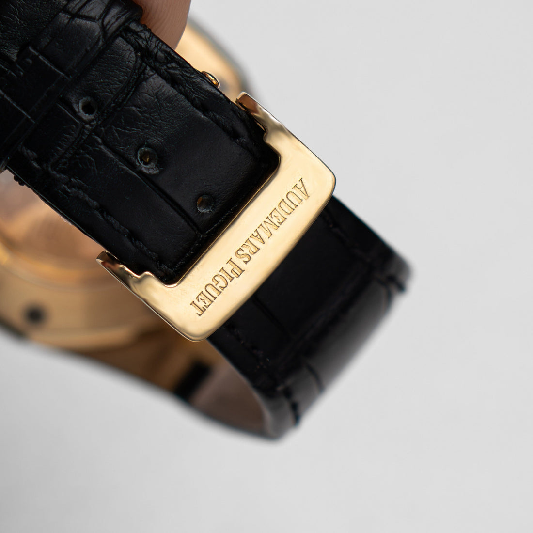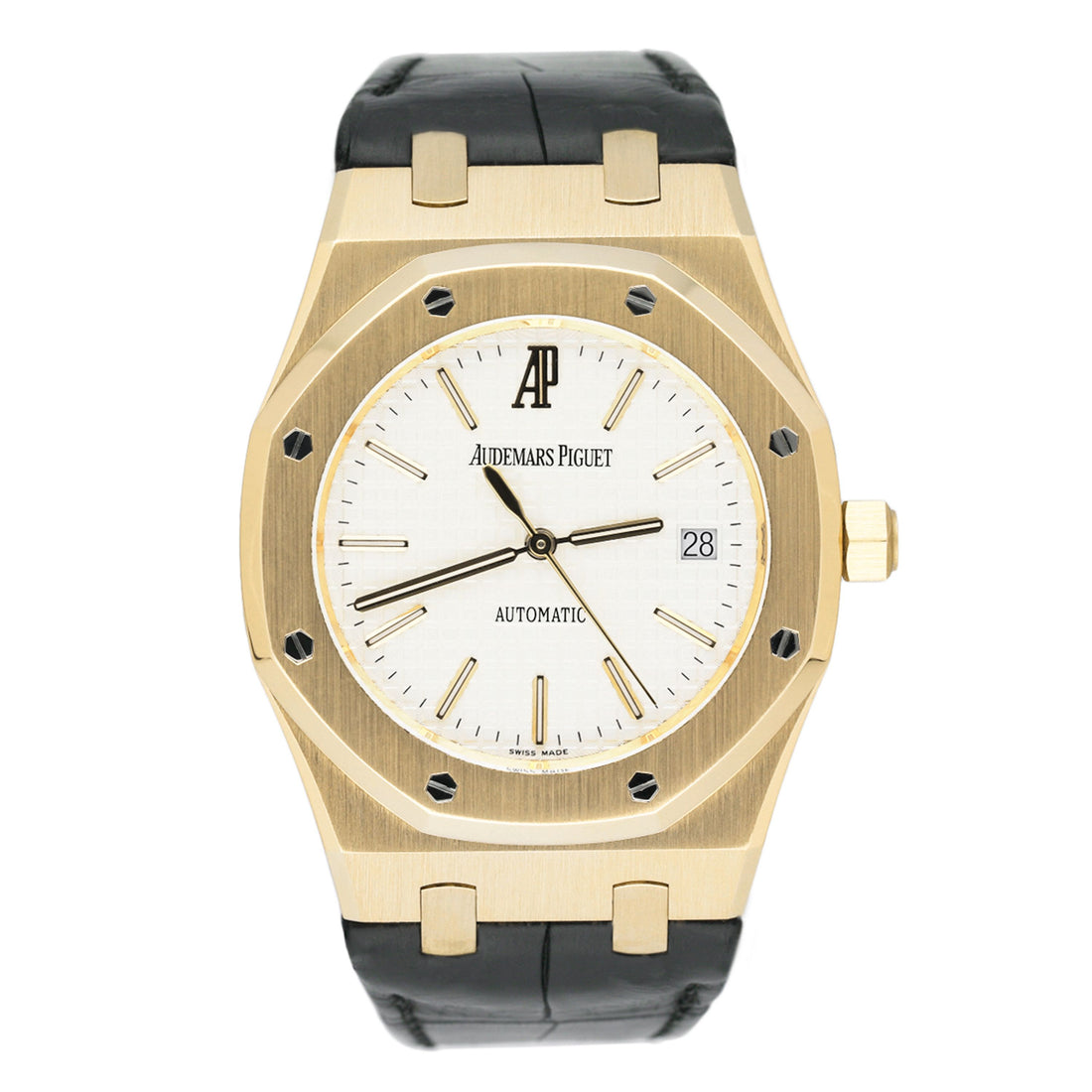 Audemars Piguet 15300BA Royal Oak Mens Watch. 39mm 18K yellow gold case. 18K yellow gold octagon bezel. White tapestry dial with yellow gold luminous hands and index hour marker. Date display at 3 o'clock position. Black leather strap with 18K yellow gold fold over clasp. Will fit up to 7.5 Inch wrist. Sapphire crystal. Transparent sapphire crystal back case. Automatic self-winding movement.