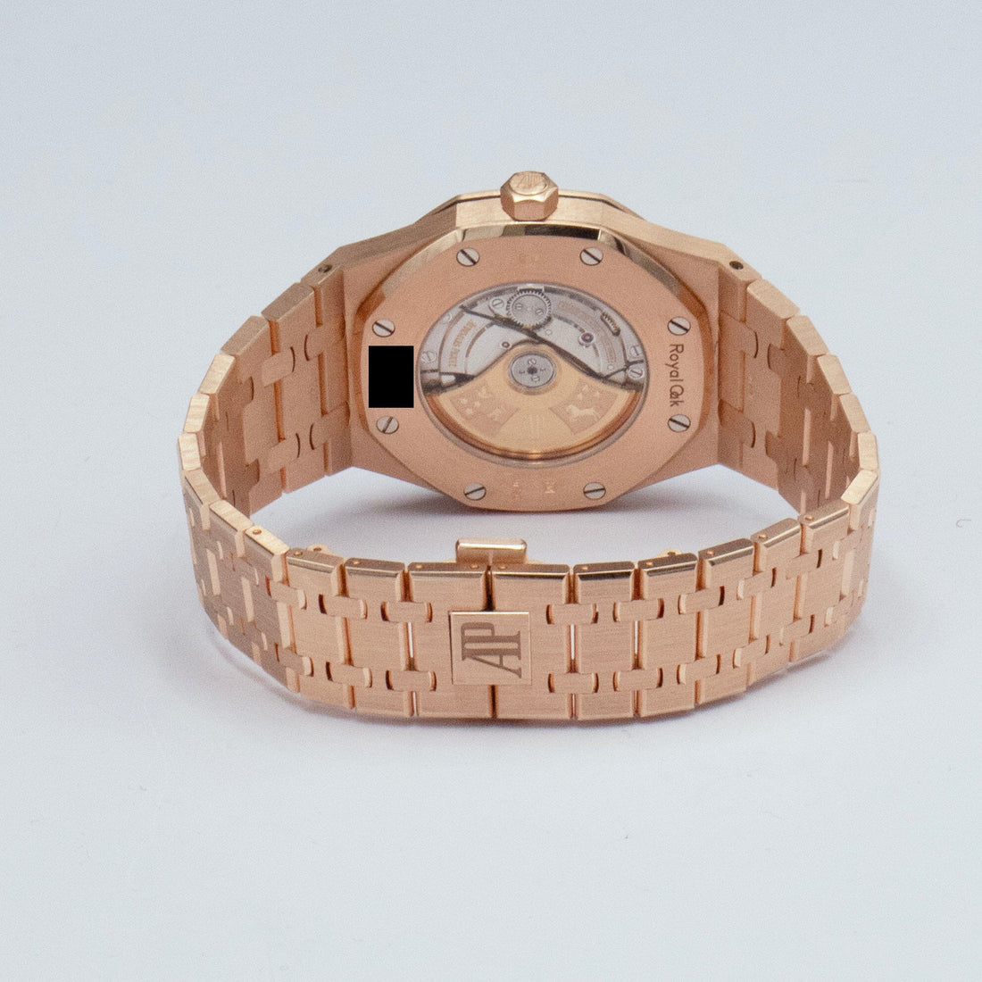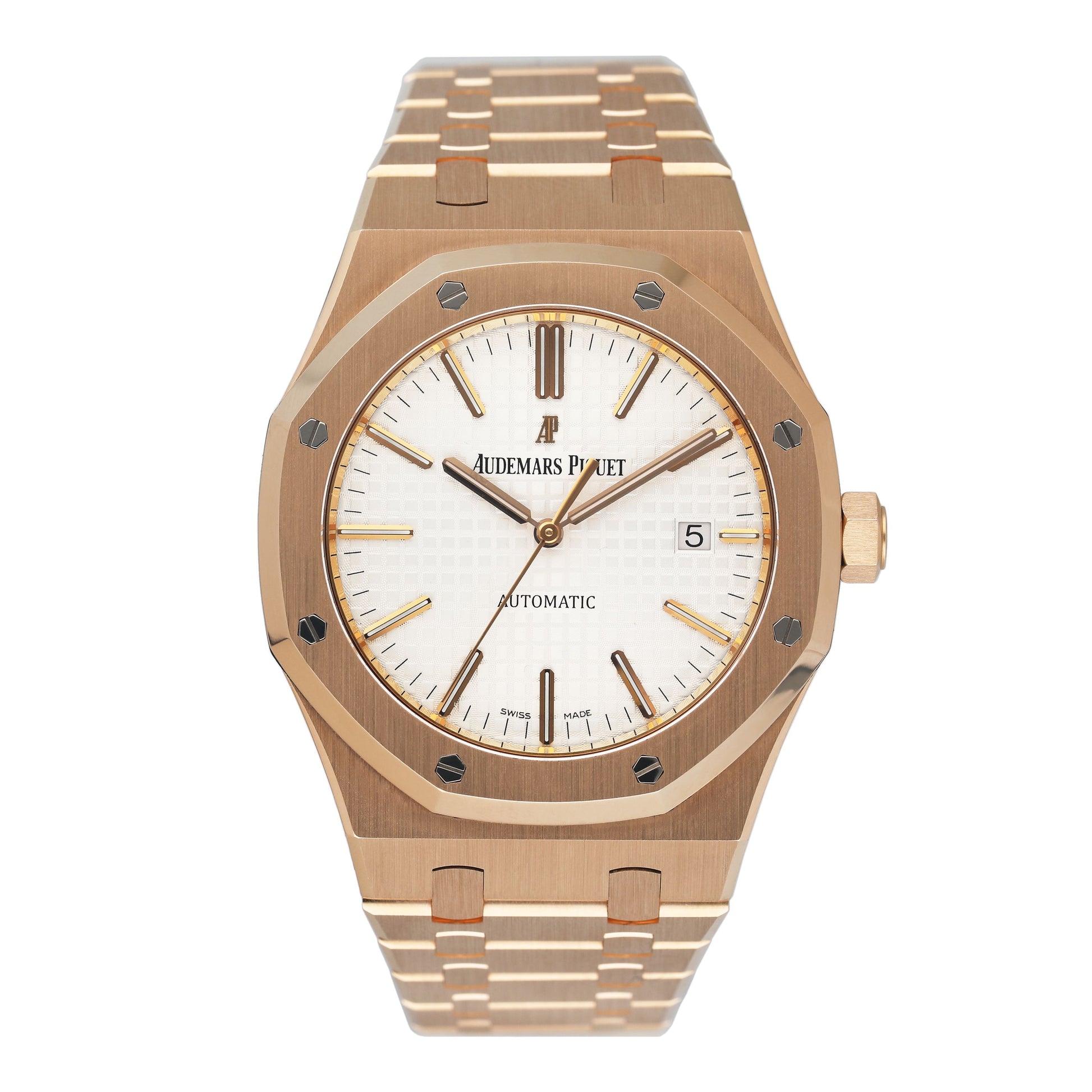 Audemars Piguet Royal Oak 15400OR.OO.D088CR.01 Mens Watch. 41mm 18K rose gold case. 18K rose gold octagon-shaped fixed bezel. White grande tapisserie pattern dial with rose gold-tone luminous hands and luminous index hour markers. Date display at 3 o'clock position. 18k rose gold bracelet with fold-over clasp with hidden double push-button safety. Will fit up to a 7.5-inch wrist. Sapphire crystal. Transparent sapphire crystal case back. Caliber 3120 automatic self-winding movement with a 60-hour power reserve. This watch comes with original Box and Papers.