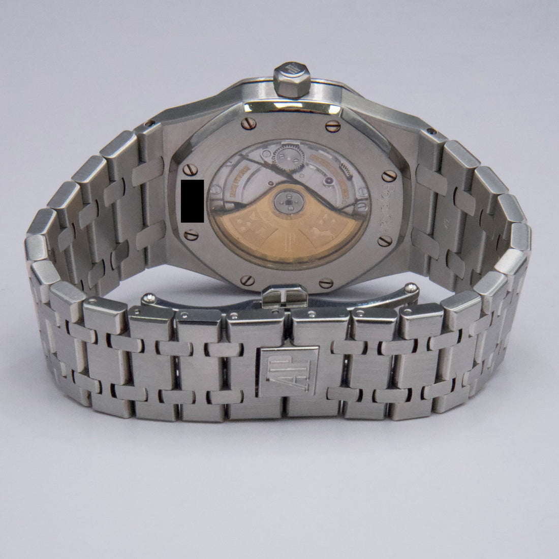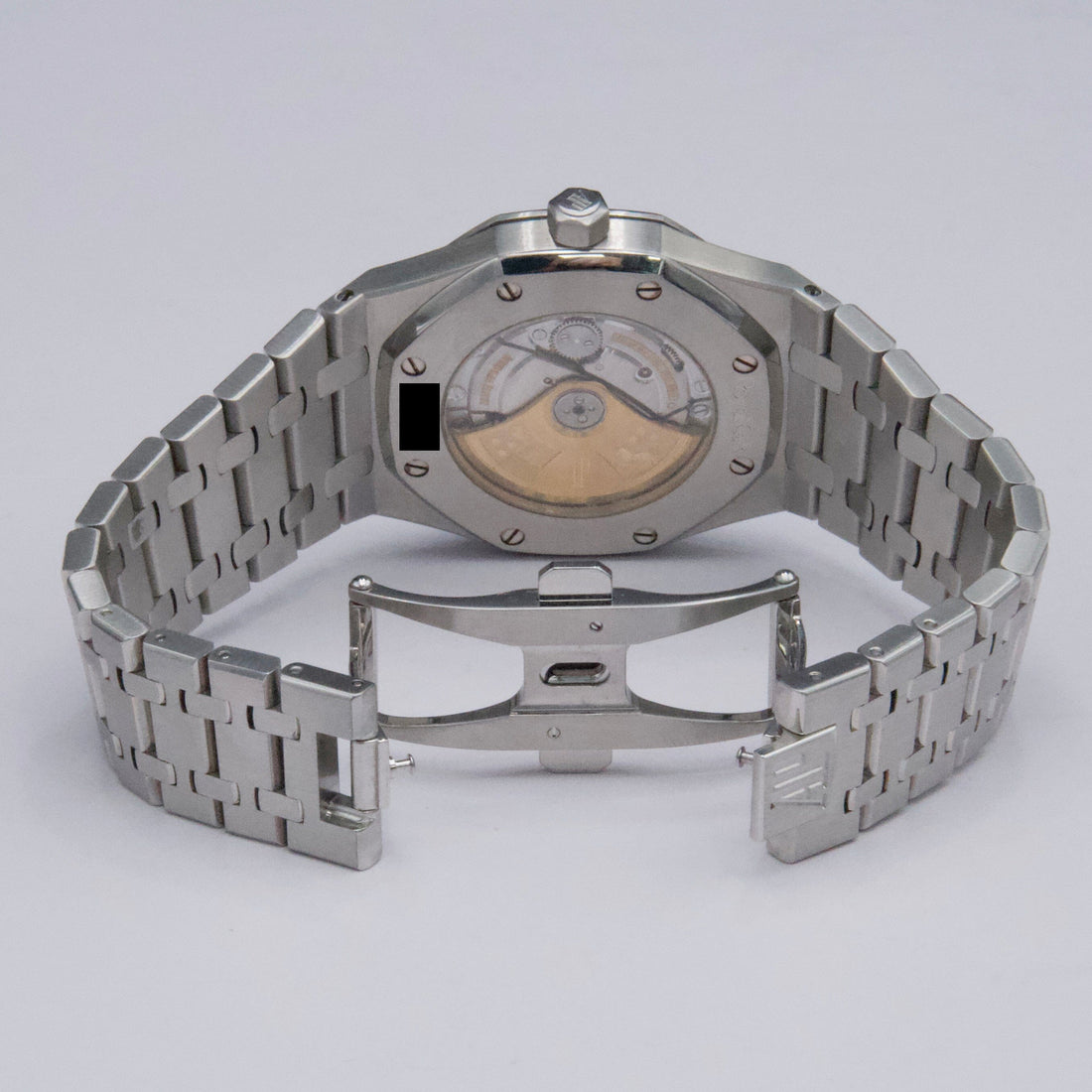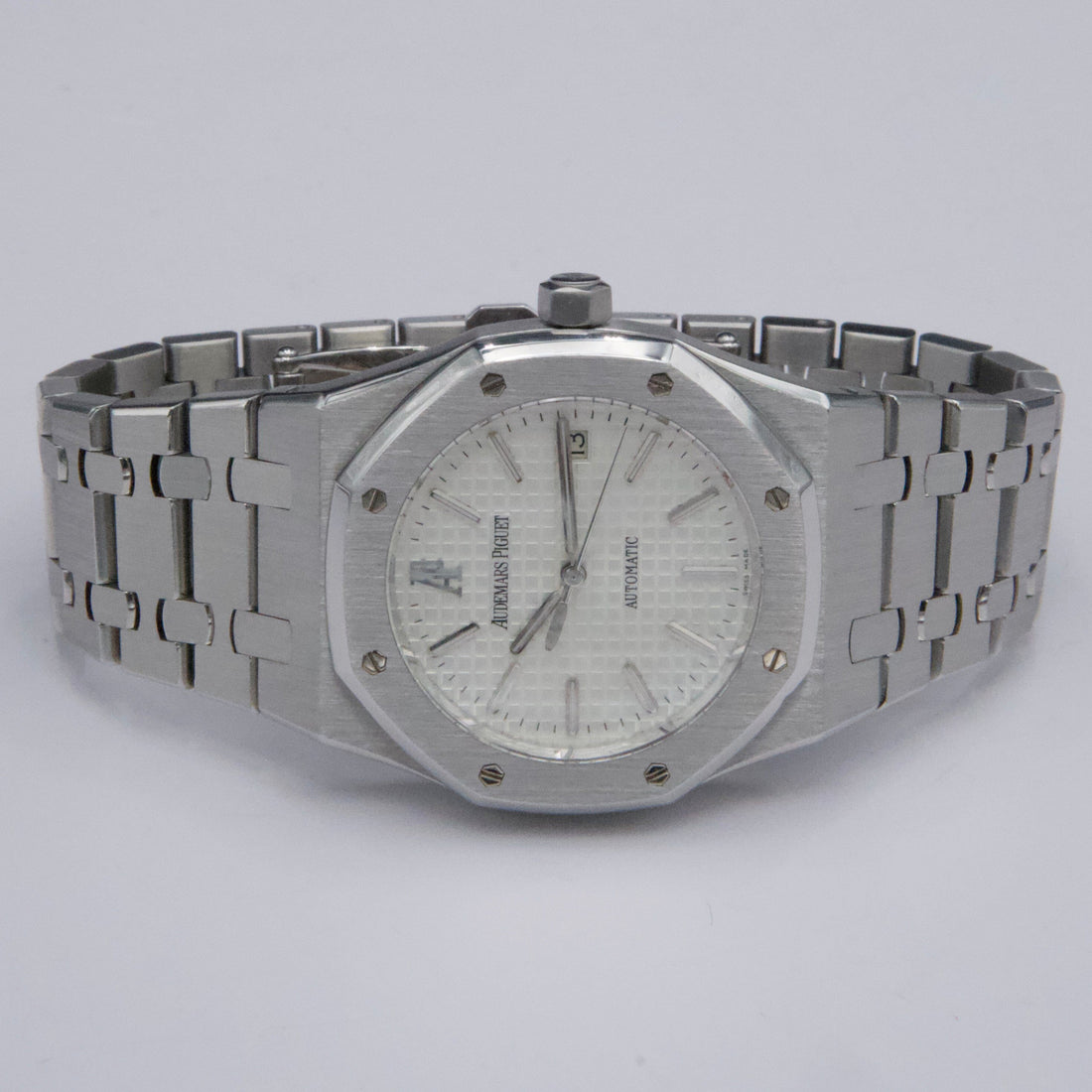 Audemars Piguet Royal Oak 15300ST Mens Watch. 39mm Stainless steel case. Stainless steel octagon bezel. White dial with luminous steel hands and index hour markers. Minute markers on the outer dial. Date display at the 3 o'clock position. Stainless steel bracelet with hidden butterfly push safety button clasp. Will fit up to a 7.5-inch wrist. Transparent sapphire crystal case back. Automatic self-winding movement with a 60-hour power reserve.
