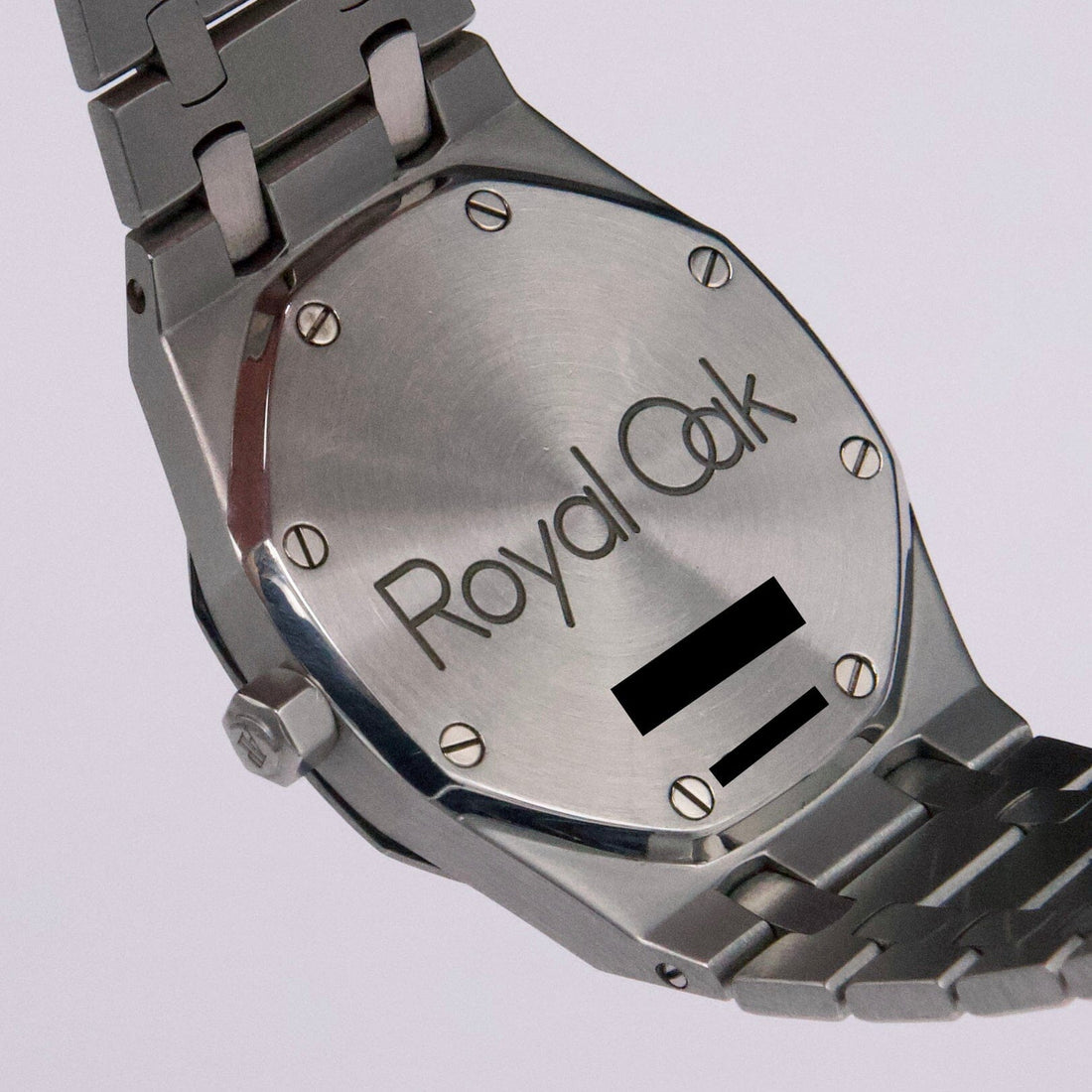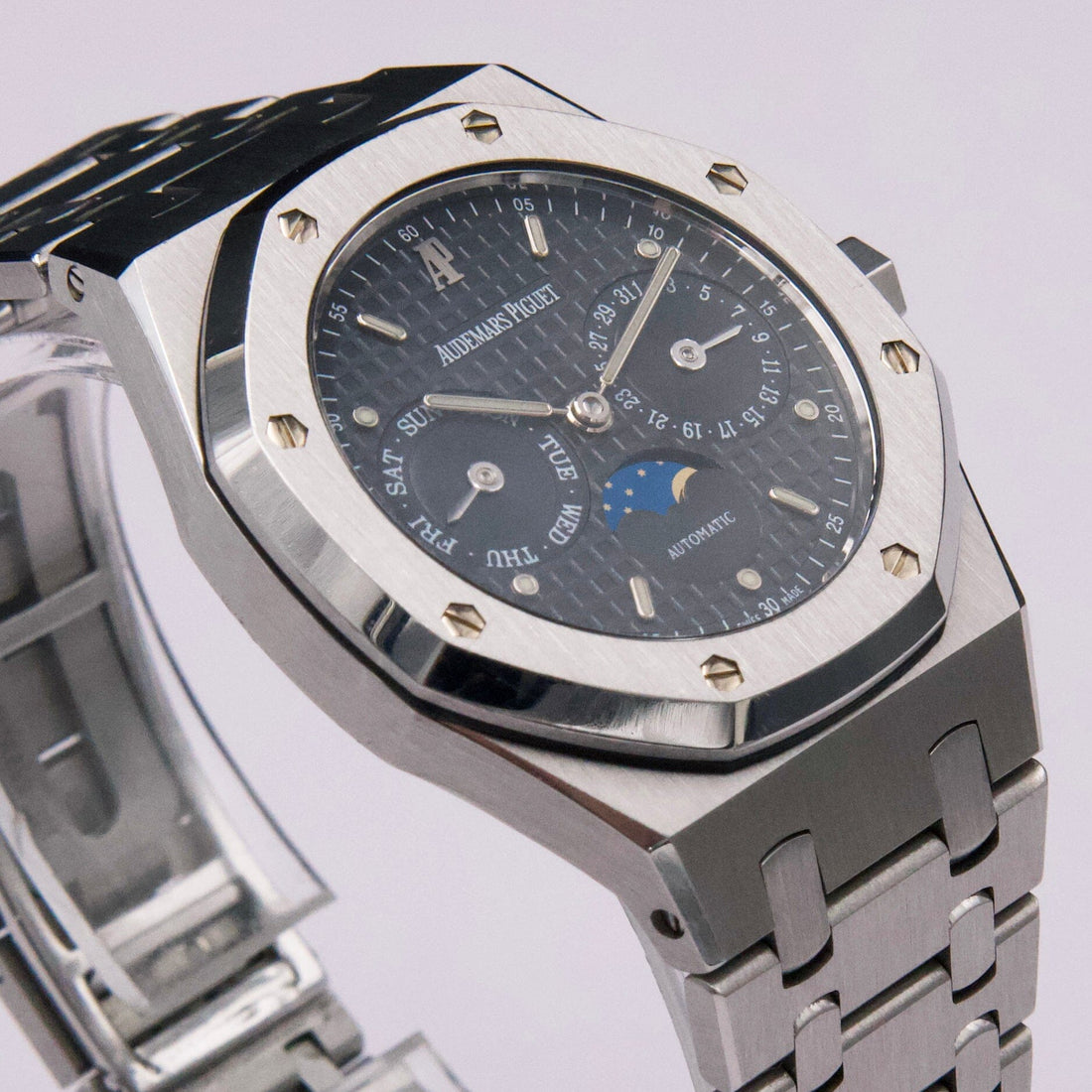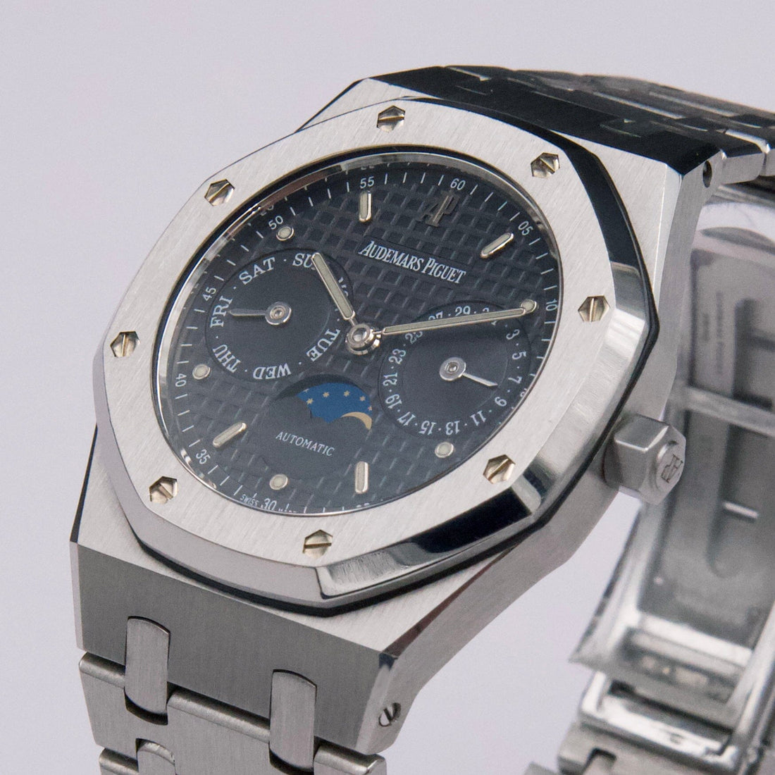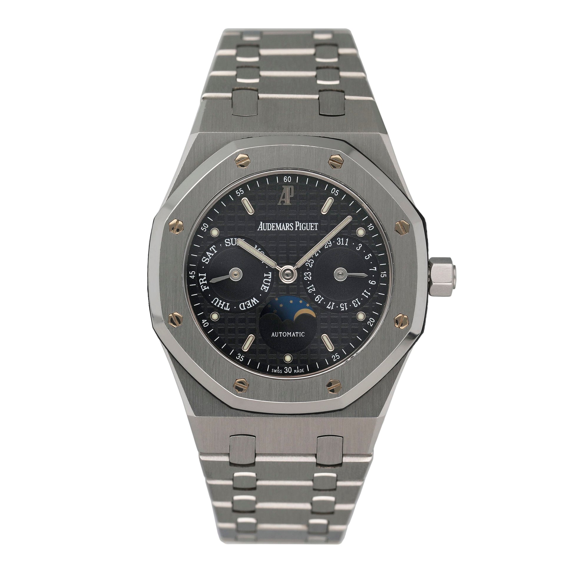 Audemars Piguet Royal Oak 25594ST Mens Watch. 36mm stainless steel case. Stainless steel octagon shape bezel. Blue dial with silver-tone luminous hands and index hour marker. Three sub-dial: date display at 3 o'clock, day display at 9 o'clock and moon phase display at 6 o'clock. Stainless steel bracelet with fold over steel clasp with single push button safety. Will fit up to 7-Inch wrist. Sapphire crystal. Stainless steel case back. Automatic self-winding movement.