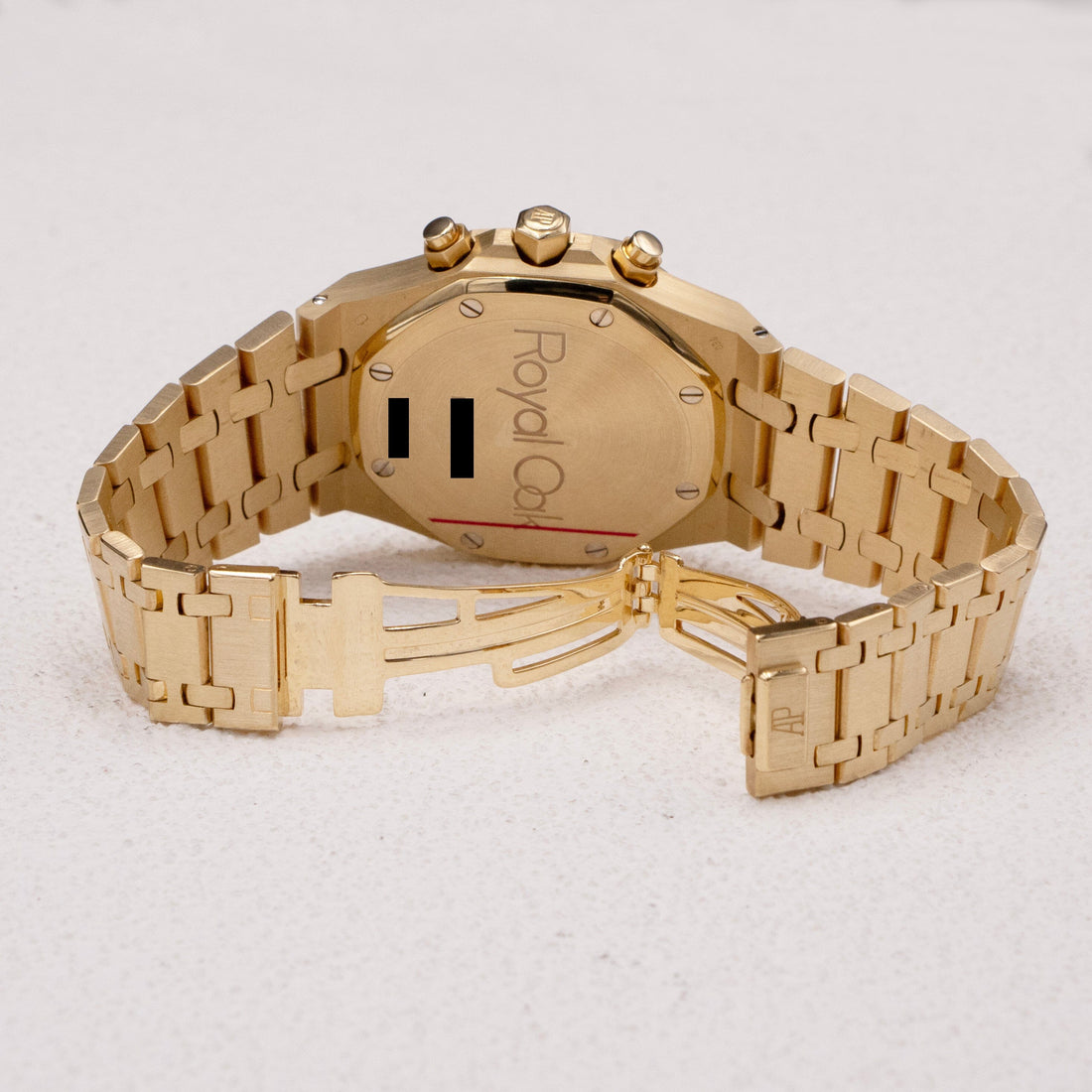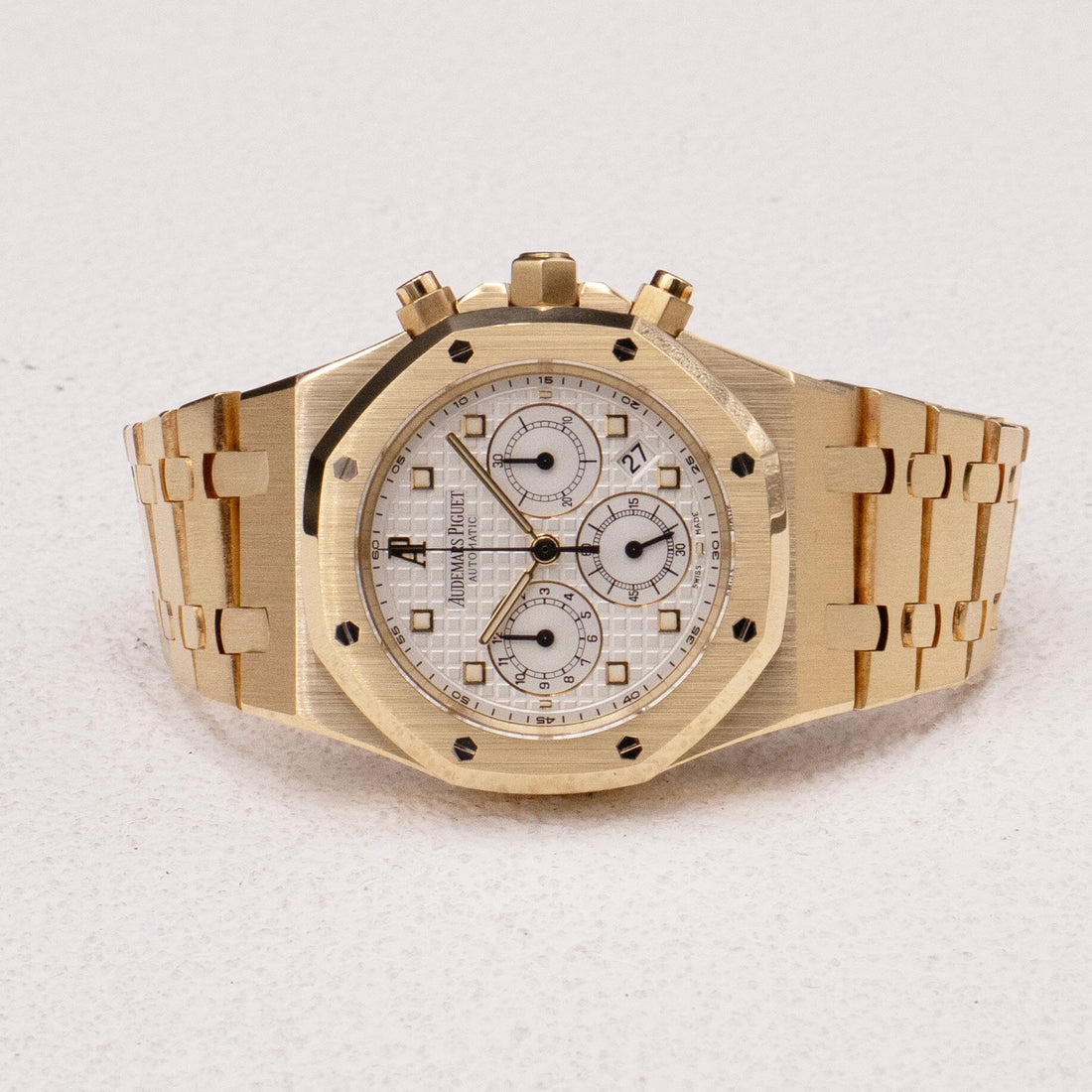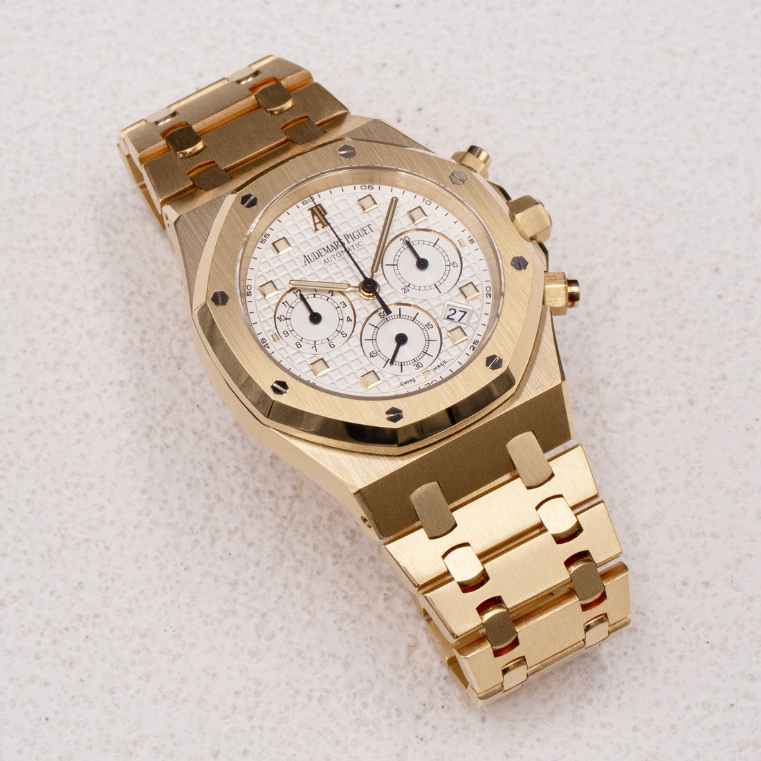 Audemars Piguet Royal Oak 25960BA.OO.1185BA.01 Mens watch. 39mm 18k yellow gold case. 18k yellow gold octagon bezel. White tapestry pattern dial with luminous hands and dot hour marker. Minute makers around the outer dial. Three sub-dial displaying: 60 second, 30 minute and 12 hour. Date display between 4 and 5 o'clock position. 18k yellow gold bracelet with fold over clasp with single push button safety. Will fit up to 6.75-inch wrist. Sapphire crystal. 18k yellow gold case back. Automatic self-winding movement.