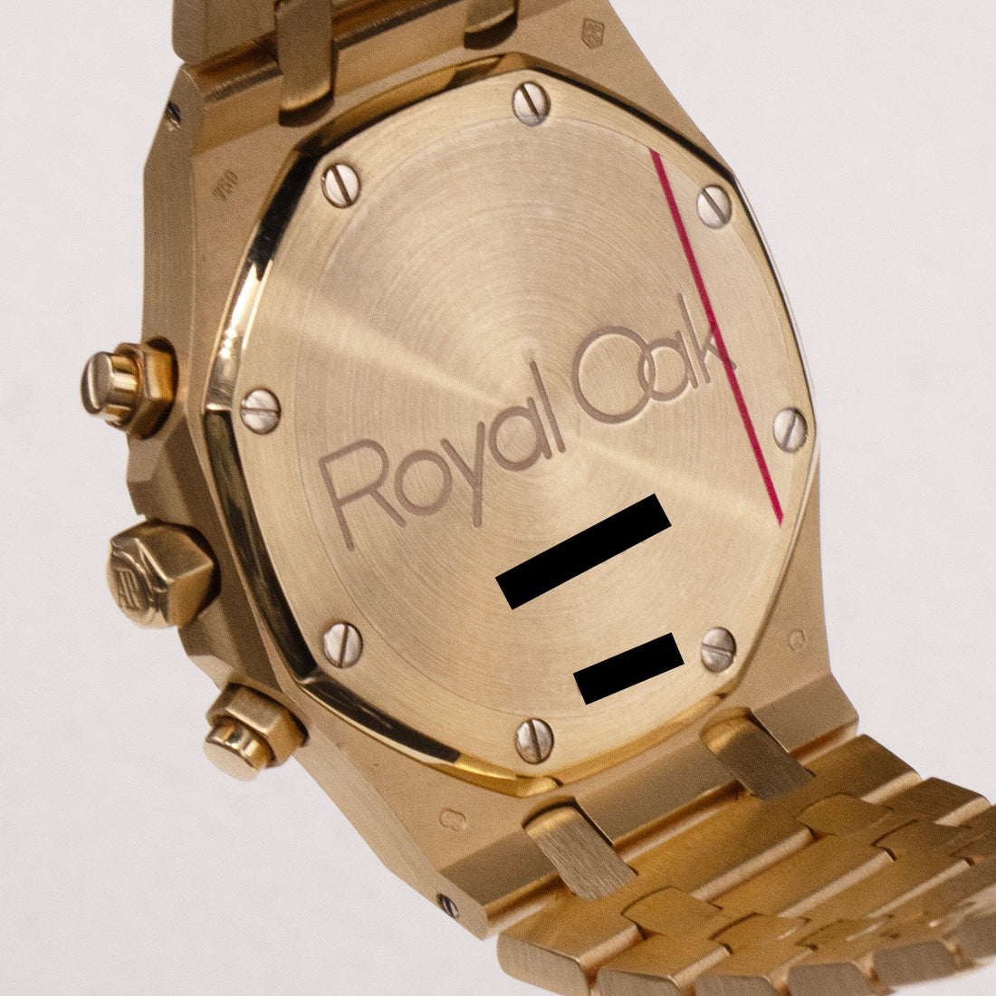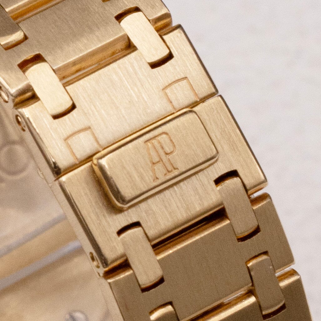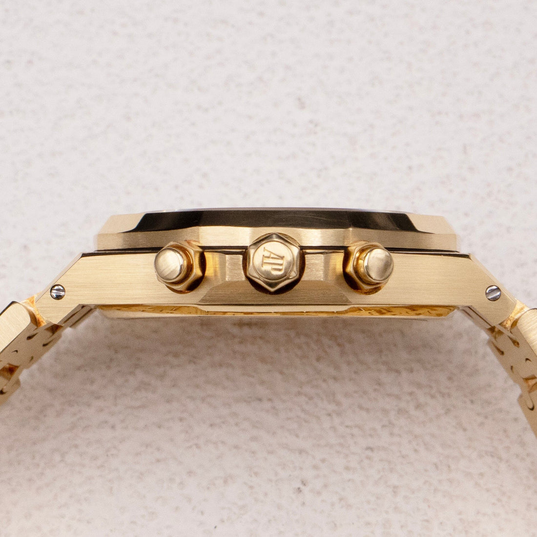 Audemars Piguet Royal Oak 25960BA.OO.1185BA.01 Mens watch. 39mm 18k yellow gold case. 18k yellow gold octagon bezel. White tapestry pattern dial with luminous hands and dot hour marker. Minute makers around the outer dial. Three sub-dial displaying: 60 second, 30 minute and 12 hour. Date display between 4 and 5 o'clock position. 18k yellow gold bracelet with fold over clasp with single push button safety. Will fit up to 6.75-inch wrist. Sapphire crystal. 18k yellow gold case back. Automatic self-winding movement.