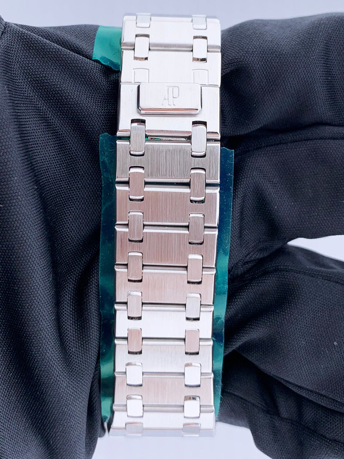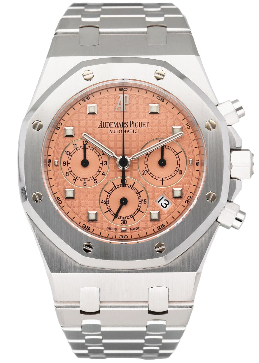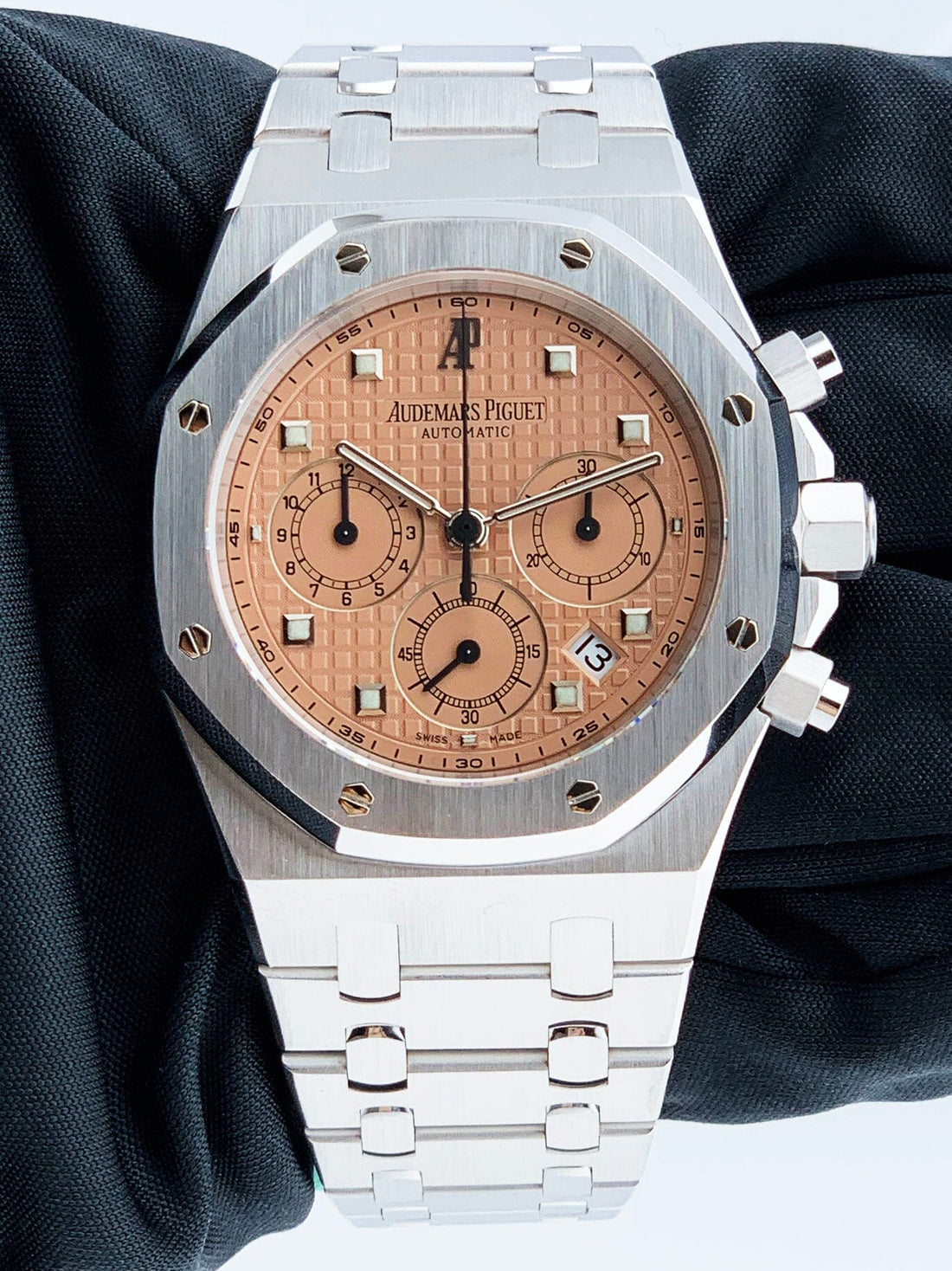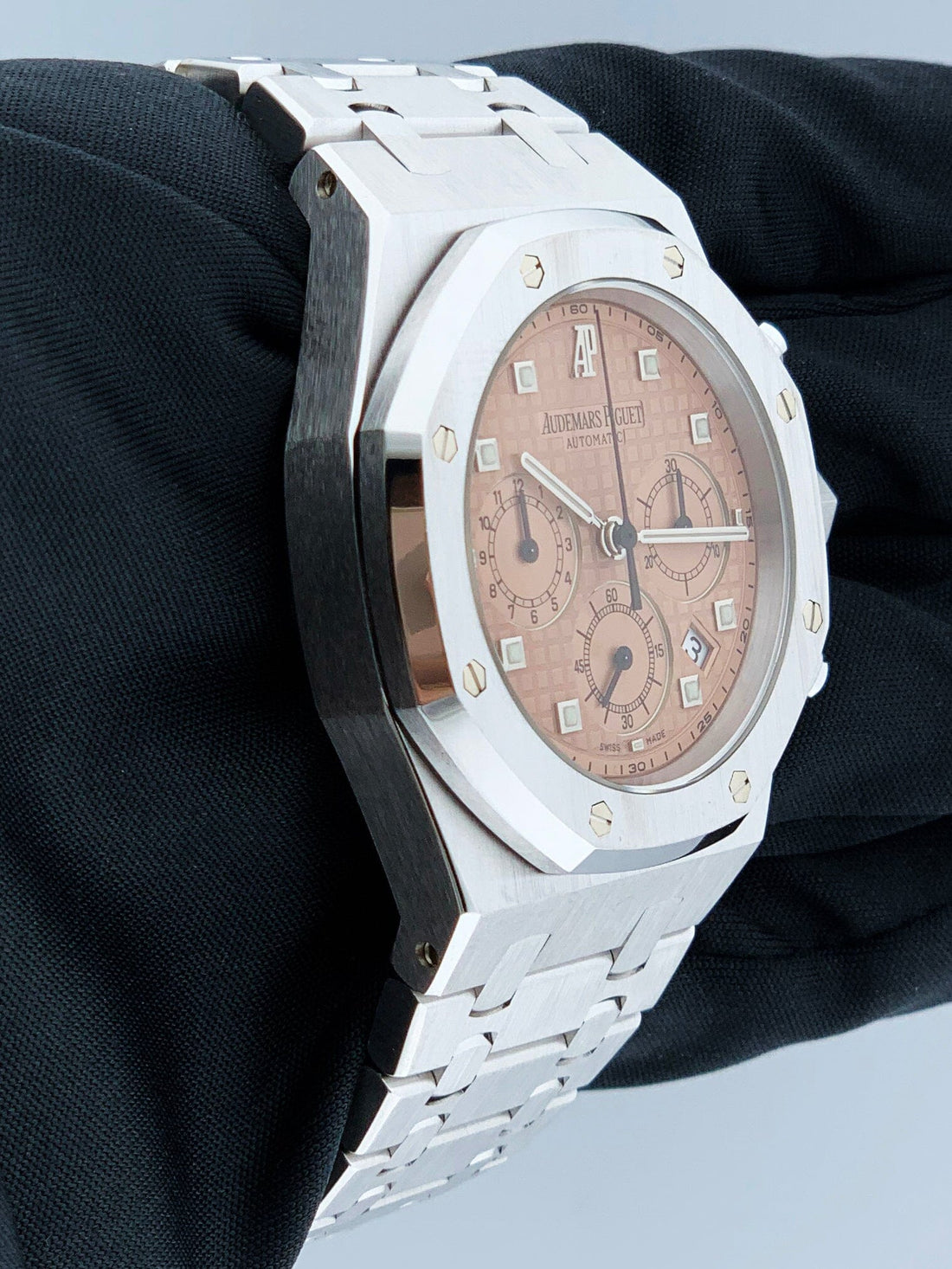 Audemars Piguet Royal Oak Mens watch. 39mm 18k white gold case with 18k white gold octagon bezel. Salmon tapestry pattern dial with luminous hands and dot hour marker. Minute makers around the outer dial. Three sub-dial displaying: 60 second, 30 minute and 12 hour. Date display between 4 and 5 o'clock position. 18k white gold bracelet with fold over clasp with single push button safety. Will fit up to 7-inch wrist. Sapphire crystal. 18k white gold case back. Calibre 2385 Automatic self-winding movement. This comes with the original Box and Papers.