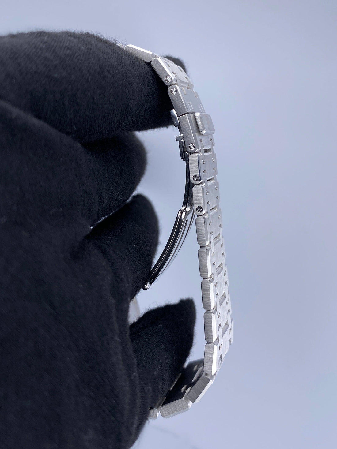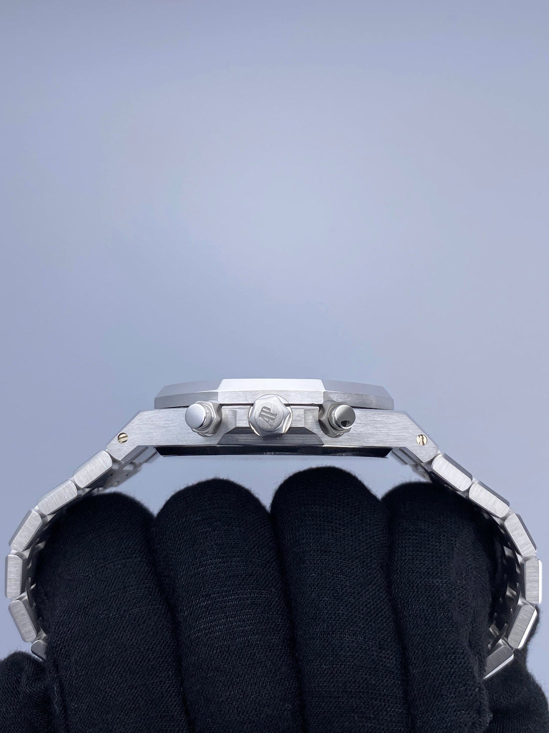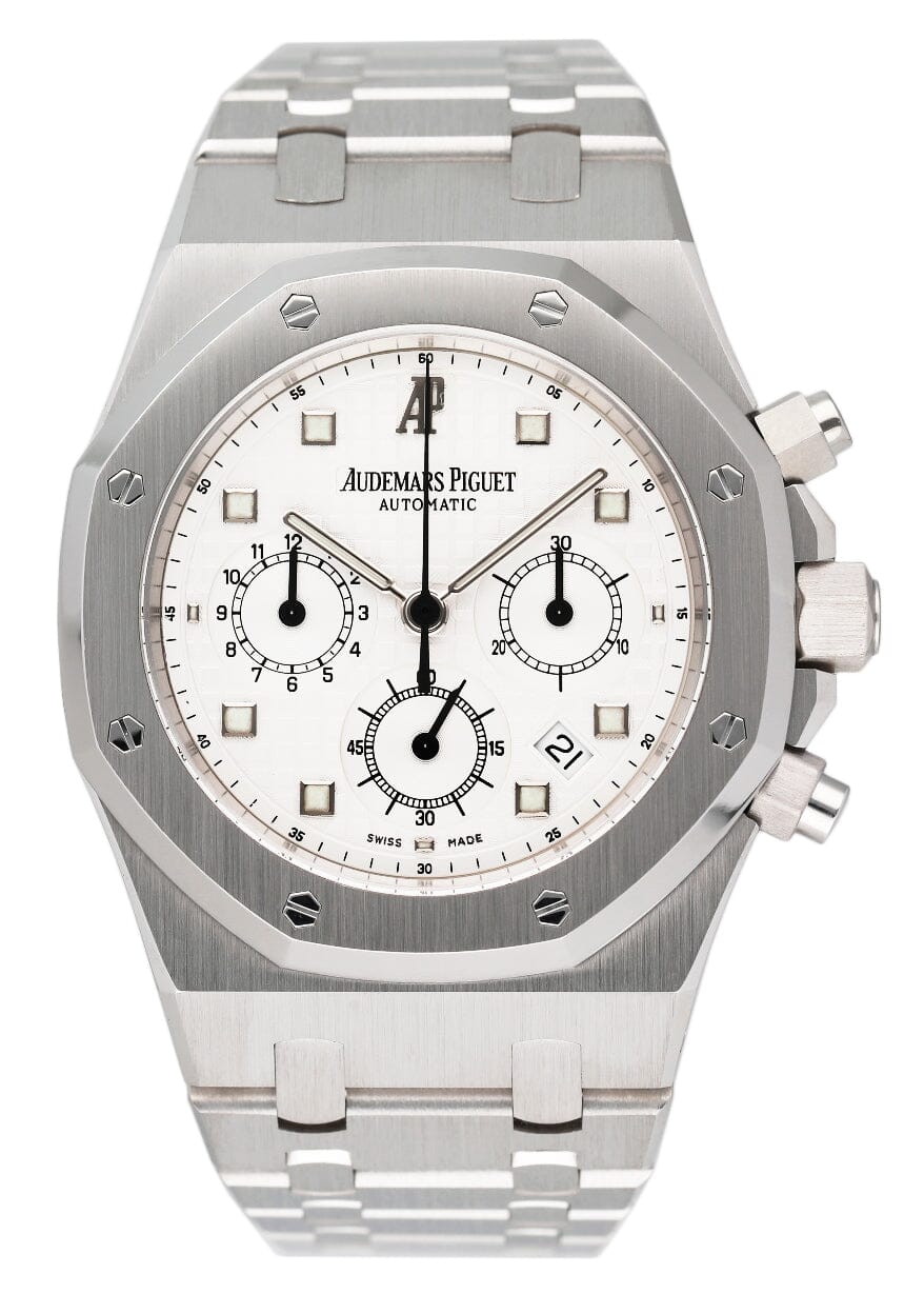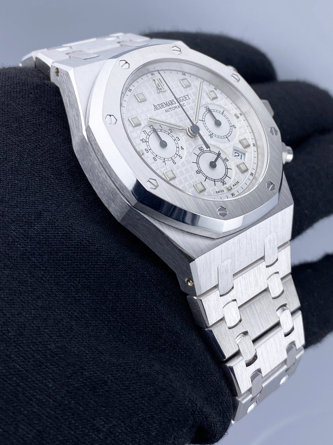 Audemars Piguet Royal Oak 25960BC.OO.1185BC.01 Mens watch. 39mm 18k white gold case with 18k white gold octagon bezel. White tapestry pattern dial with luminous hands and dot hour marker. Minute makers around the outer dial. Three sub-dial displaying: 60 second, 30 minute and 12 hour. Date display between 4 and 5 o'clock position. 18k white gold bracelet with fold over clasp with single push button safety. Will fit up to 7.5-inch wrist. Sapphire crystal. 18k white gold case back. Calibre 2385 Automatic self-winding movement.