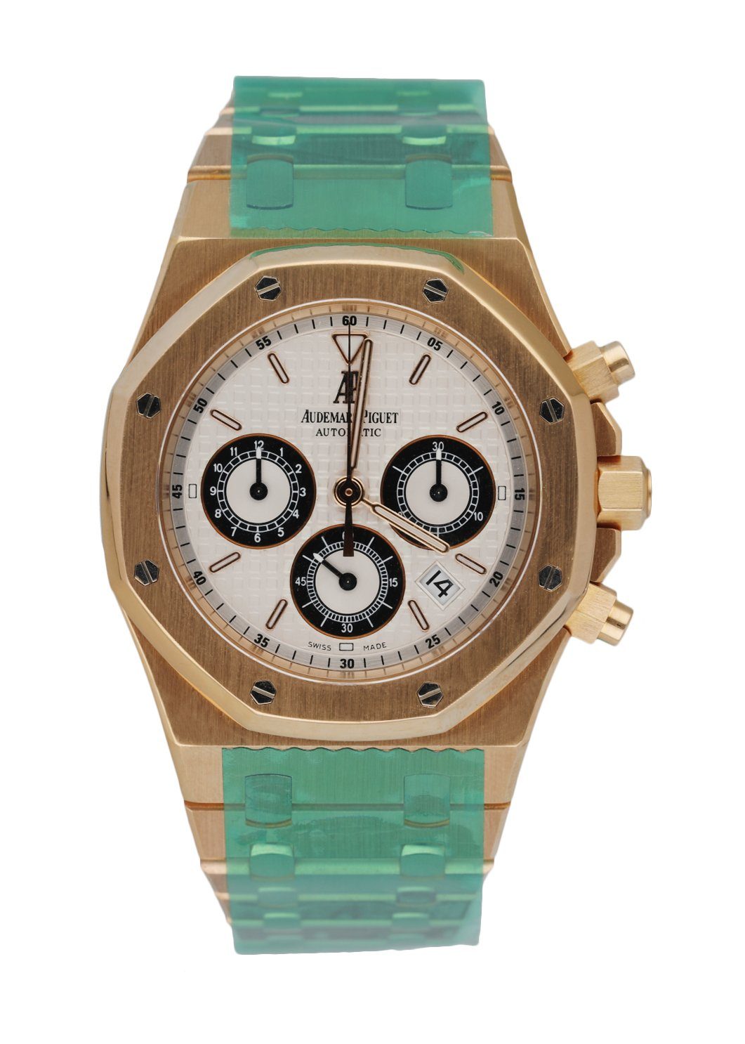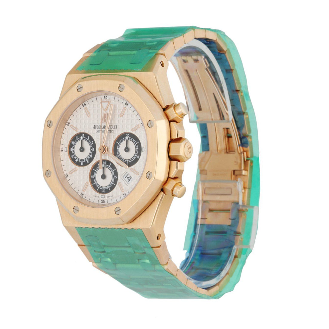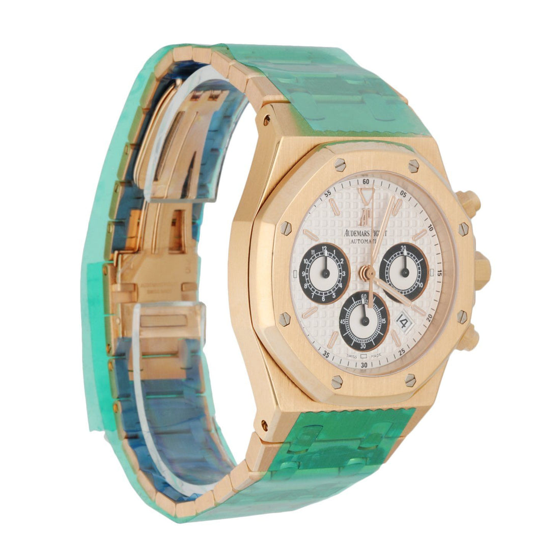 39mm rose gold case and octagonal shaped bezel. Metallic silvered dial with an engraved tapestry "waffle" design with luminous rose gold hands and index hour markers. Date display between the 4 and 5 o'clock position. Minute markers on the outer dial. Chronograph function: 12 hour register, minute and small second. 18K rose gold bracelet with 18K rose gold deployant clasp. Will fit up to 7.25-Inch wrist. Sapphire crystal and 18K rose gold case back. Automatic self-winding movement. This watch comes with original Box & Papers.