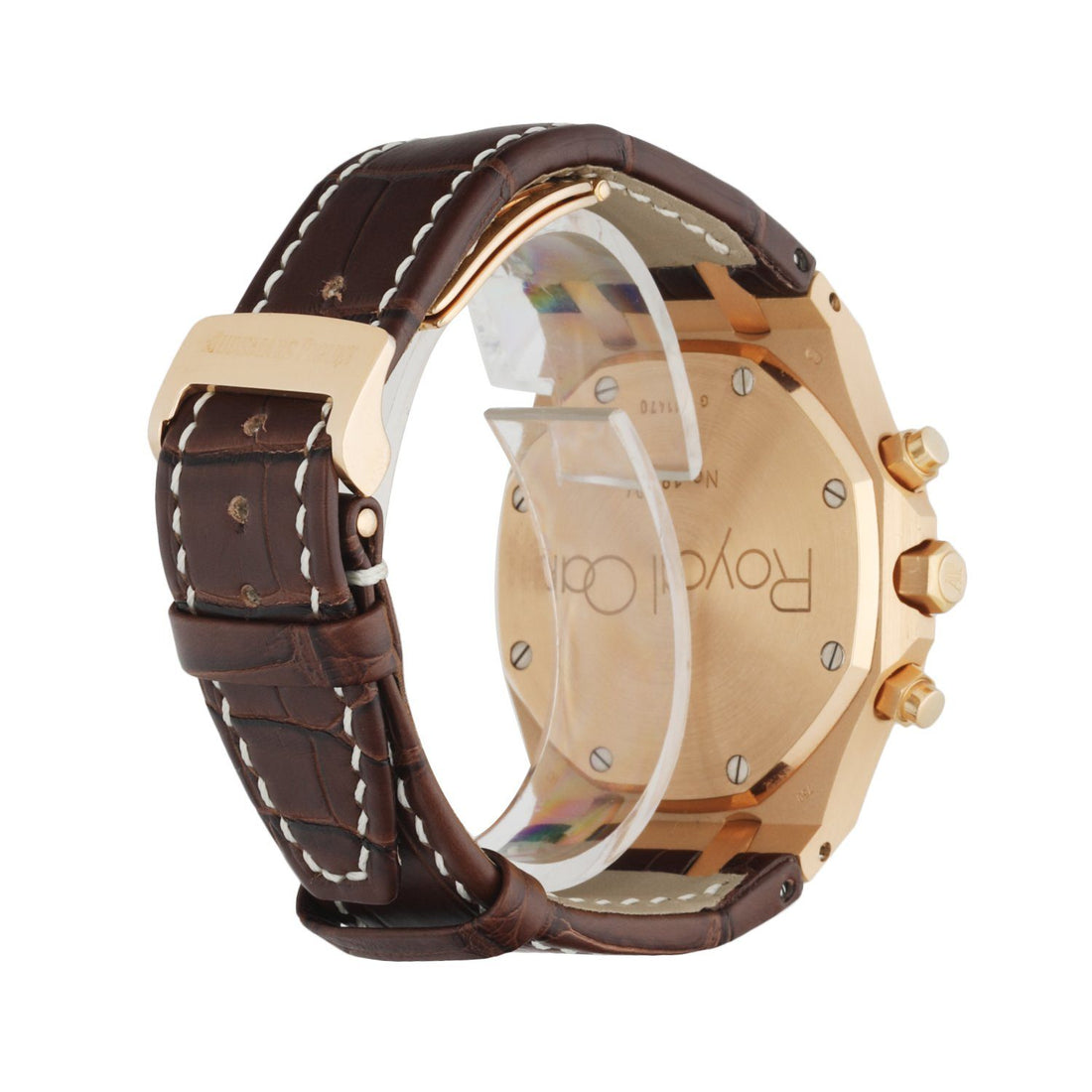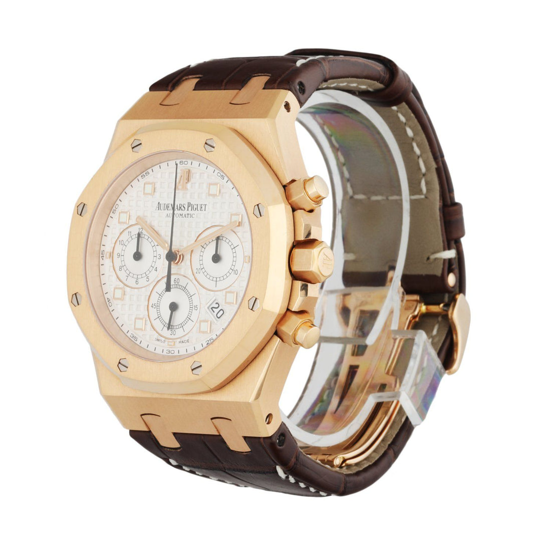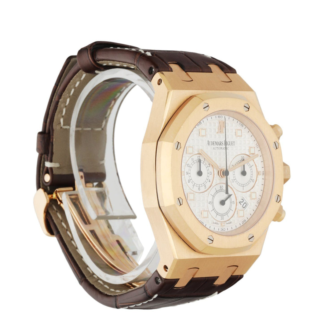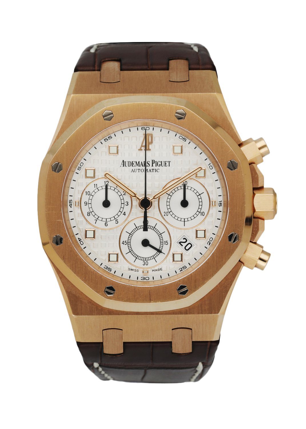 39mm rose gold case and octagonal shaped bezel. White dial with an engraved tapestry "waffle" design with luminous rose gold hands and index hour markers. Date display between the 4 and 5 o'clock position. Minute markers on the outer dial. Chronograph function: 12 hour register, minute and small second. Brown leather strap with 18K rose gold deployant clasp. Will fit up to 7.5-Inch wrist. Sapphire crystal and 18K rose gold case back. Automatic self-winding movement.