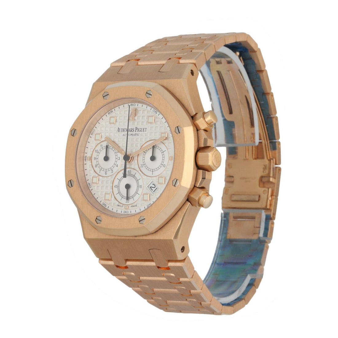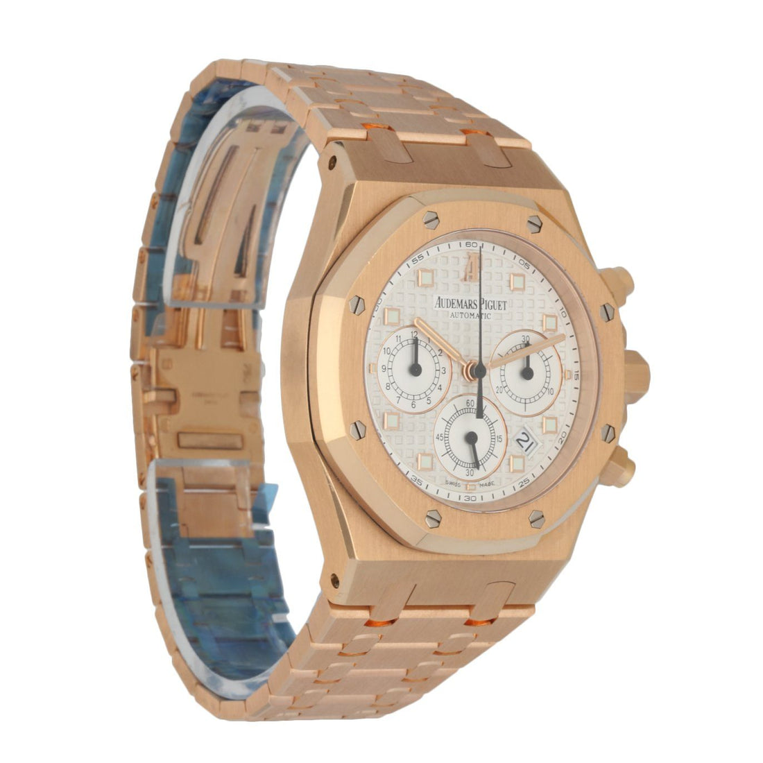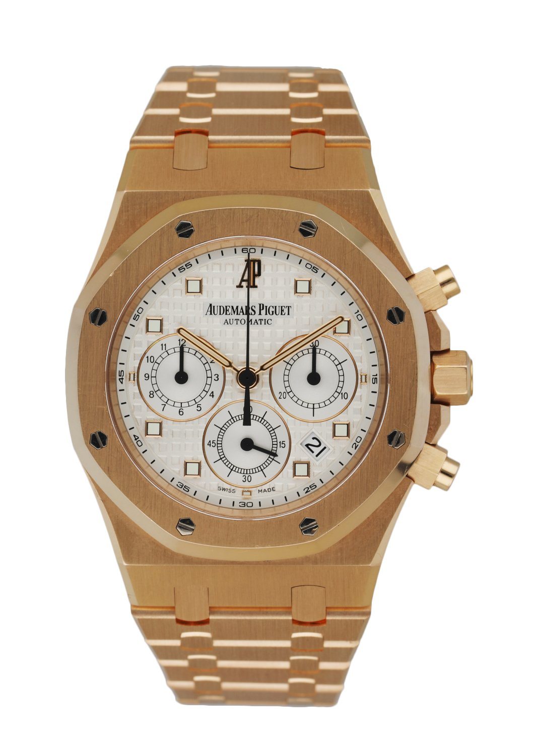 39mm rose gold case and octagonal shaped bezel. White dial with an engraved tapestry "waffle" design with luminous rose gold hands and index hour markers. Date display between the 4 and 5 o'clock position. Minute markers on the outer dial. Chronograph function: 12 hour register, minute and small second. 18K rose gold bracelet with 18K rose gold deployant clasp. Will fit up to 7.5-Inch wrist. Sapphire crystal and 18K rose gold case back. Automatic self-winding movement.