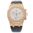 Audemars Piguet Royal Oak 26022OR.OO.D088CR.01 Mens Watch. 39mm 18K rose gold case and 18K rose gold octagonal shaped bezel. White tapestry dial with luminous rose gold hands and index hour markers. Date display between the 4 and 5 o'clock position. Minute markers on the outer dial. Chronograph function: column-Wheel chronograph movement; Large central seconds counter hand; 30-minutes sub-dial counter located at the 3 o'clock position; 12-hours sub-dial counter located at the 9 o'clock position. Brown leather strap with 18K rose gold deployant clasp. Will fit up to 7-Inch wrist. Sapphire crystal. 18K rose gold case back. Automatic self-winding movement.