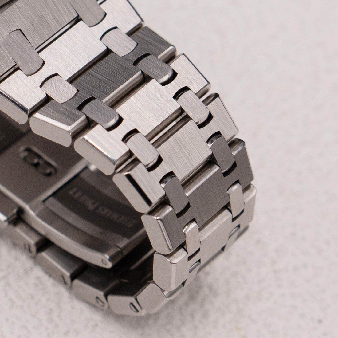 Audemars Piguet Royal Oak 26120ST.OO.1220ST.03 Mens Watch. 36.00mm stainless steel case. stainless steel bezel. Black dial and index hour markers. Power Reserve Indicator. Date Indicator. bracelet with stainless steel fold over clasp with safety. Will fit up to 7.00-inch wrist. Sapphire crystal. Stainless steel case back. Automatic movement.