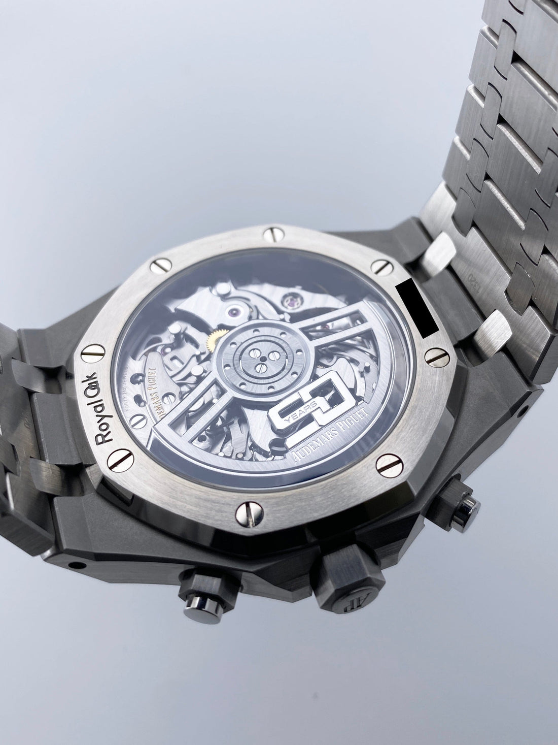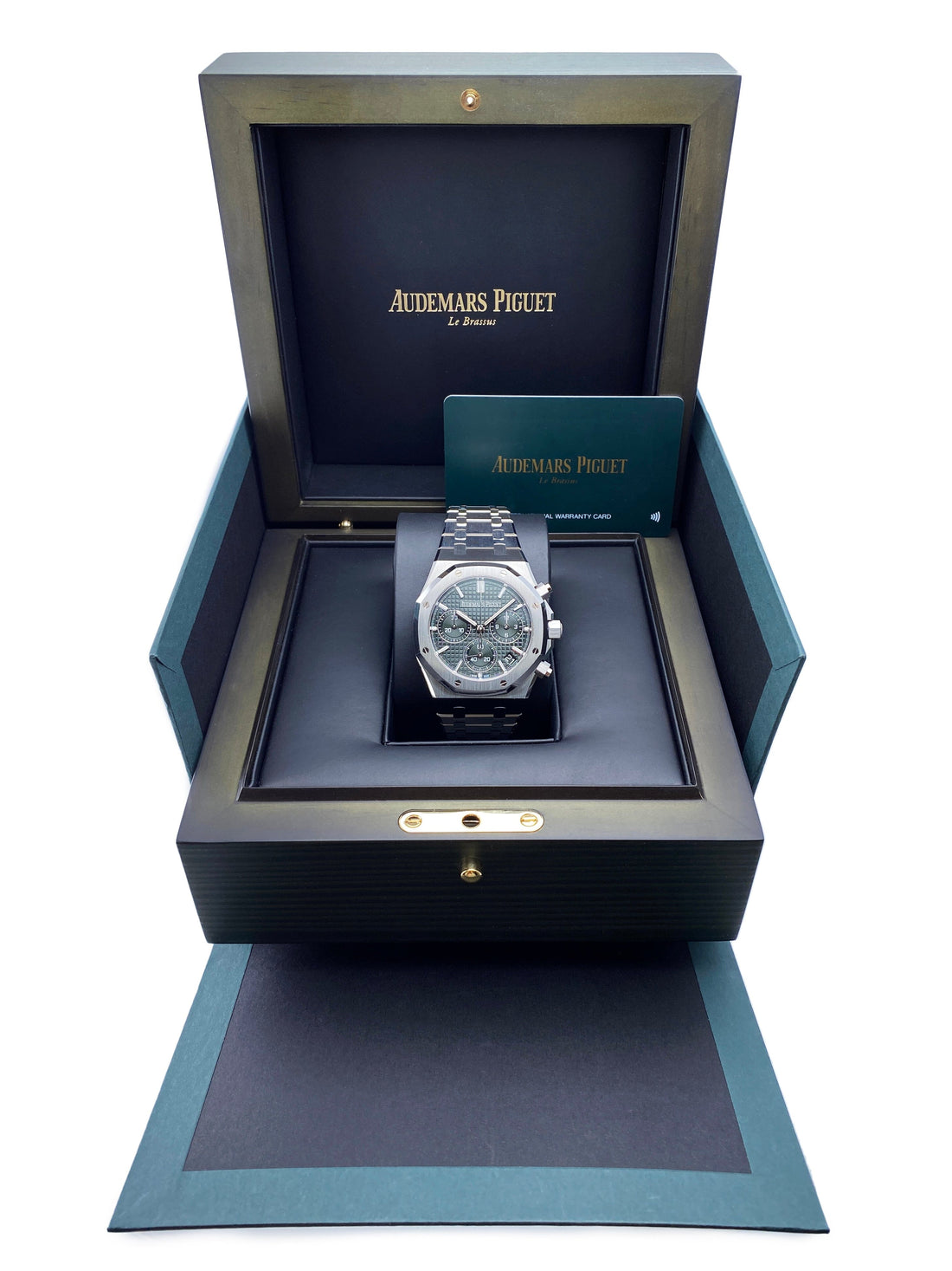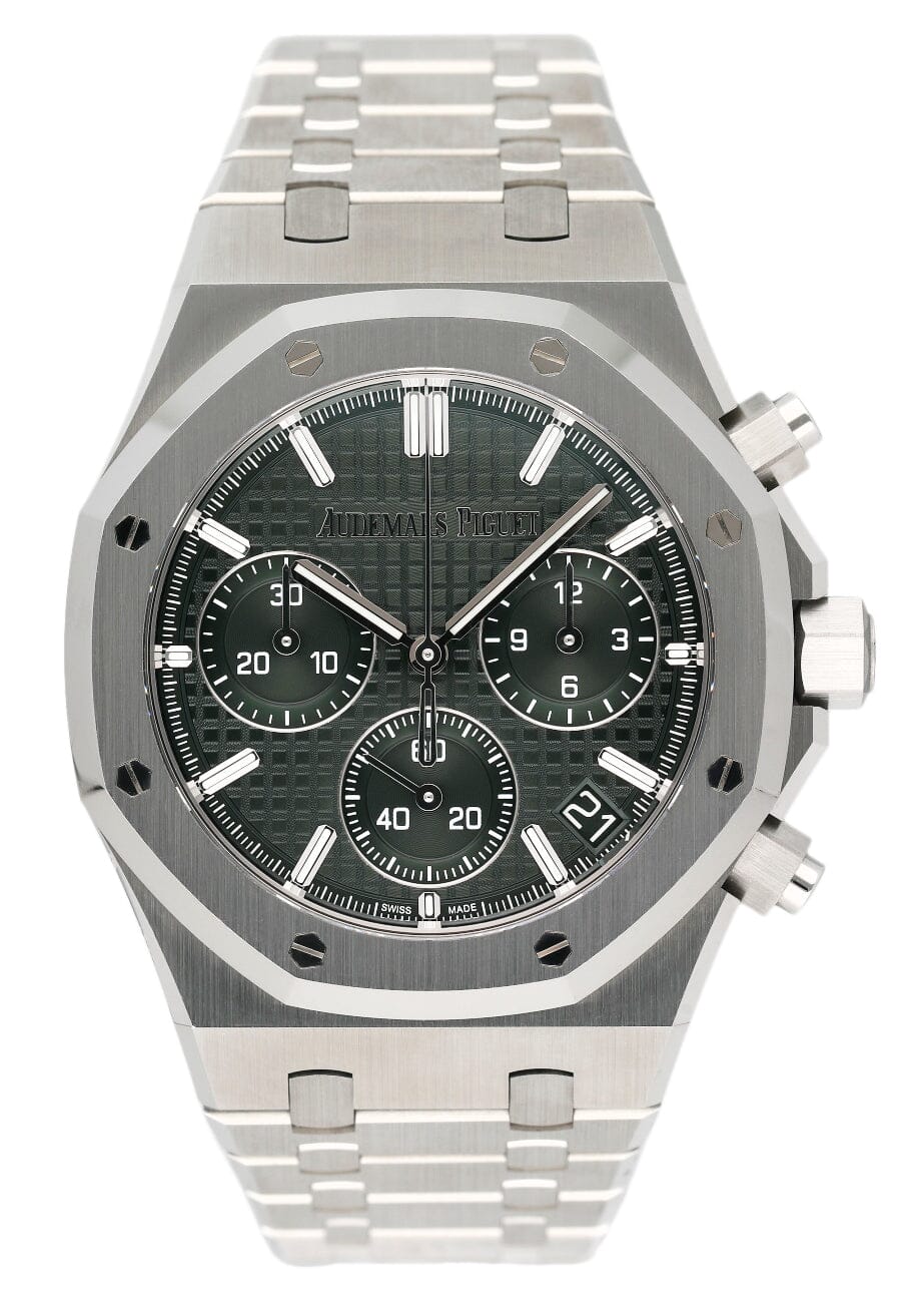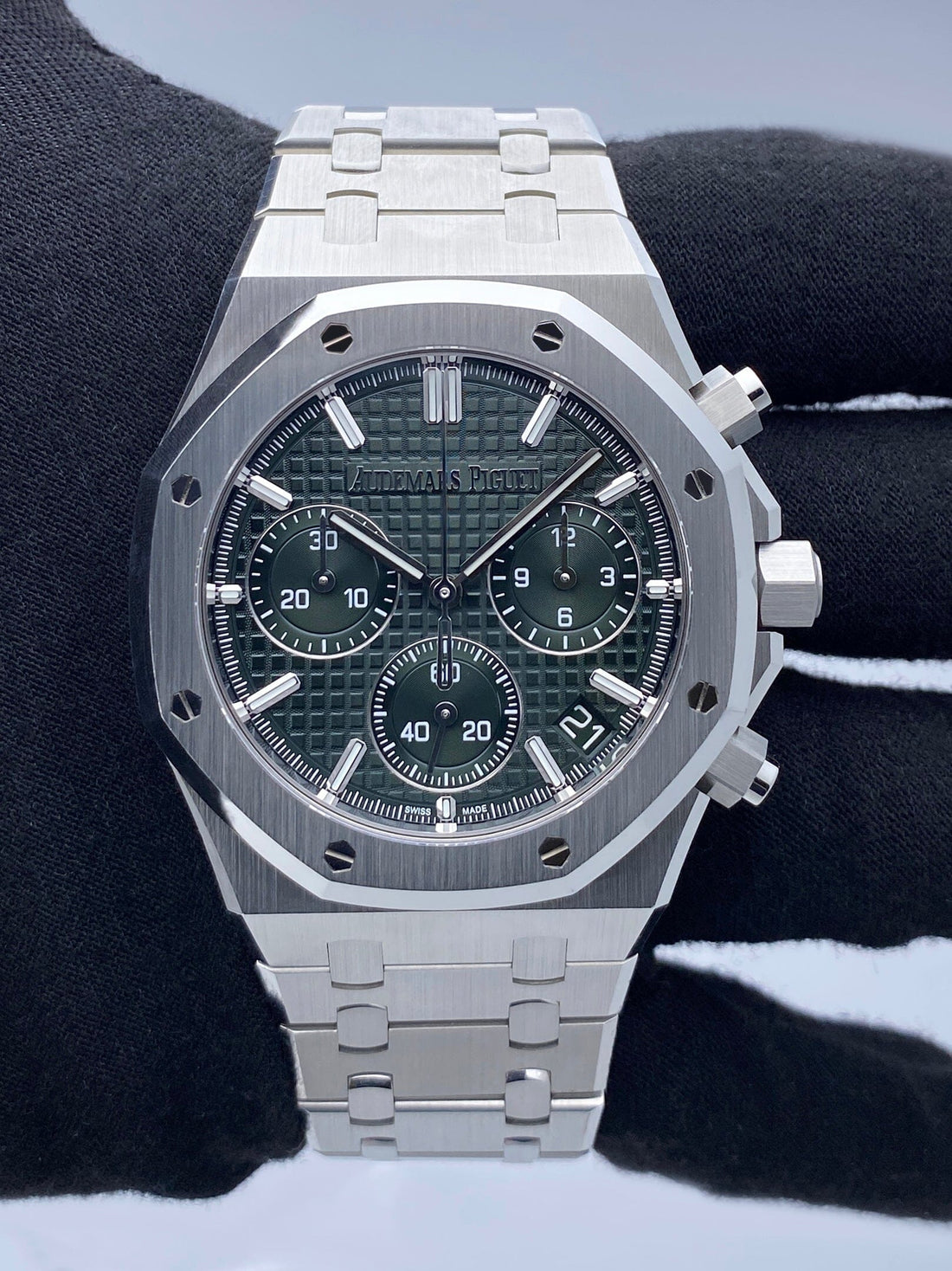 Audemars Piguet Royal Oak 26240ST.OO.1320ST.04 Mens Watch. 41mm stainless steel case with octagon shaped bezel. Khaki green Tapisserie dial with luminous steel hands and index hour markers. Date display between 4 & 5 o'clock. Three black sub-dials. Small seconds hand at 6 o'clock. 30-minute counter at 9 o'clock. 12-hour counter at 3 o'clock. Stainless steel bracelet with fold over clasp with hidden double push button. Will fit up to a 7.5-inch wrist. Sapphire crystal. Stainless steel case back. Automatic self-winding movement. This watch comes with original Box and Papers.