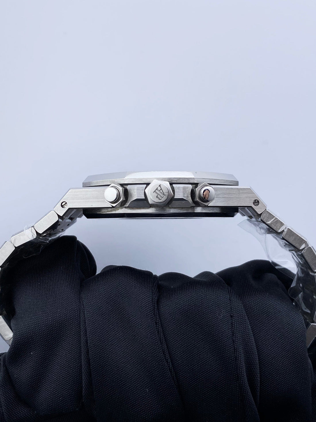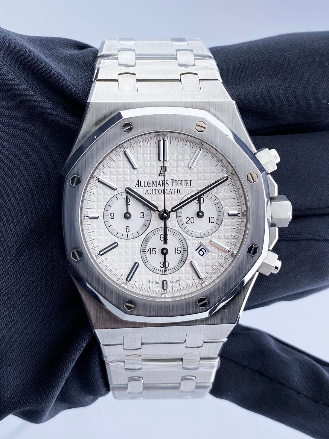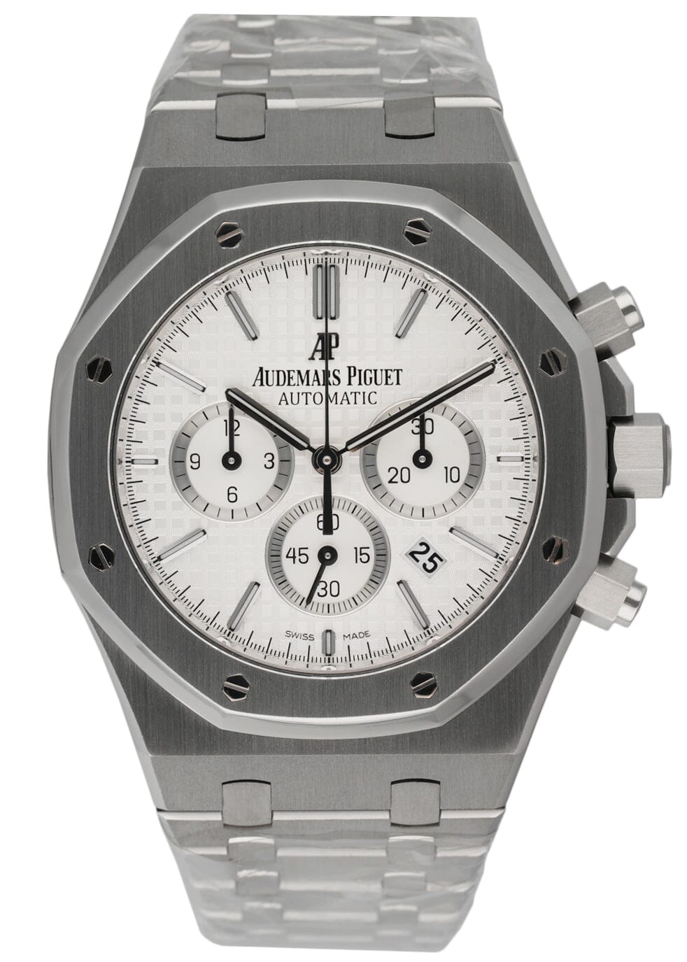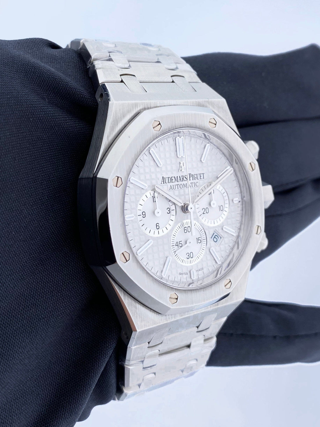 Audemars Piguet 26320ST.OO.1220ST.02 Royal Oak Mens Watch. 41mm stainless steel case with octagon shape bezel. White tapestry dial with steel luminous hands and index hour marker. Subdials: small second, minute and 12 hour. Date display between 4 & 5 o'clock position. Stainless steel bracelet with hidden clasp double push button safety. Will fit up to 7.5-Inch wrist. Sapphire crystal. Stainless steel case back. Calibre 2385 Automatic self-winding movement. This watch comes with Box and Papers.