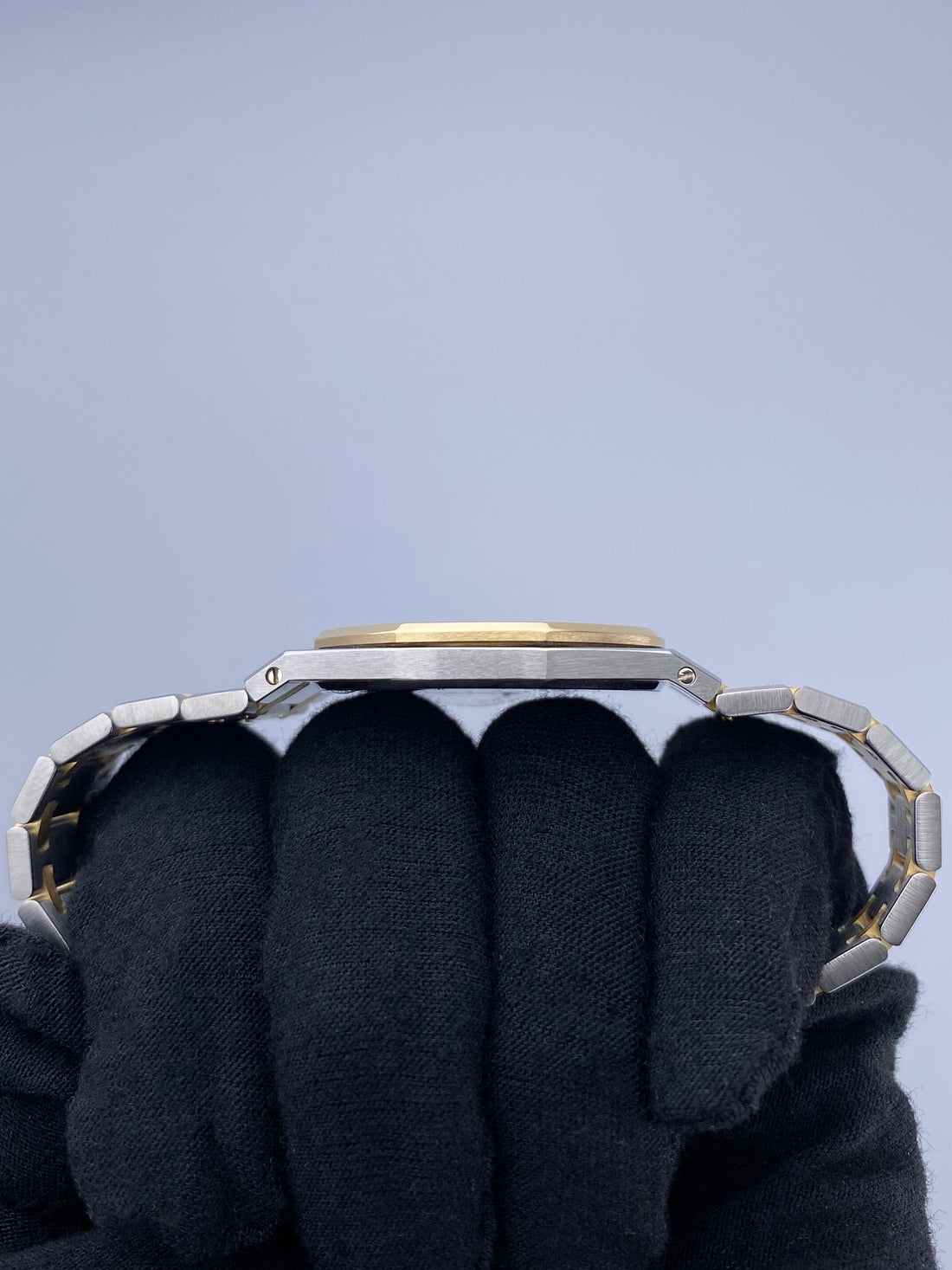 Audemars Piguet Royal Oak Watch. 33mm stainless steel case. 18K yellow gold octagon-shaped fixed bezel. Champagne grande tapisserie pattern dial with gold hands and index hour markers. 18K yellow gold & stainless steel bracelet with fold-over clasp with single push-button. Will fit up to a 7-inch wrist. Sapphire crystal. Stainless steel case back. Quartz: Battery powered movement.