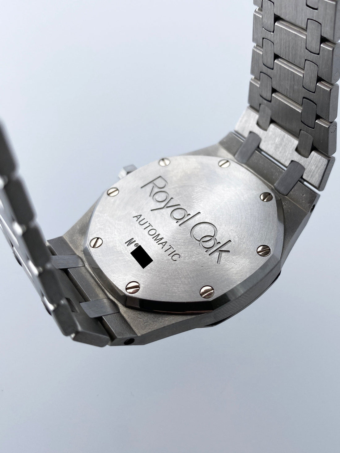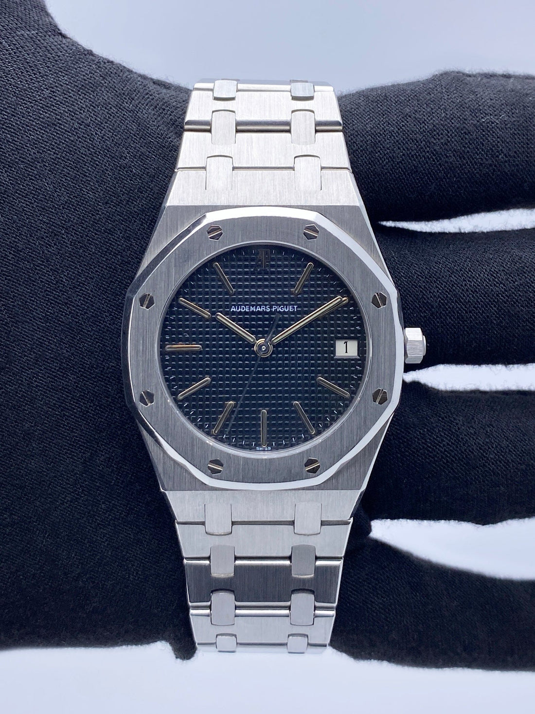 Audemars Piguet Royal Oak 56023ST Mens Watch. 35mm stainless steel case with stainless steel octagon bezel. Black tapestry dial with luminous steel hands and index hour marker. Minute markers on the outer dial. Date display at 3 o'clock position. Stainless steel bracelet with fold over clasp with a push button safety. Will fit up to 7-Inch wrist. Sapphire crystal. Stainless steel back case. Automatic self-winding movement.
