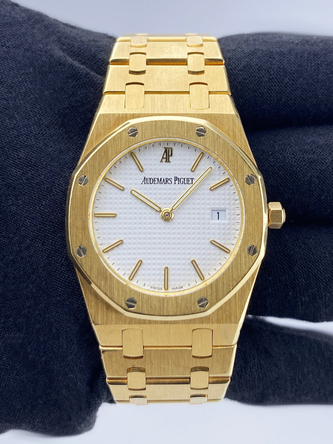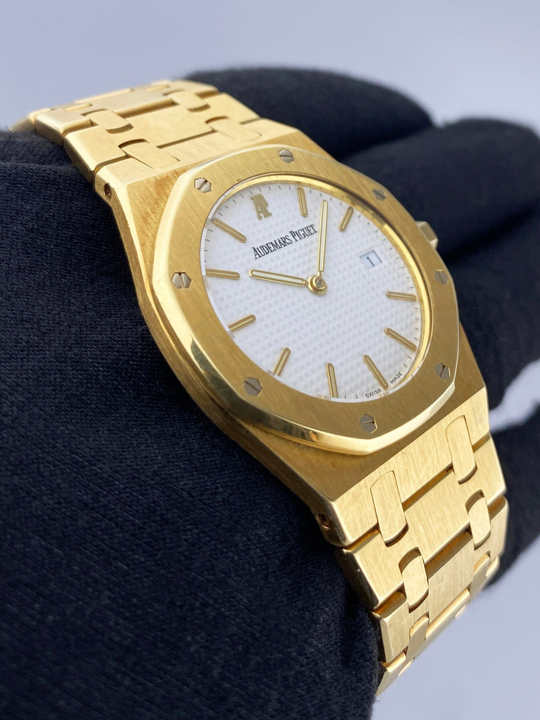 Audemars Piguet Royal Oak 56175BA Mens Watch. 33mm 18K yellow gold case with 18K yellow gold octagon-shaped fixed bezel. White tapisserie dial with gold-tone luminous hands and luminous index hour markers. The date is displayed at 3 o'clock position. 18K yellow gold bracelet with fold-over clasp with single push button safety. Will fit up to a 6 inch wrist. Sapphire crystal. 18K yellow gold case back. Quartz: Battery powered movement. This watch comes with Archives.