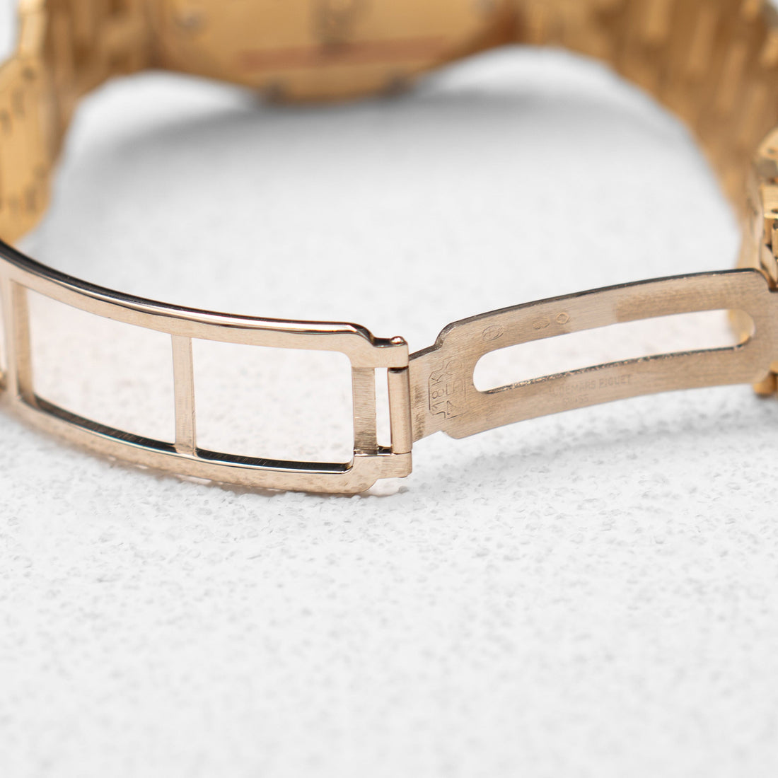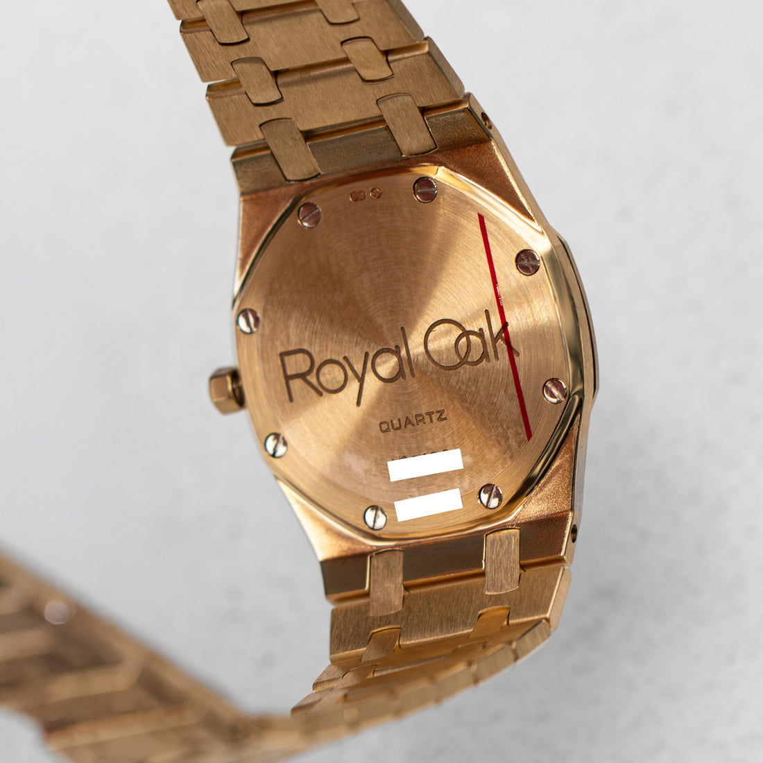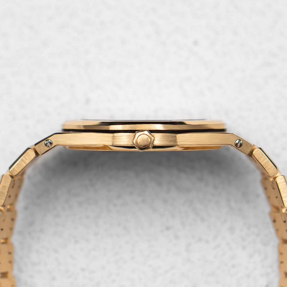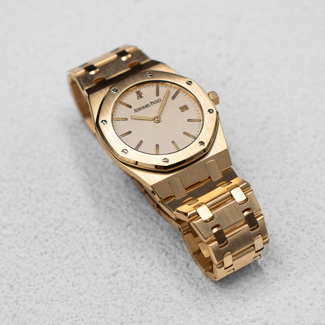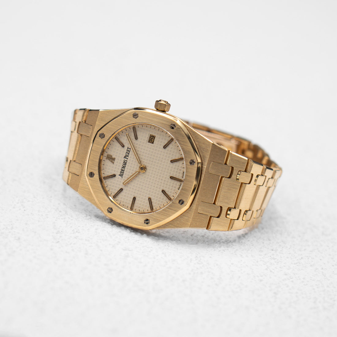 Audemars Piguet Royal Oak 56175BA.OO.0789BA.01 Watch. 33mm 18K yellow gold case with 18K yellow gold octagon-shaped fixed bezel. White tapisserie dial with gold-tone luminous hands and luminous index hour markers. The date is displayed at 3 o'clock position. 18K yellow gold bracelet with fold-over clasp with single push button safety. Will fit up to a 7-inch wrist. Sapphire crystal. 18K yellow gold case back. Quartz: Battery powered movement.