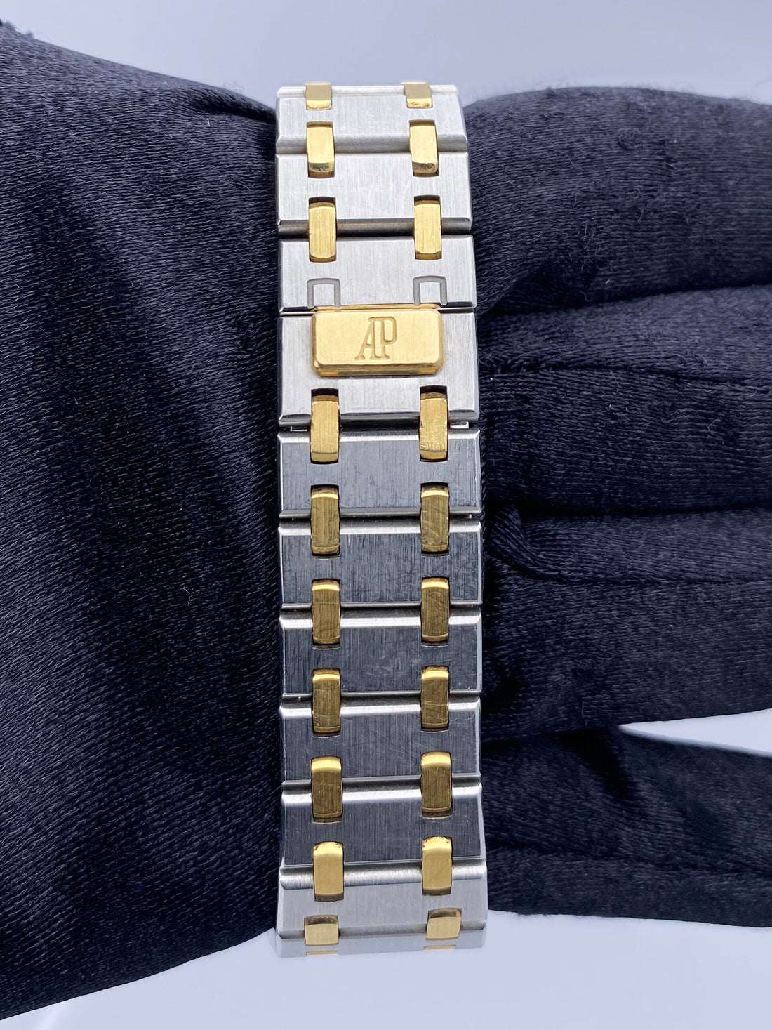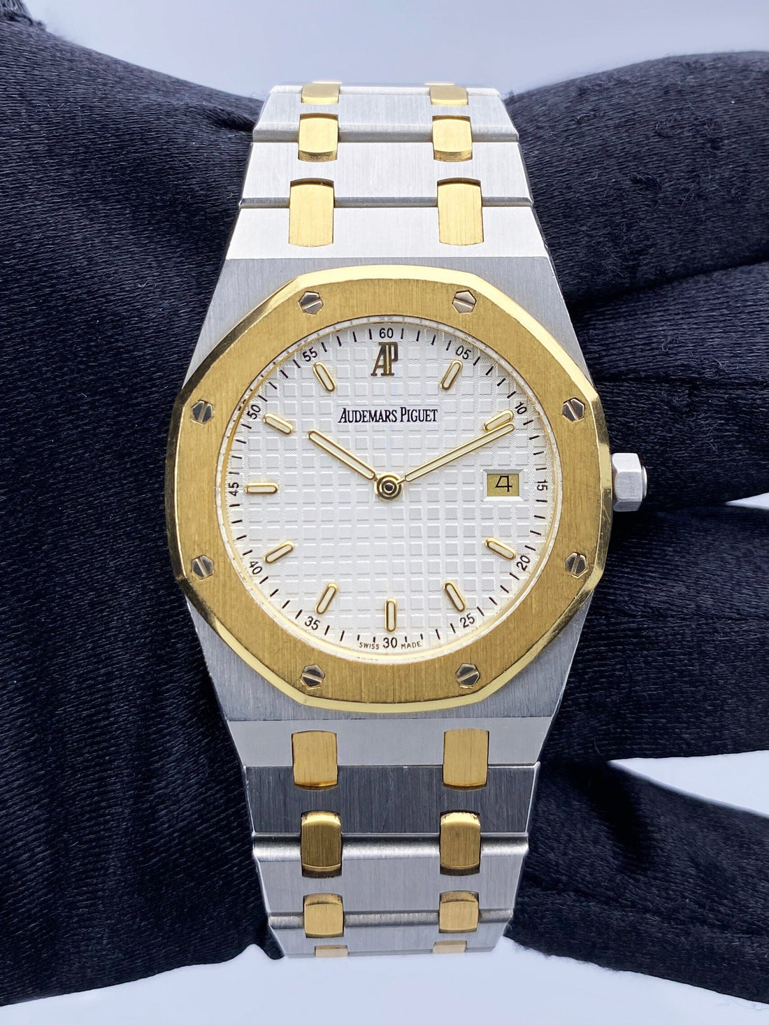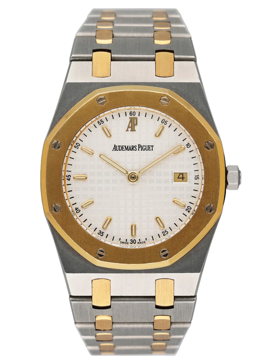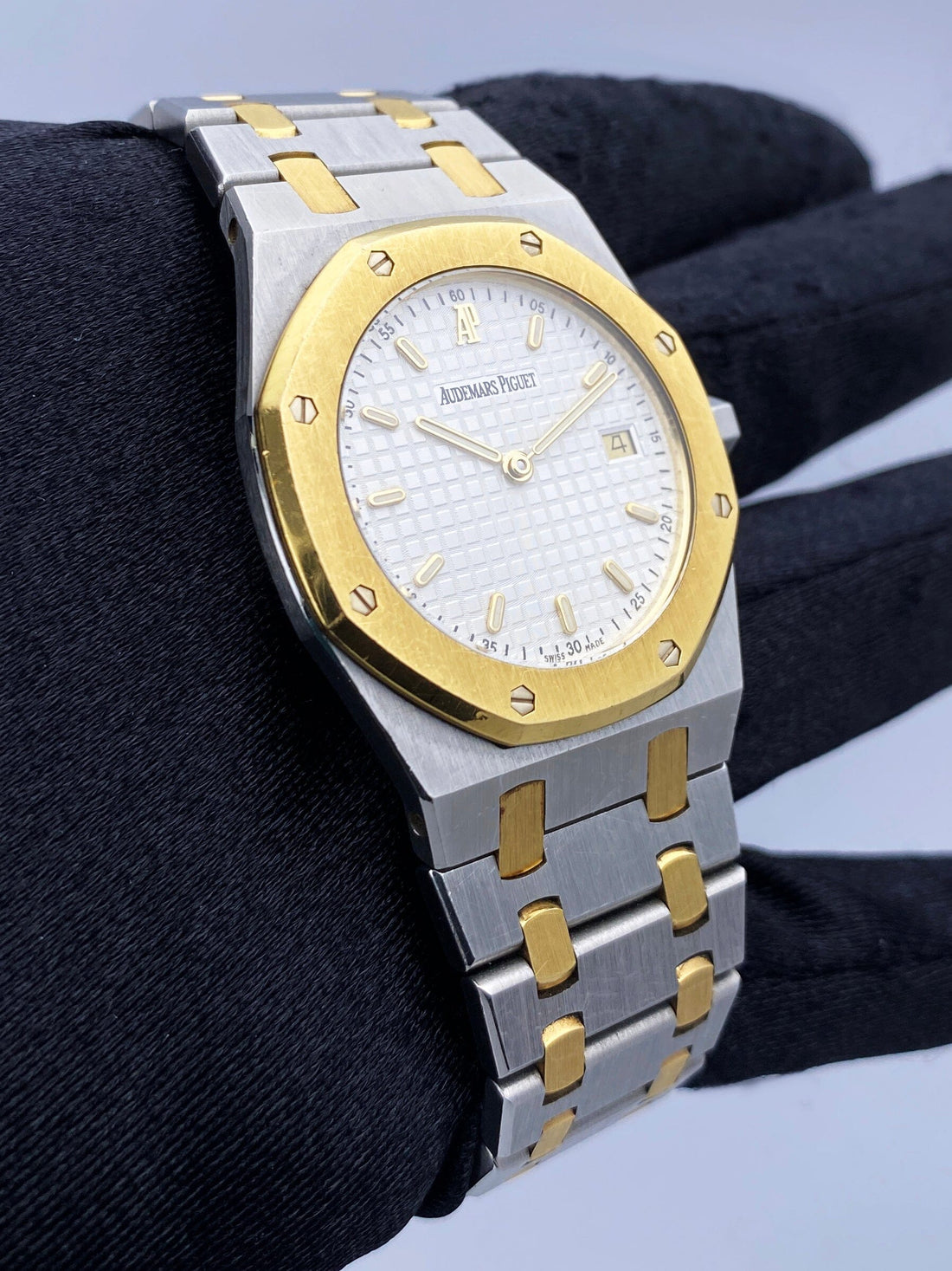 Audemars Piguet Royal Oak 56175SA Ladies Watch. 33mm stainless steel case with 18K yellow gold octagon-shaped fixed bezel. White tapestry pattern dial with gold luminous hands and index hour markers. Date display at 3 o'clock position. 18k yellow gold & stainless steel bracelet with hidden fold-over clasp with safety. Will fit up to a 6-inch wrist. Sapphire crystal. Stainless steel case back. Quartz: Battery powered movement.