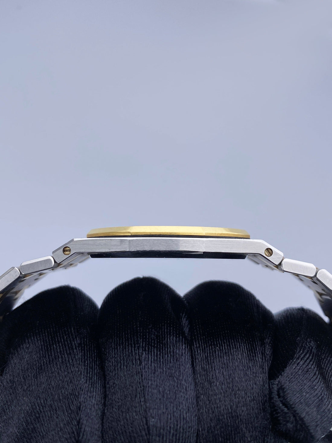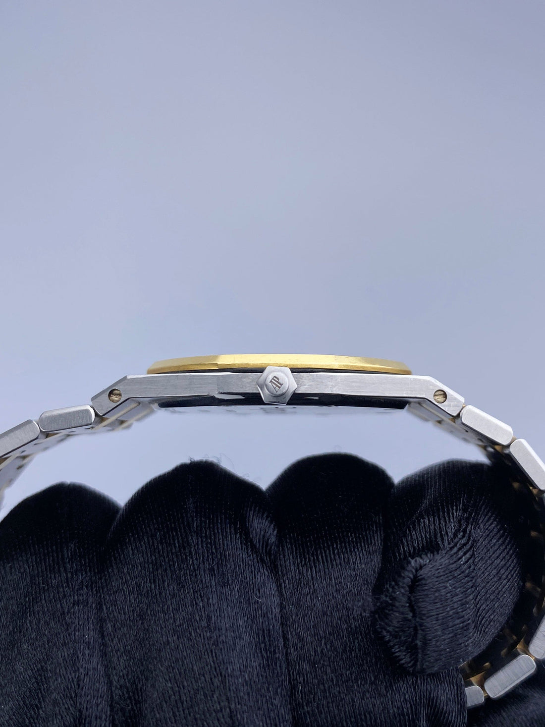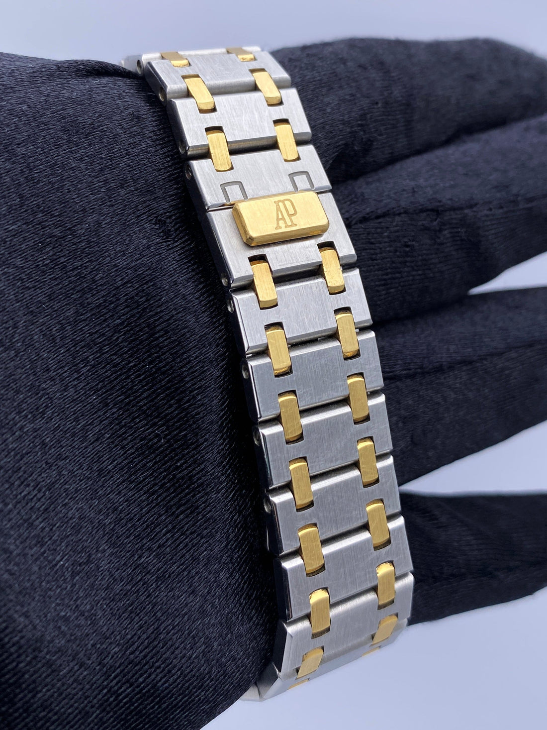 Audemars Piguet Royal Oak 56175SA Ladies Watch. 33mm stainless steel case with 18K yellow gold octagon-shaped fixed bezel. White tapestry pattern dial with gold luminous hands and index hour markers. Date display at 3 o'clock position. 18k yellow gold & stainless steel bracelet with hidden fold-over clasp with safety. Will fit up to a 6-inch wrist. Sapphire crystal. Stainless steel case back. Quartz: Battery powered movement.