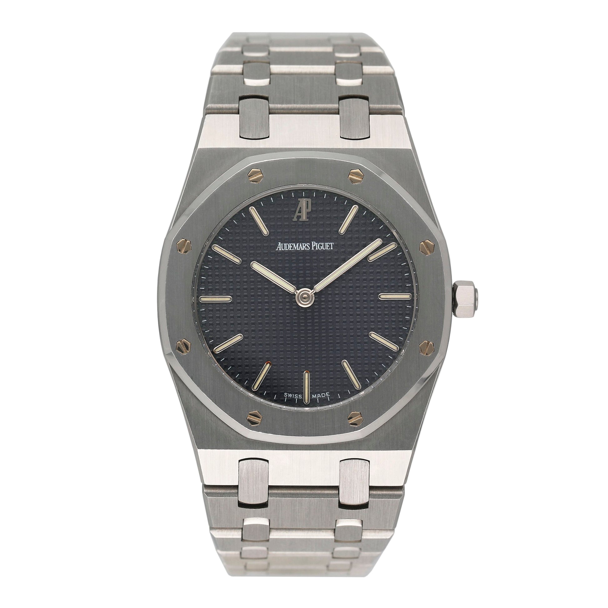 Audemars Piguet Royal Oak 56303ST Ladies Watch. 33mm stainless steel case. Stainless steel octagon-shaped fixed bezel. Blue tapestry pattern dial with gold luminous hands and index hour markers. Stainless steel bracelet with hidden fold-over clasp with single button push button safety. Will fit up to a 6.75-inch wrist. Sapphire crystal. Stainless steel case back. Quartz: Battery powered movement.