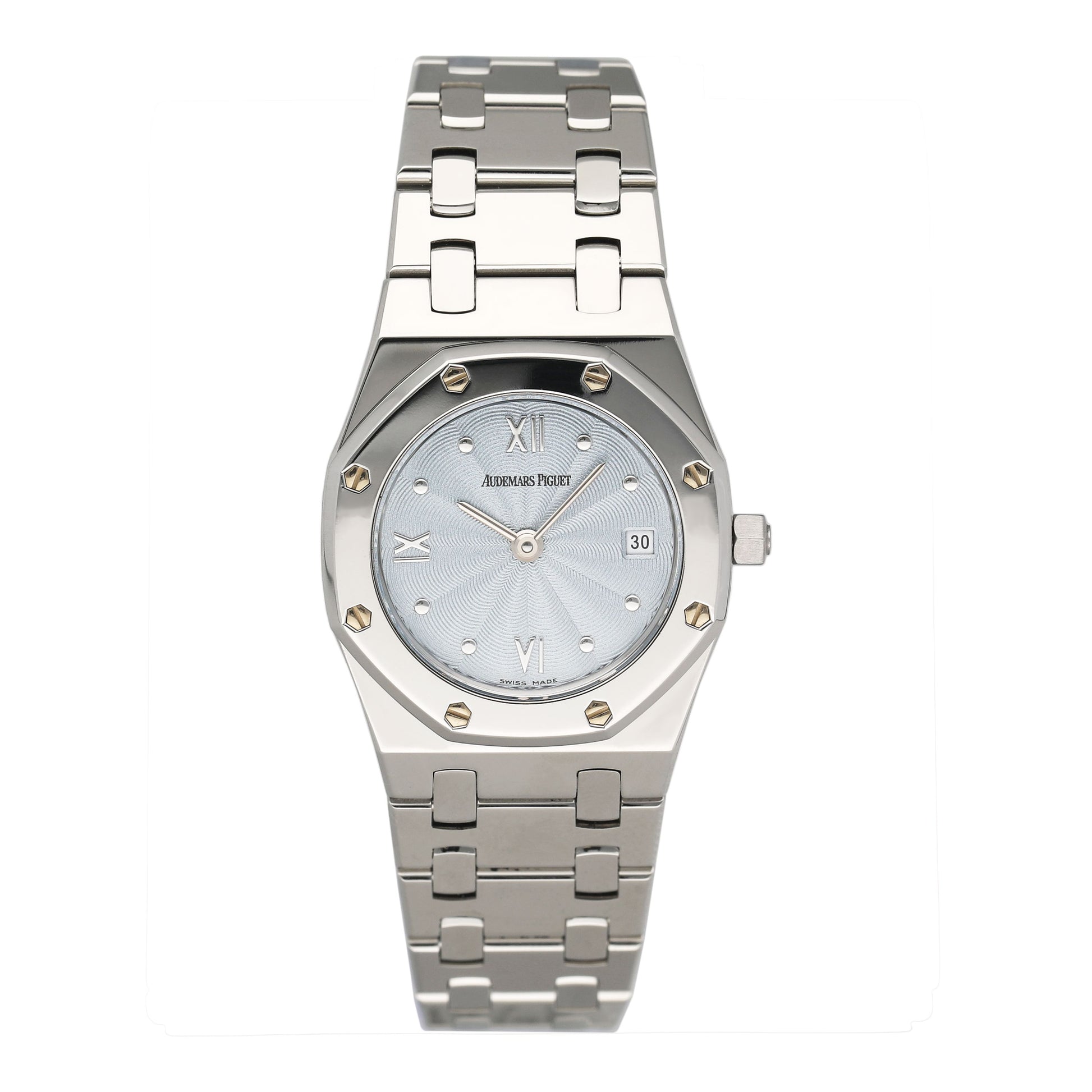 Audemars Piguet Royal Oak 67370ST.P.1120ST.01 Ladies Watch. 25mm stainless steel case. Stainless steel octagon shaped bezel. Ice Blue tapestry dial with silver-tone hands and Roman numeral & Index hour marker. Date display at 3 o'clock position. Stainless steel bracelet with stainless steel fold over clasp with single push button safety. Will fit up to 6-Inch wrist. Sapphire crystal. Stainless steel case back. Quartz: Battery powered movement.