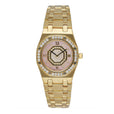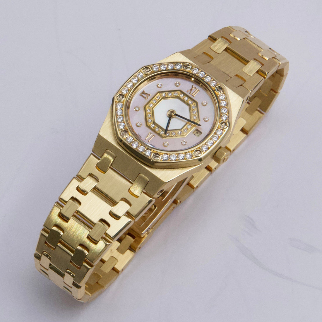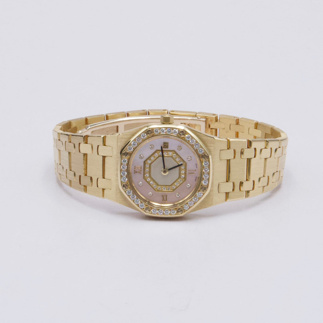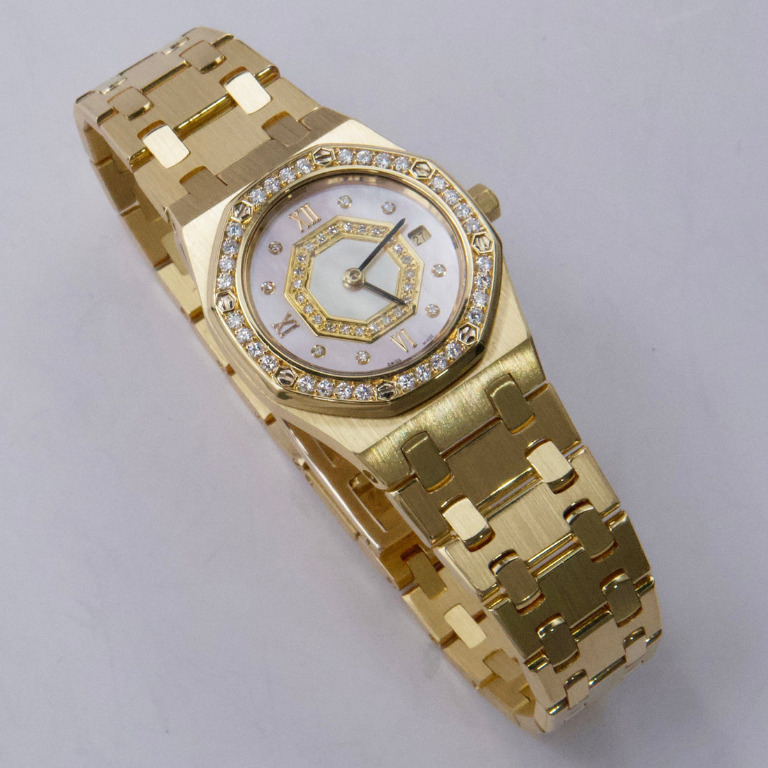 Audemars Piguet Royal Oak 67371BA Ladies Watch. 25mm 18K yellow gold case. 18K yellow gold octagon shaped bezel with factory diamonds. Pink Mother of Pearl dial with black hands and factory diamond hour marker. Date display at 3 o'clock position. 18K yellow gold bracelet with 18K yellow gold fold over clasp with single push button safety. Will fit up to 6-Inch wrist. Sapphire crystal. 18K rose gold case back. Quartz: Battery powered movement.