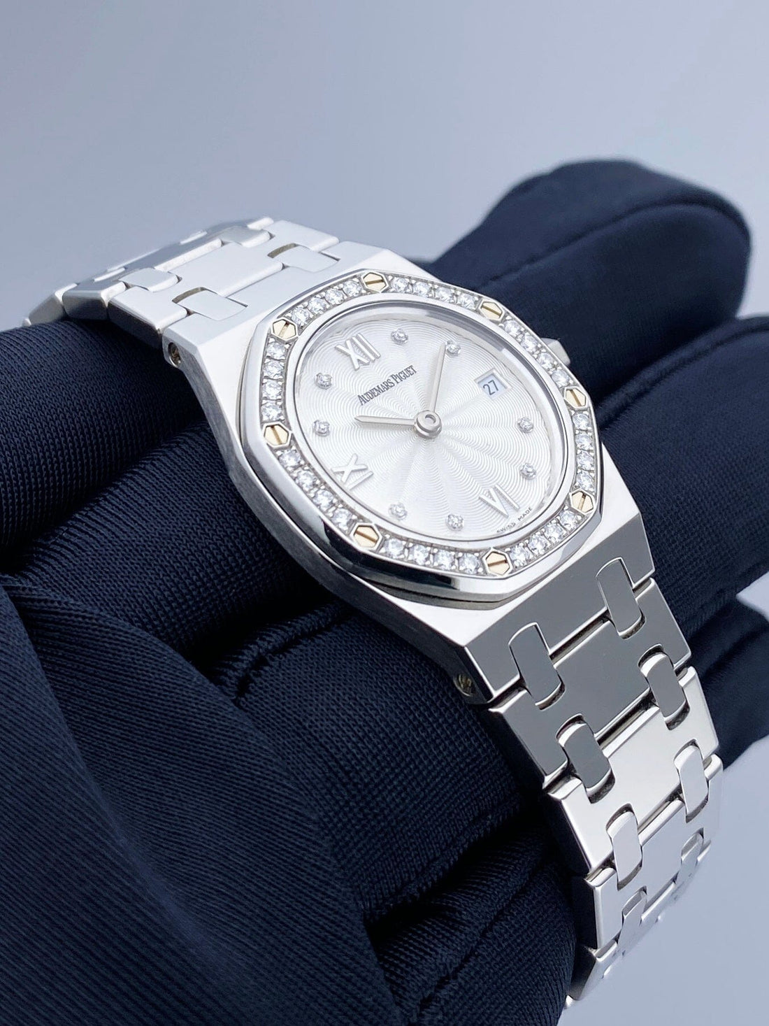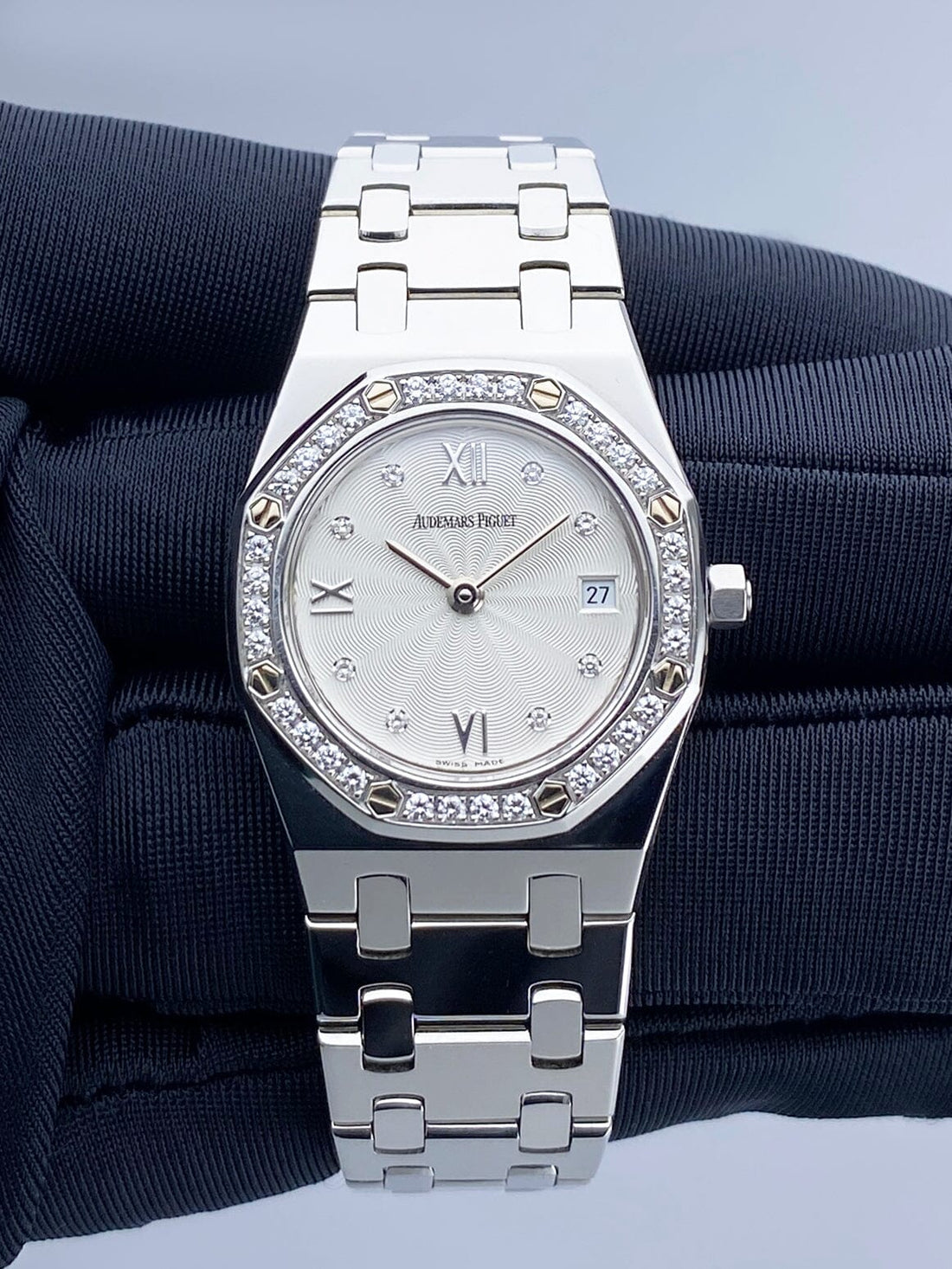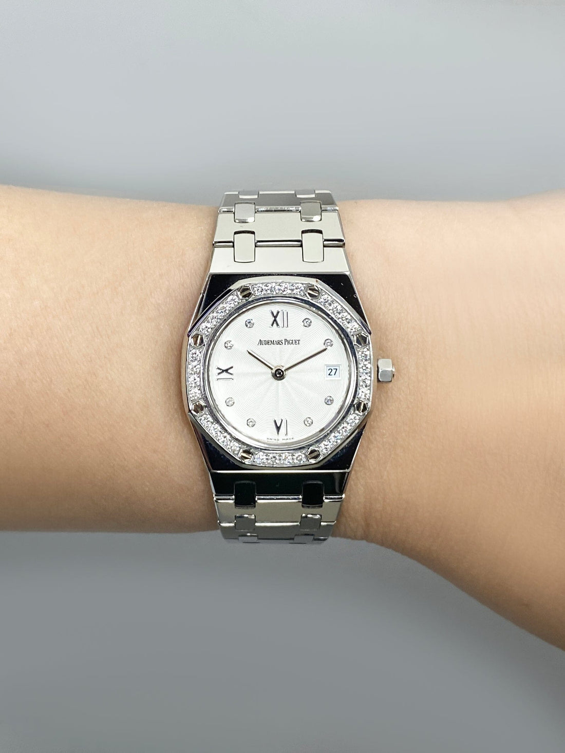 Audemars Piguet Royal Oak 67372ST Ladies Watch. 25mm stainless steel case. Stainless steel octagon shaped bezel with original factory diamond set insert. White dial with silver-tone hands and original factory diamond set & Roman numeral hour marker. Date display at 3 o'clock position. Stainless steel bracelet with stainless steel fold over clasp with single push button safety. Will fit up to 5.25-Inch wrist. Sapphire crystal. Stainless steel case back. Quartz: Battery powered movement.